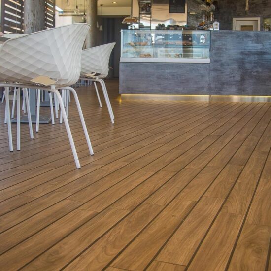 L’imitation bois dans les espaces intérieurs et extérieurs d’une terrasse avec vue sur la Méditerranée