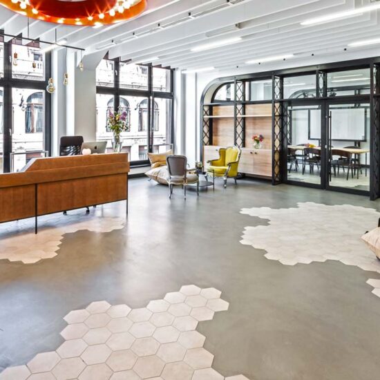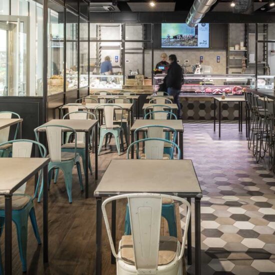 Mélange de grès imitation bois et carreaux de ciment Rewind pour un restaurant « à km 0 » au design original