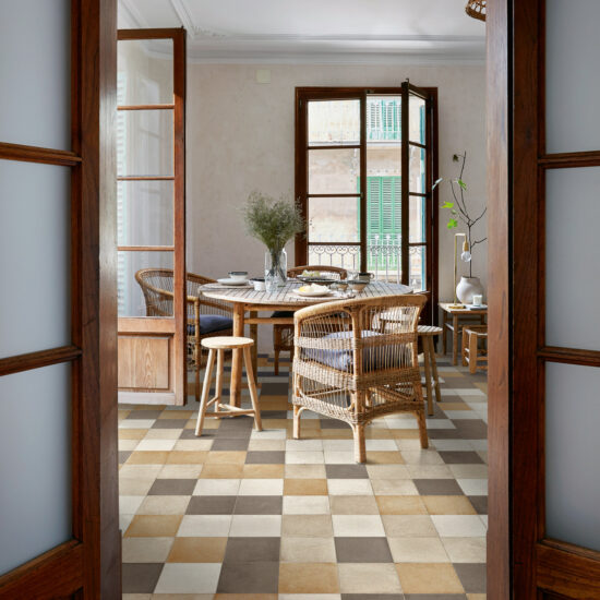 - Patina en format maxi 120×120 cm et Ottocento (décor choisi parmi les 8 solutions, dans une tonalité froide) en mélange pour différencier les différentes zones sur le sol : un grand open space peut être organisé avec des tapis décoratifs séparant la cuisine du salon.