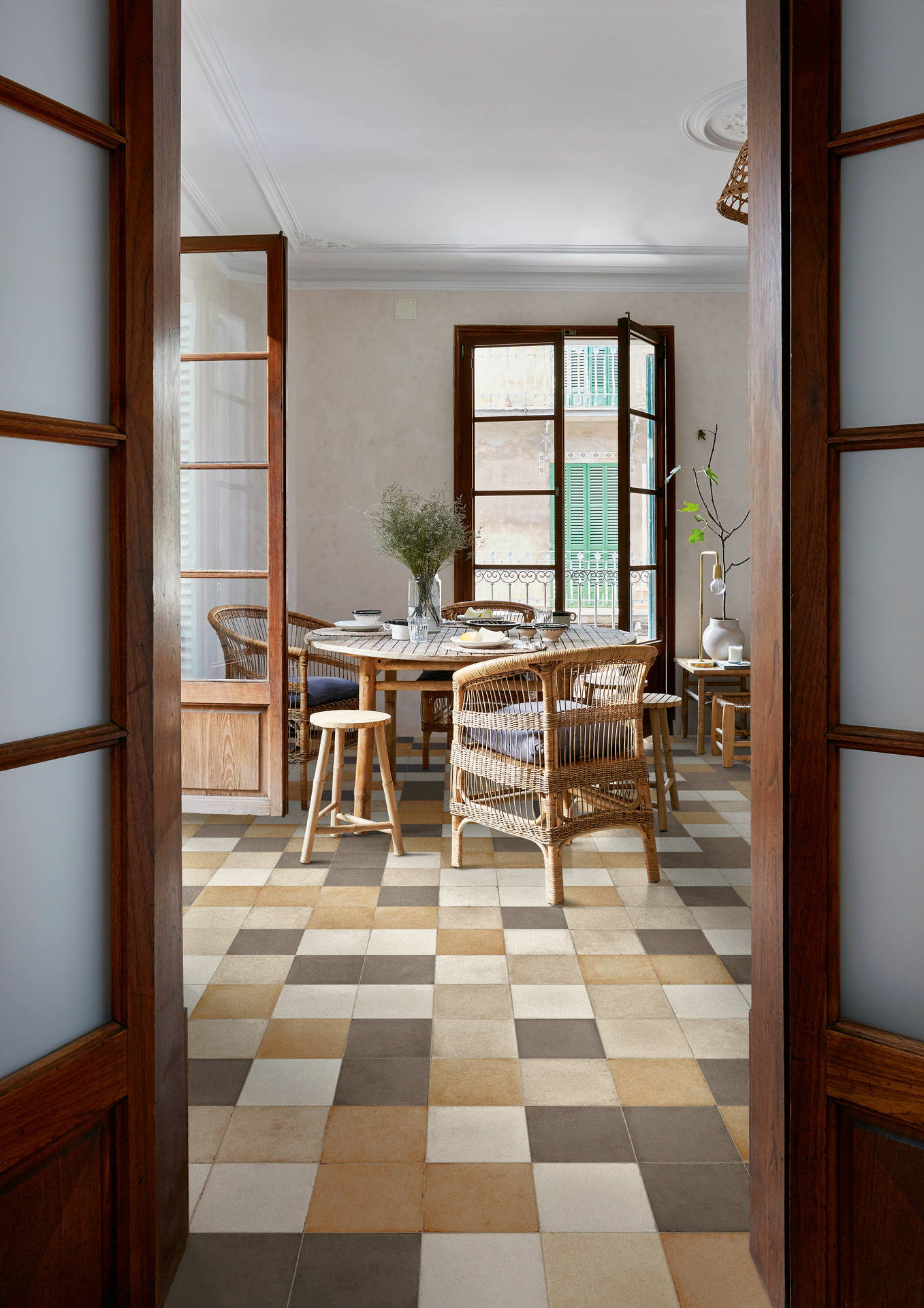 Deux collections avec un style apparemment très différent – carreaux de ciment vintage et imitation cire/surface chatoyante – ensemble dans la même pièce ? Peuvent-elles vraiment cohabiter en harmonie ? Pourquoi pas.