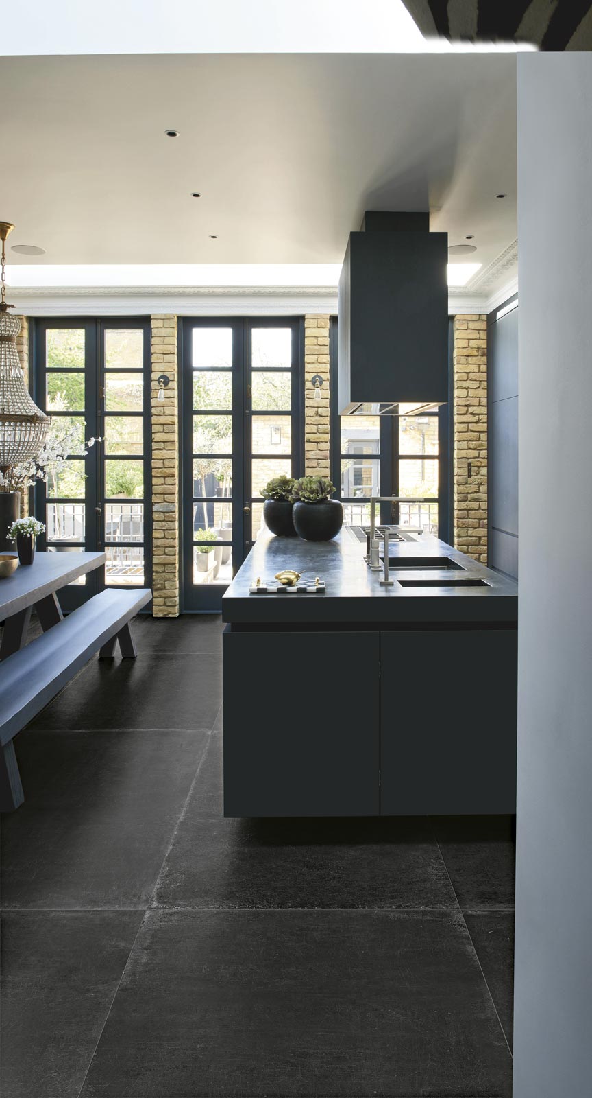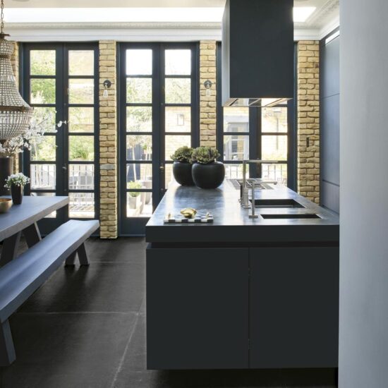 - Un projet plus complexe ? Ottocento (en version décorée appliquée en tapis tout autour de l'îlot) et Patina (en teinte unie) sur le sol + Ottocento (avec le même décor) sur l'îlot de la cuisine. Dans ce cas, le décor se concentre tout autour de l'îlot, véritable cœur de la cuisine.