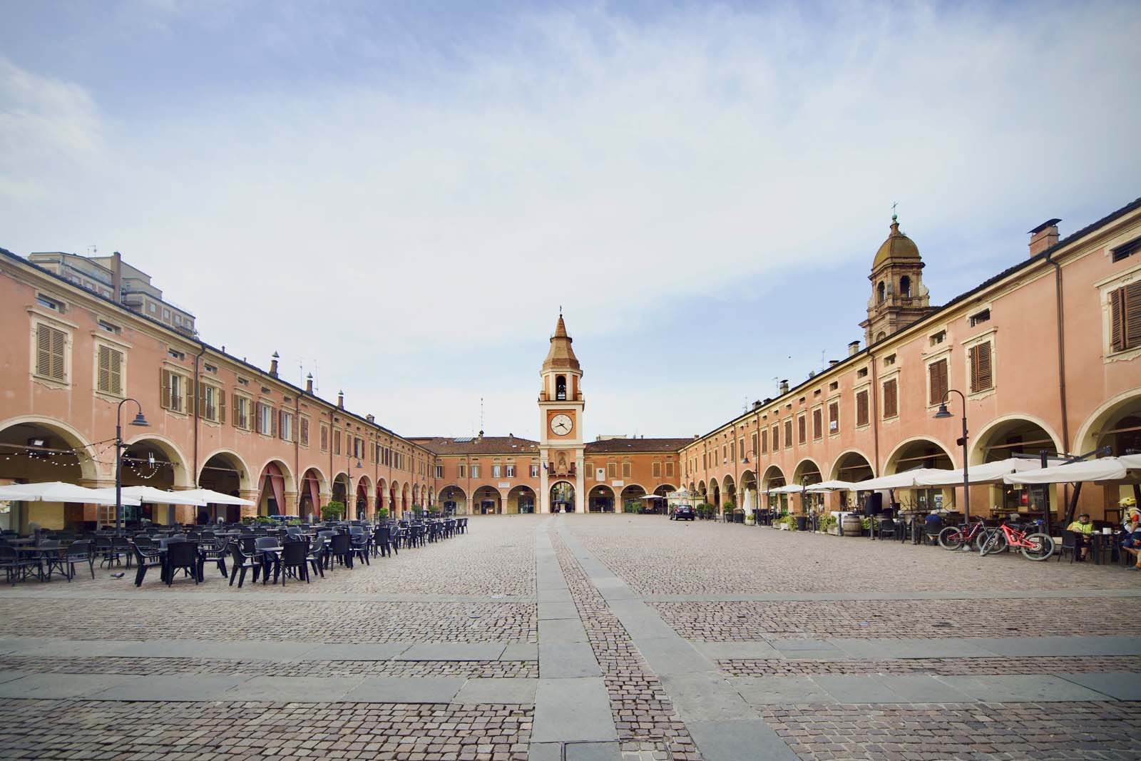 L’apparence actuelle de la Piazza remonte au XVIe siècle, lorsqu’Alessandro Pio lança sa construction en érigeant le « Palazzo della Ragione » et l’« Osteria della Posta » sur ses côtés. En 1676, François II d’Este confia à l’architecte ducal Antonio Loraghi la conception de la Tour Civique, connue localement sous le nom de « Campanone ». En 1696, un théâtre fut ajouté, restauré en 1775 par François III d’Este, qui chargea l’architecte Pietro Bezzi de donner à la Piazza une apparence plus homogène en la dotant de portiques encadrant l’espace.