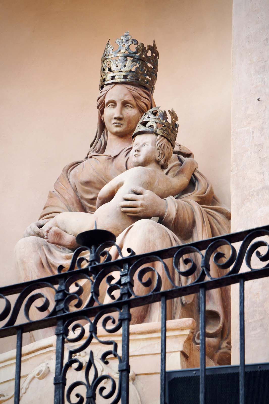 Le projet s’est concentré sur une conservation-restauration des façades et des éléments principaux. Le principal problème résidait dans une mauvaise gestion des eaux, qui provoquait des dégradations telles que des lessivages, des érosions et des dépôts de surface. Nous avons donc approfondi notre connaissance de l’édifice grâce à une analyse documentaire, des diagnostics et une étude de l’état de conservation, afin d’établir un tableau complet et fiable. Nous sommes ensuite intervenus en remplaçant les chéneaux et les gouttières pour une meilleure gestion des eaux. Les surfaces ont été nettoyées manuellement et mécaniquement afin de consolider les bases en grès et les angles sous les corniches en pierre. Une attention particulière a été portée au nettoyage et à la protection de la statue en terre cuite de la Vierge à l’Enfant, œuvre d’Antonio Pulci datant de 1792, ainsi que des quatre statues en marbre de Carrare, représentant les âges de la vie (enfance, adolescence, maturité et vieillesse), situées près de la chambre des cloches dans le tambour octogonal.