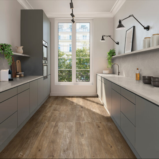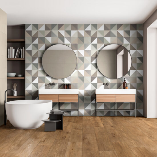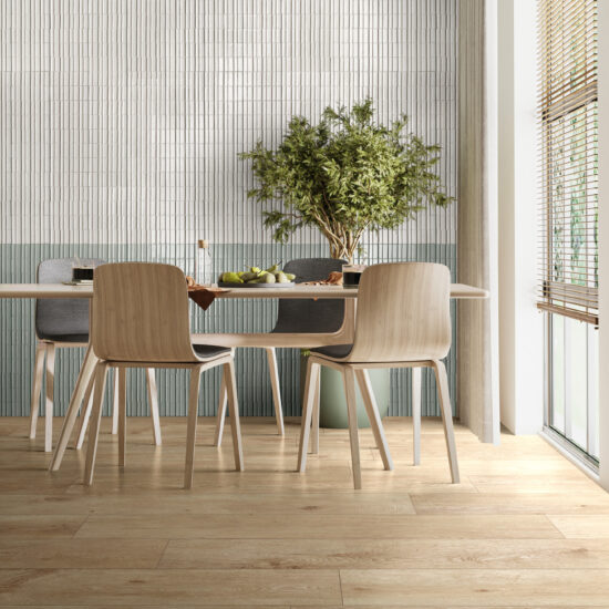 Grâce à sa très bonne conductivité thermique, le grès cérame effet bois se prête parfaitement aux systèmes de chauffage au sol, permettant de supprimer les radiateurs et donc de libérer de l’espace mural. Cela se traduit par une plus grande liberté d’agencement du mobilier et une utilisation plus fonctionnelle de l’espace, particulièrement avantageuse dans les petites salles de bain. Parallèlement, le grès cérame s’avère également idéal dans les espaces ouverts, où il contribue à maintenir une continuité visuelle fluide, tout en assurant une distinction claire entre les différentes zones fonctionnelles.