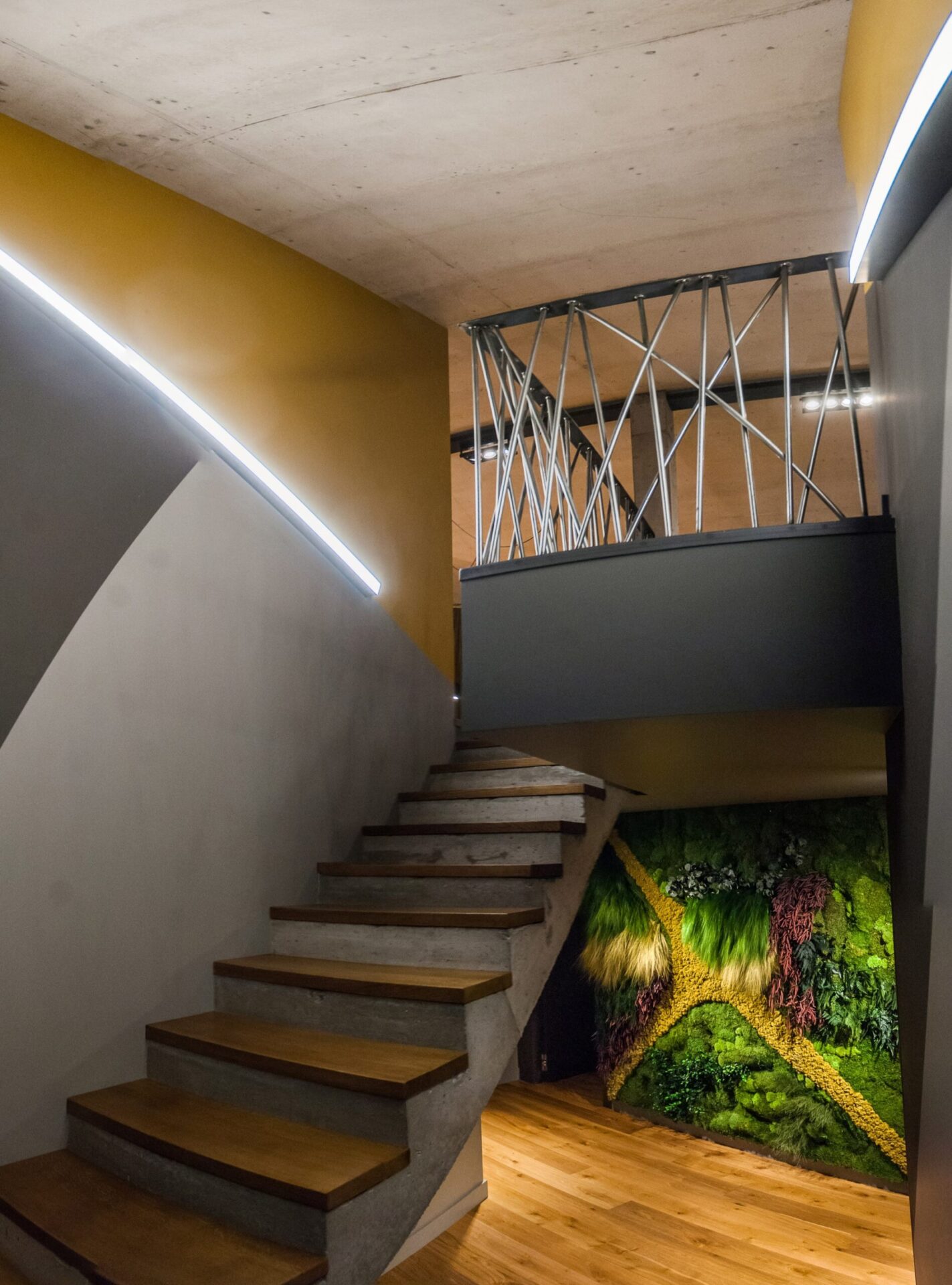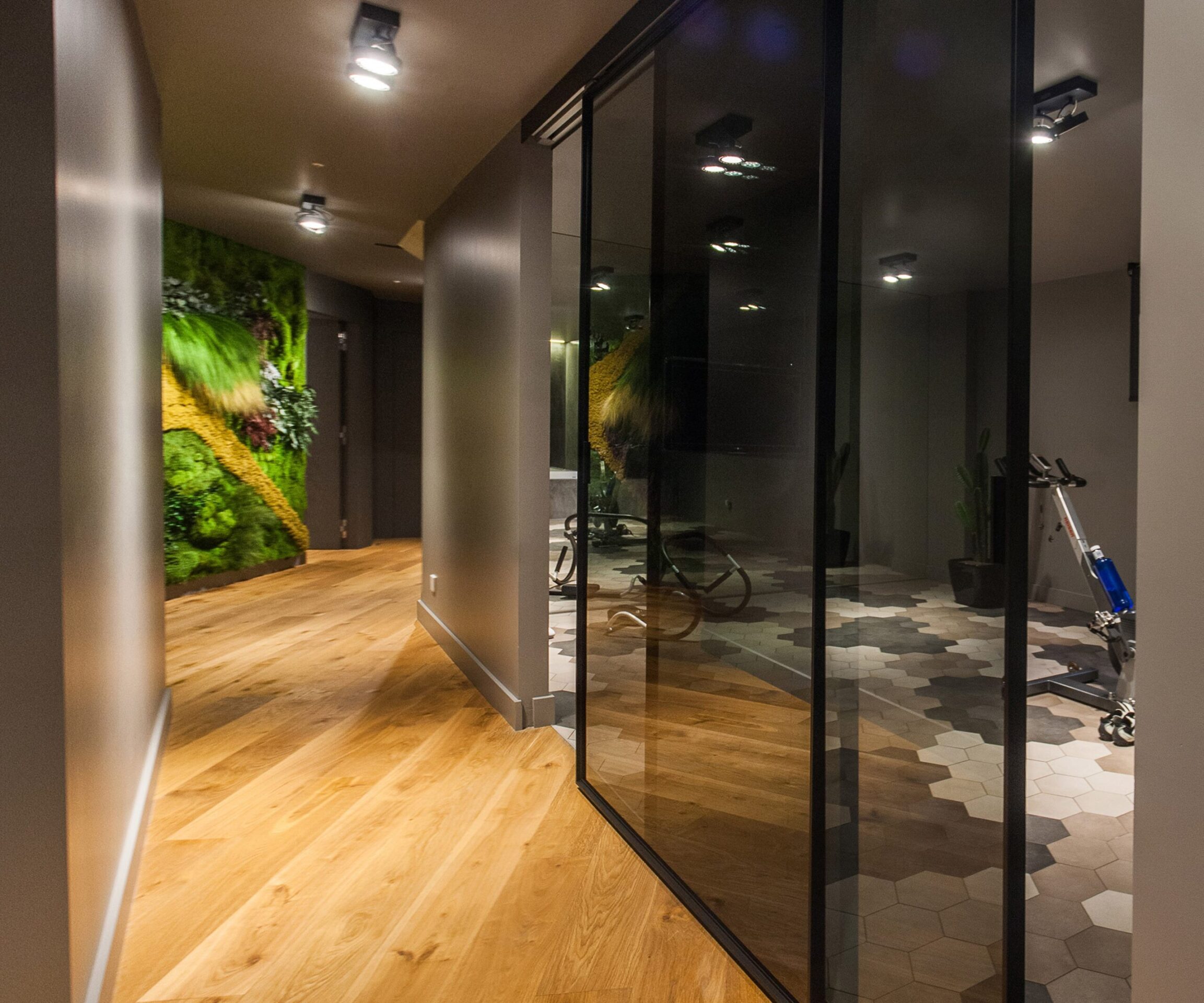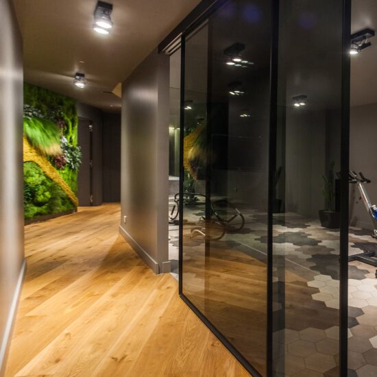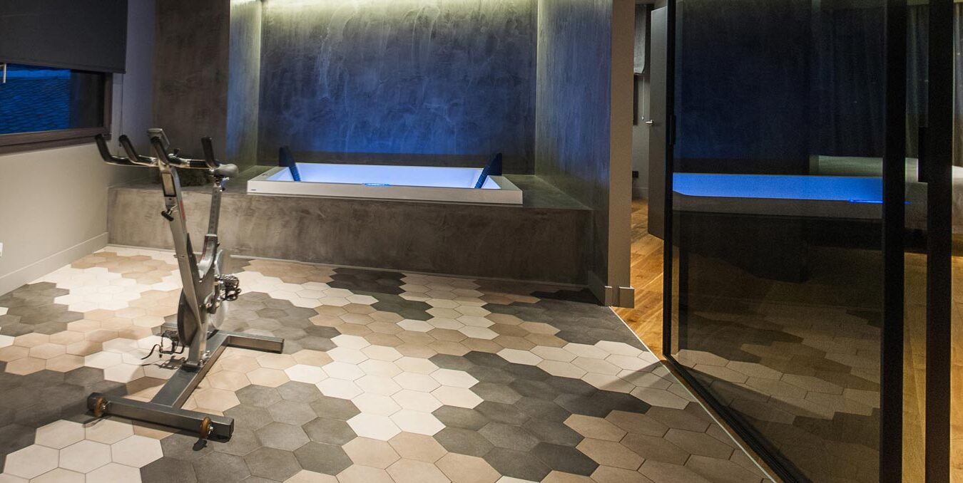 L'étage du bas abrite les espaces privés de la résidence, notamment une zone destinée aux soins du corps et à la détente. Une salle de sport et un espace bien-être occupent de nombreux mètres carrés de carrelage de sol : une alliance de bois et de grès qui imprime du mouvement et s'inscrit dans une perspective d'optimisation de l'espace.