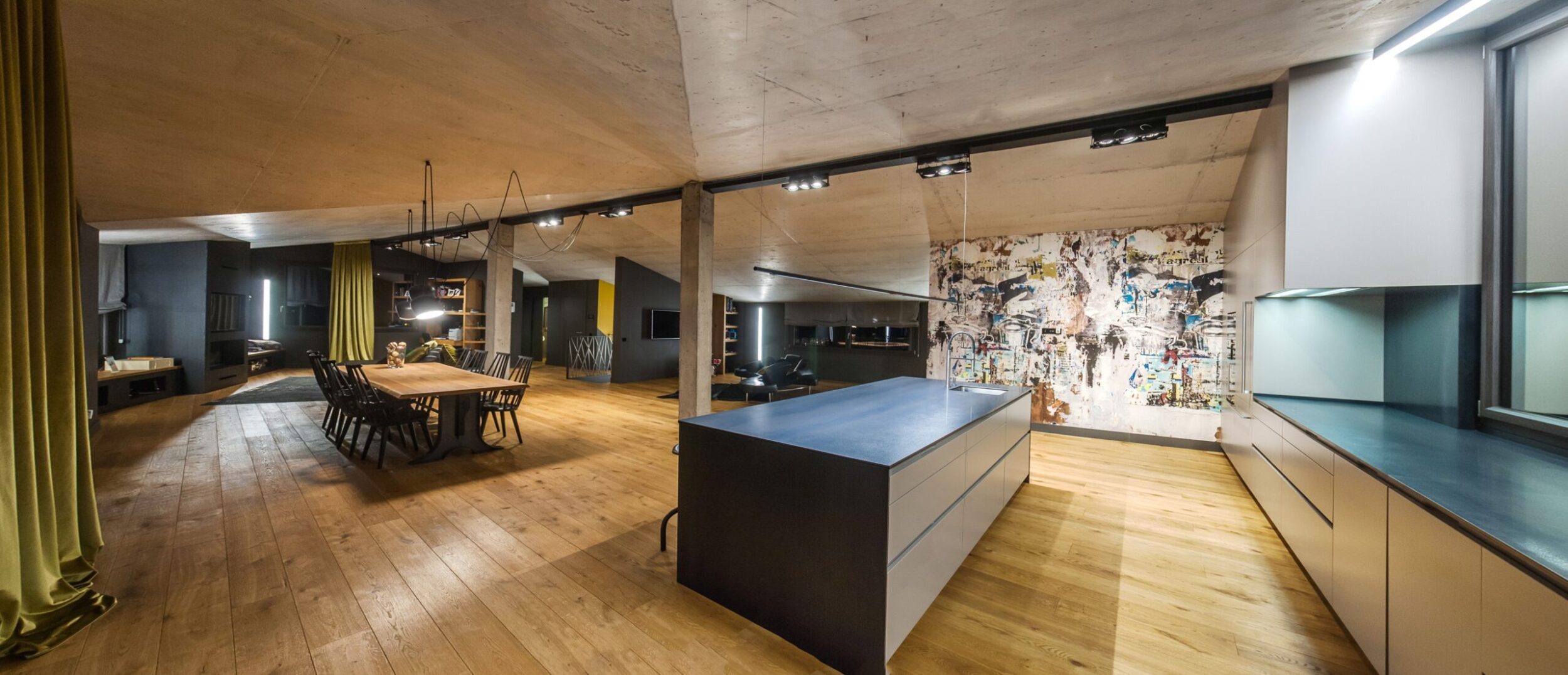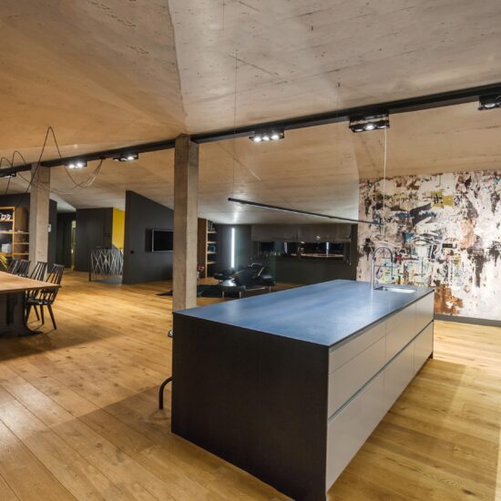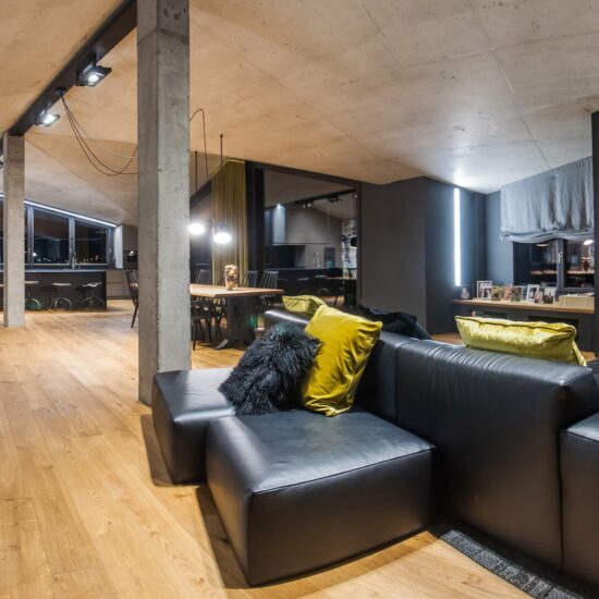 Enchâssé dans des murs solides et épais, qui confèrent chaleur et protection, l’intérieur de la maison est en symbiose avec un extérieur fait de montagnes et de forêts, à vivre et à explorer.