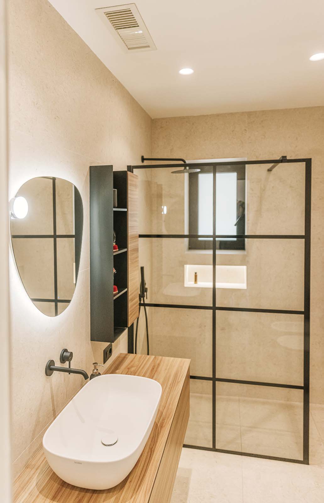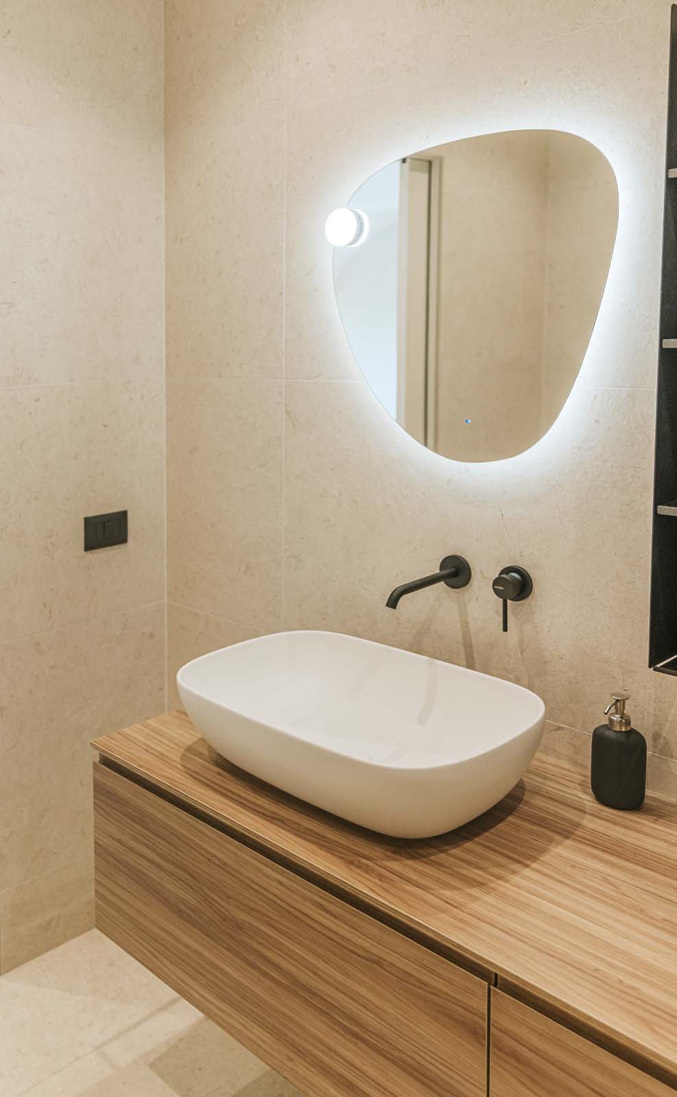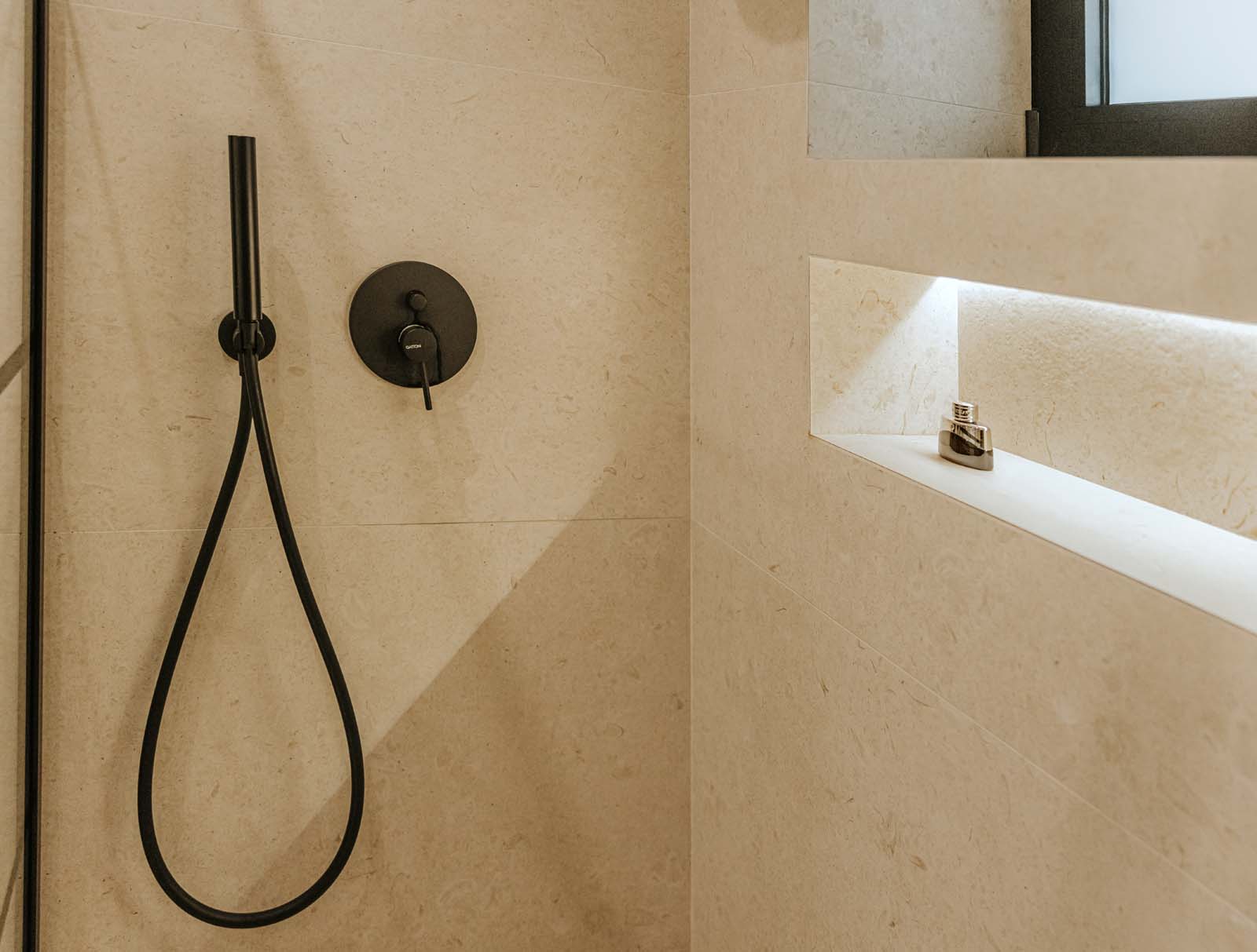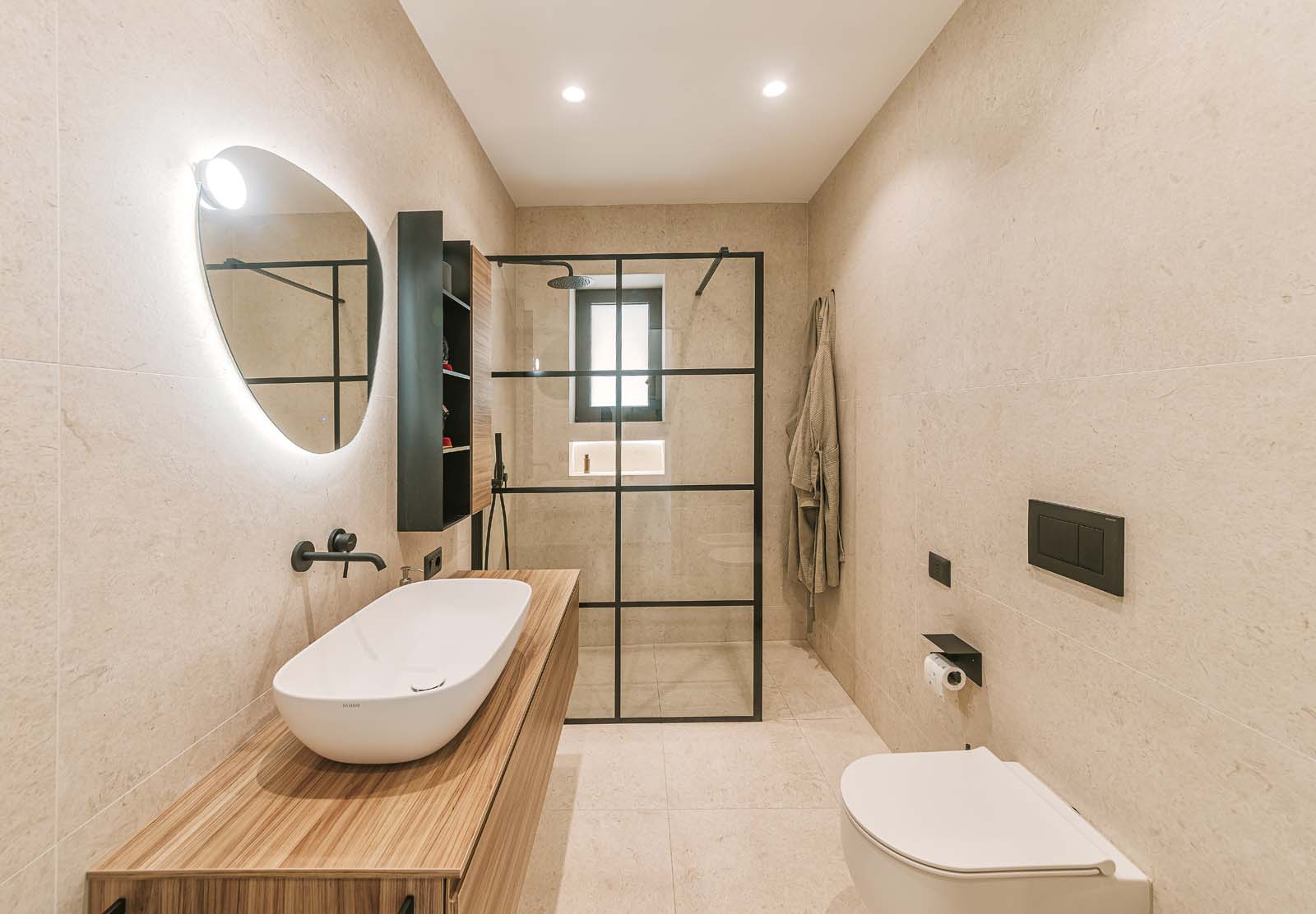 Dans la salle de bains, le grès cérame imitation pierre Eterna se déploie également aux murs, créant une atmosphère enveloppante de pure élégance. Les détails noirs des meubles et des finitions soulignent l’harmonie générale de l’espace, tout à la fois élégant et accueillant.