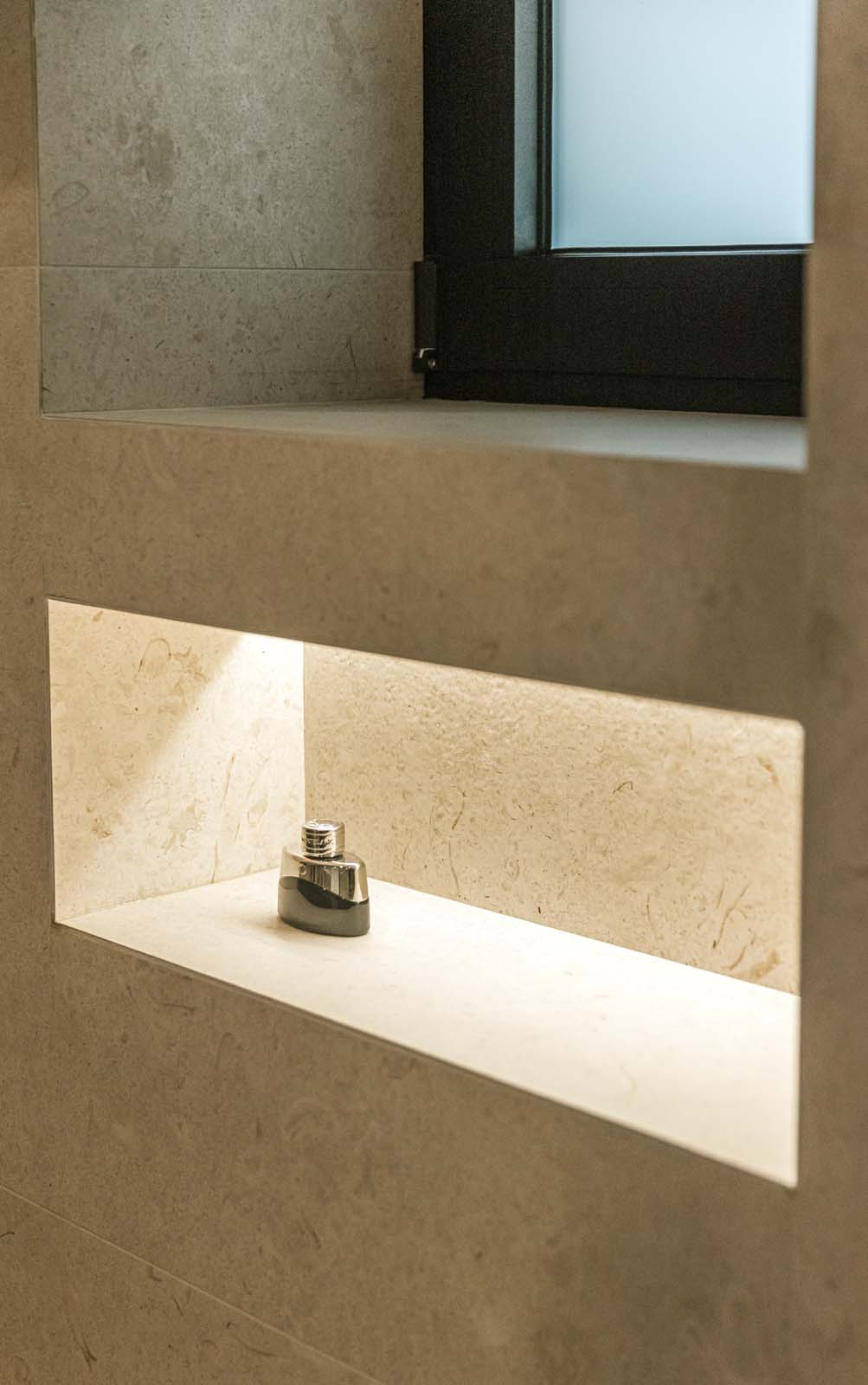 Utilisée au format 60×60 cm pour les sols de toute la maison et au format 60×120 cm pour les murs de la salle de bains, la collection Eterna a été choisie pour créer un élégant parcours chromatique, partant du blanc de l’enduit du mur jusqu’au noir de l’ameublement, en passant par une riche gamme de tons neutres et naturels.