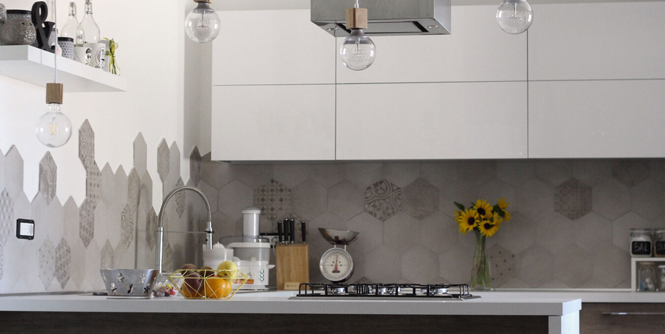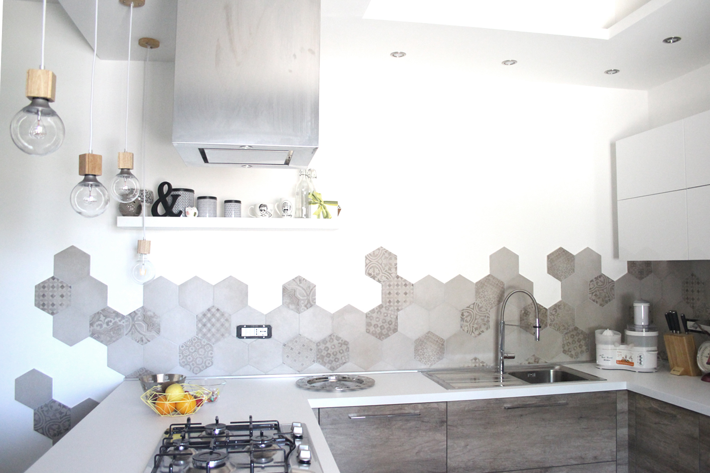 La pose des carreaux hexagonaux de manière irrégulière peut rendre une cuisine moderne très élégante : le projet d'une maison à Latina