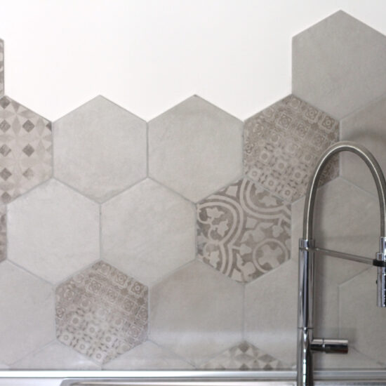 La collection choisie, Rewind, a offert au projet une infinité d'options d'alternances entre des carreaux monochromes et des carreaux décorés de motifs géométriques, l'idéal pour obtenir l'effet désiré : le design, personnalisé par des spécialistes, exalte l’imitation ciment de Rewind, qui propose plusieurs formats – de 60×120 cm à 7×28 cm – en sus du format hexagonal utilisé pour ce projet.