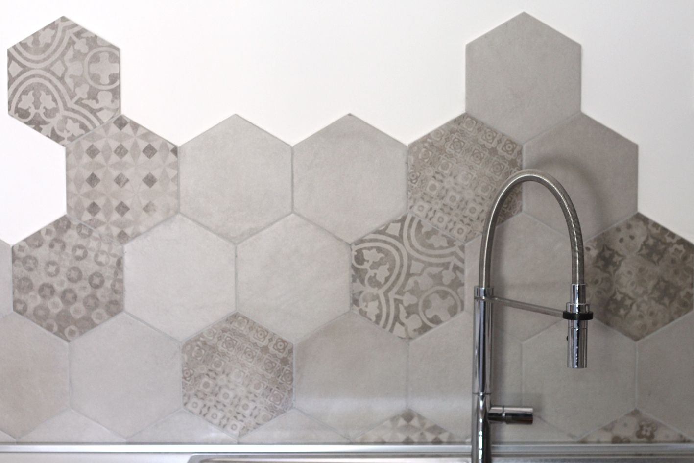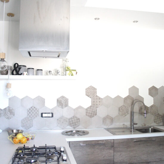 La nuance choisie, en outre, un gris clair et poussiéreux (Vanille), se marie harmonieusement au sol (toujours en grès imitation ciment mais au format 60×60 cm), et crée un contraste léger et élégant avec le blanc des meubles suspendus et le plan de la cuisine. Un contraste se crée aussi entre les styles, le modernisme minimaliste de la cuisine et le léger vintage du décor typique des carreaux de ciment.