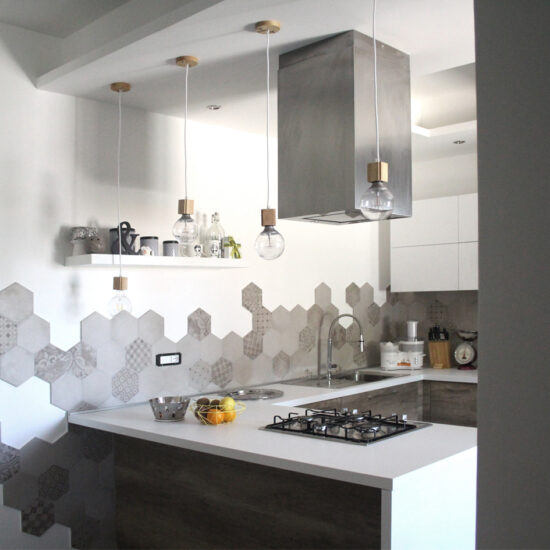 La cuisine, insérée désormais dans la zone de vie open space, présente une disposition en « C » avec un mur à demi couvert par des meubles suspendus et un mur découvert, sur lequel il y avait une liberté de composition maximale. Cela a permis de poser les carreaux régulièrement dans le premier cas, et de jouer de manière plus imaginative dans le second : en les posant progressivement de manière apparemment aléatoire, les petits hexagones ont recouvert de cette façon le mur derrière l'évier, en dépassant le plan de travail et se terminant de manière irrégulière.