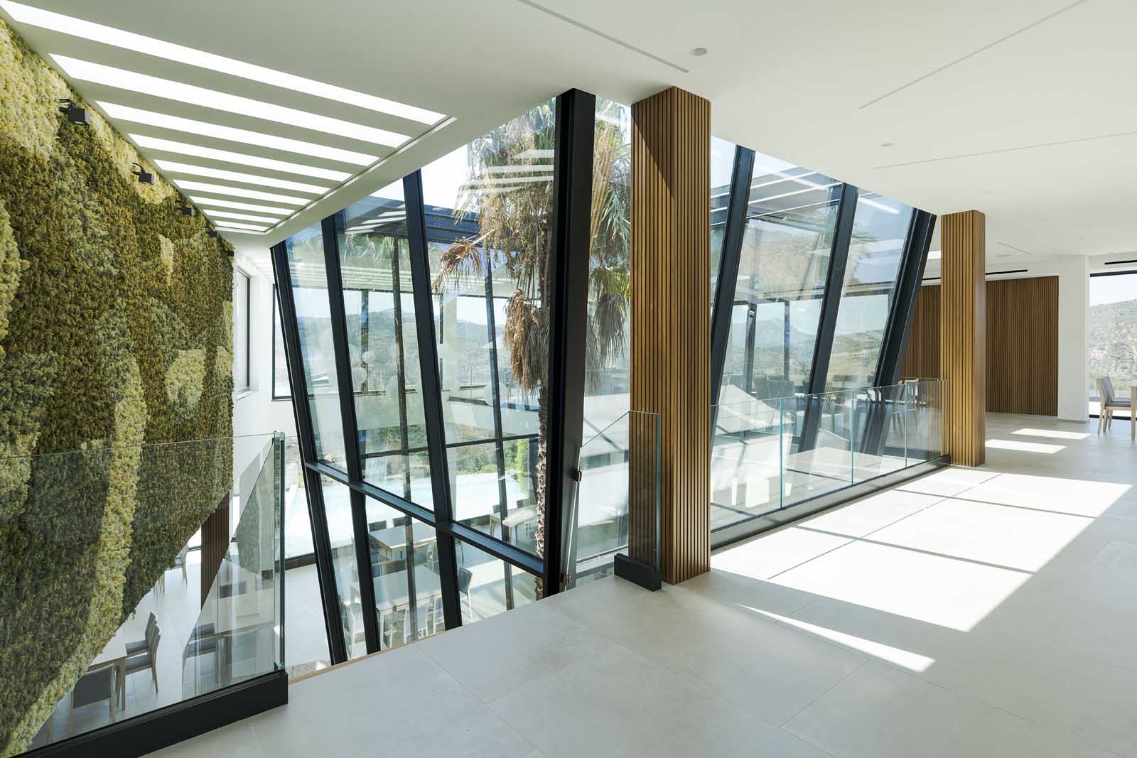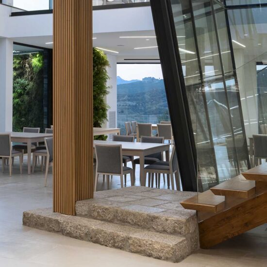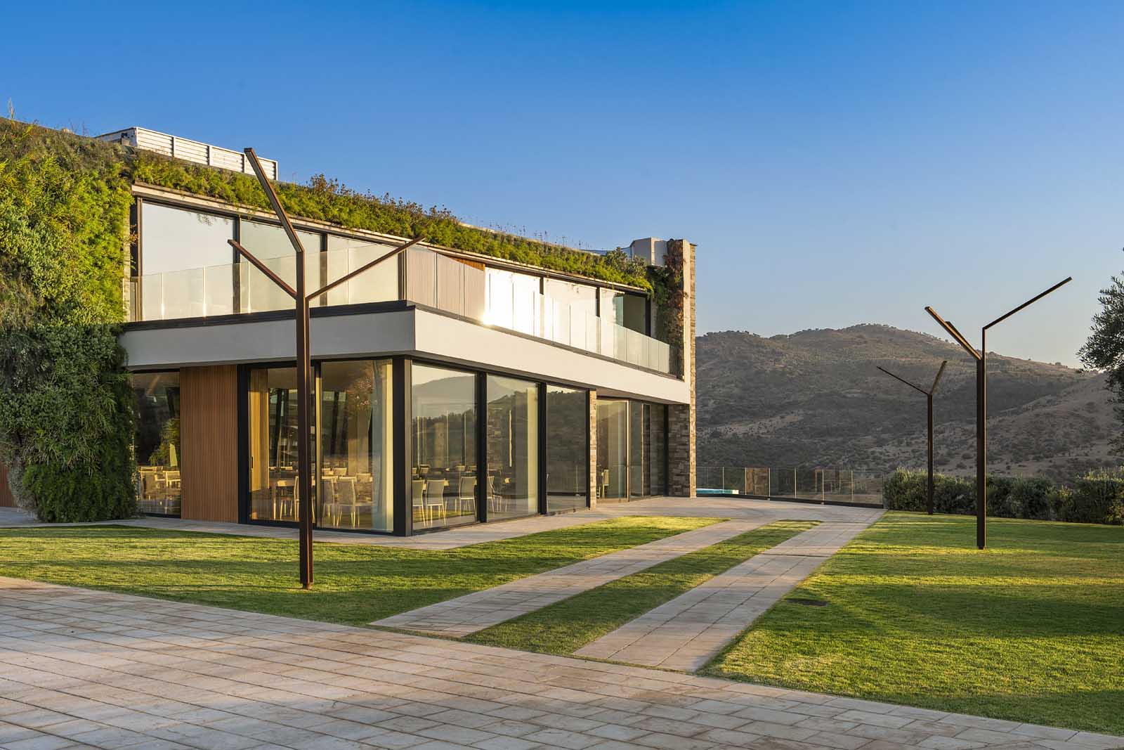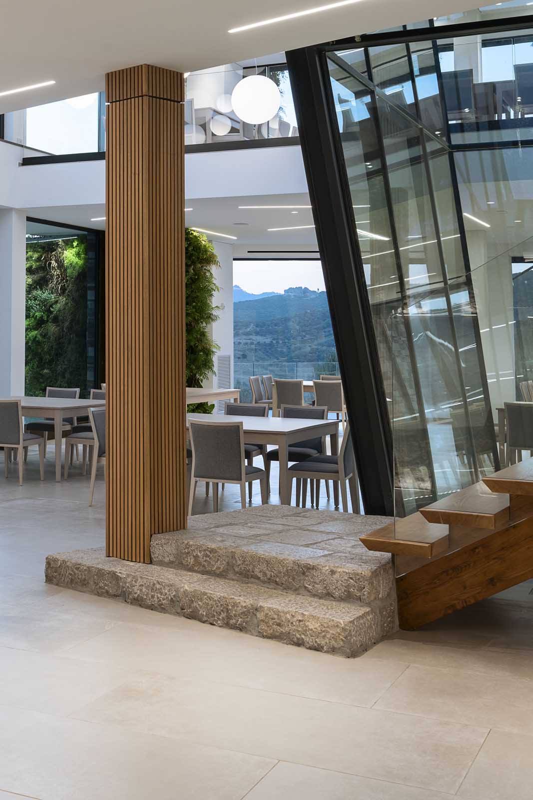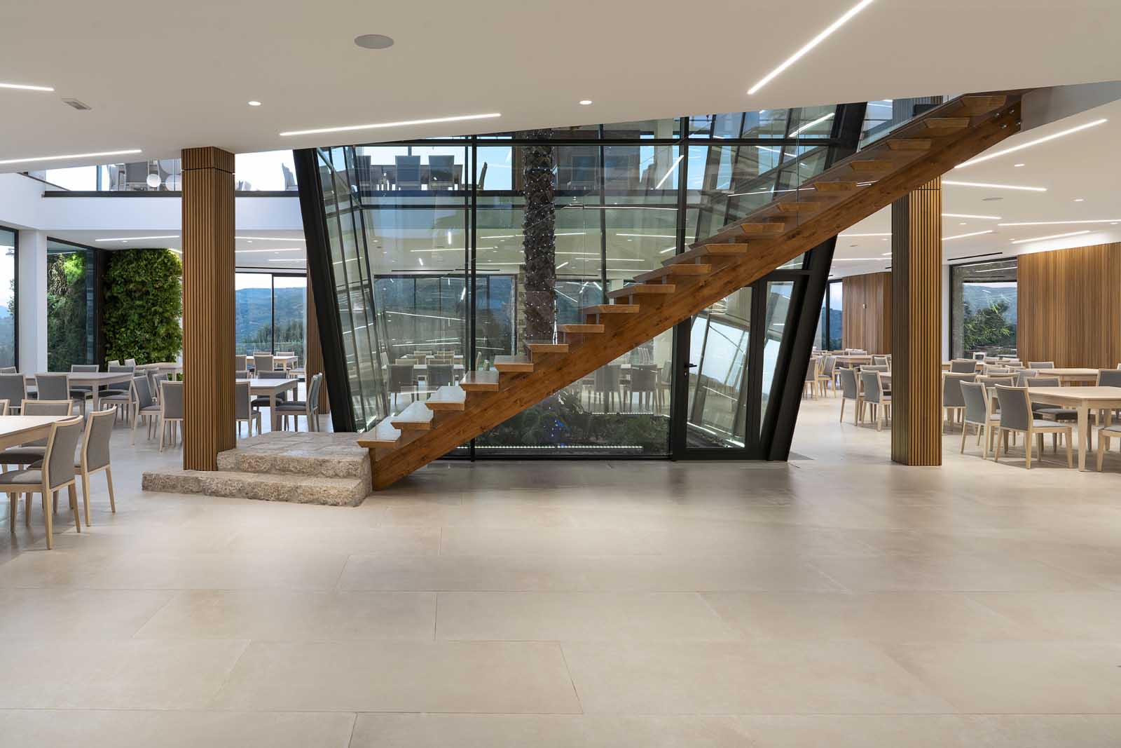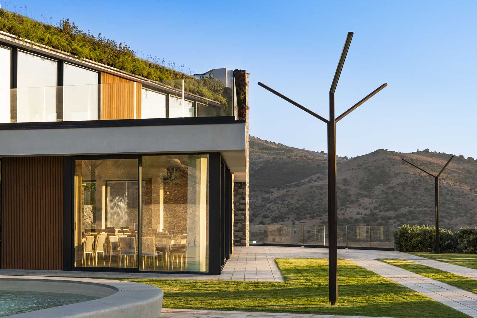 Le complexe se compose de deux bâtiments principaux, l’un destiné à accueillir des événements et l’autre des bureaux. L’agrandissement du complexe comprend un nouveau volume en forme de trapèze, qui abrite la salle principale au rez-de-chaussée, et un trapèze rectangulaire qui relie le nouveau bâtiment à l’existant. Le grand escalier et la piscine à débordement donnant sur la vallée ajoutent une touche scénographique à la structure. Au centre de la salle se dresse une pyramide vitrée, avec un arbre servant d’ancrage visuel et symbolique au projet.