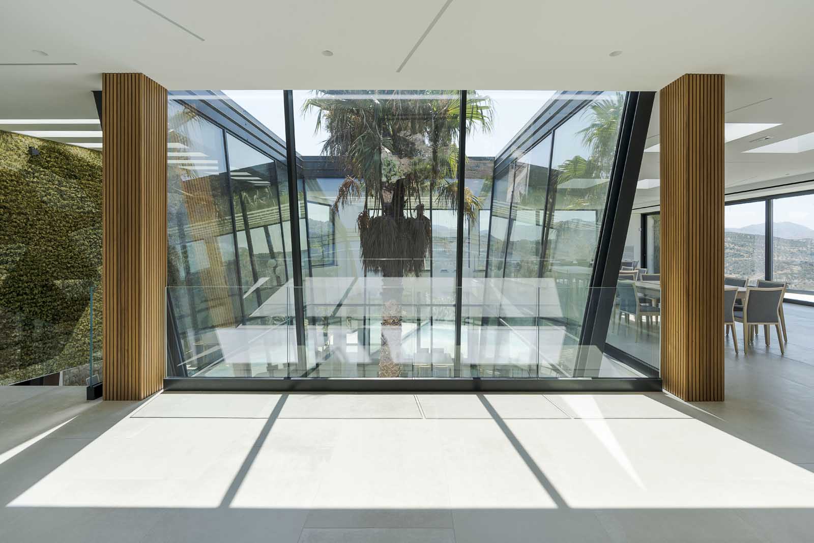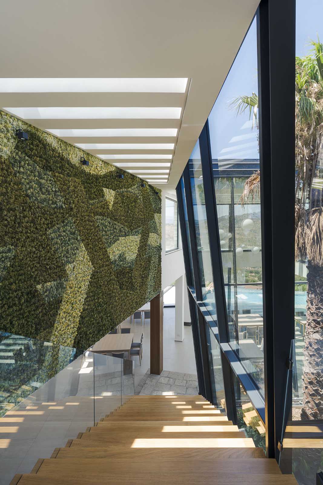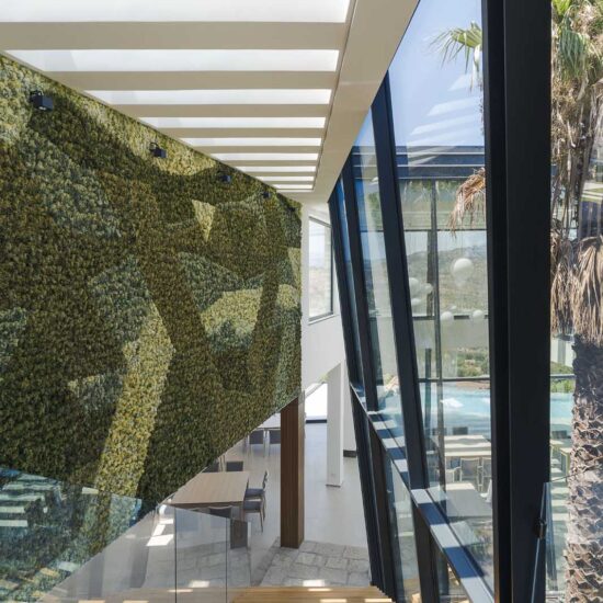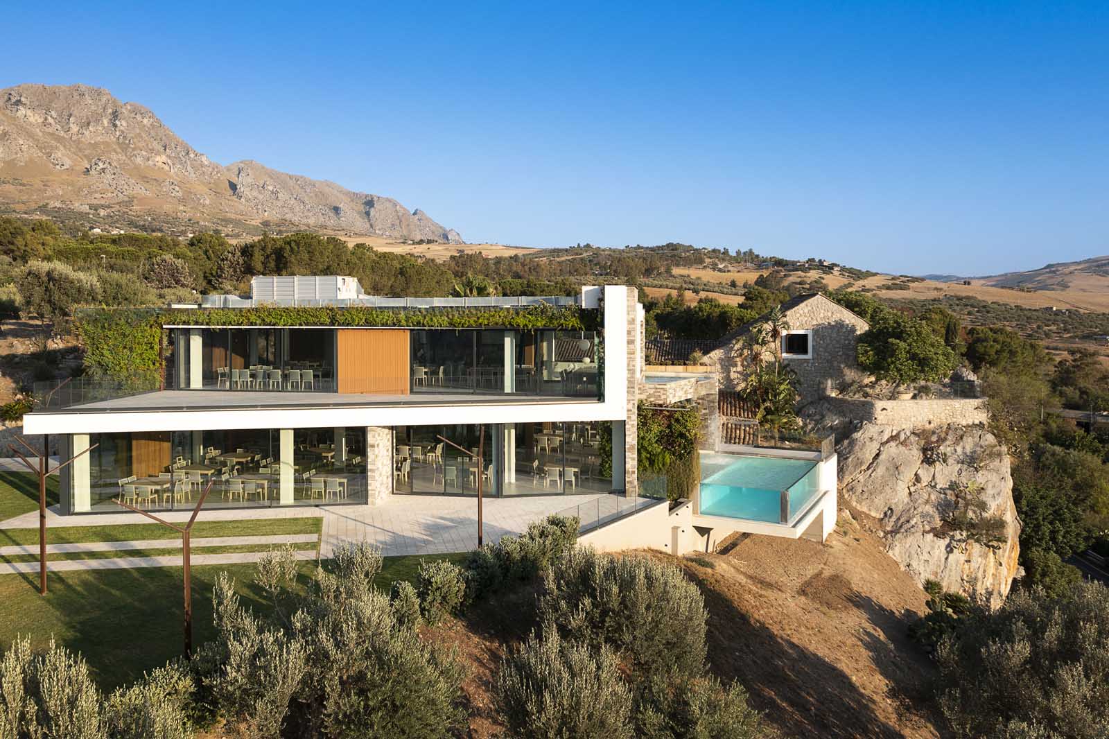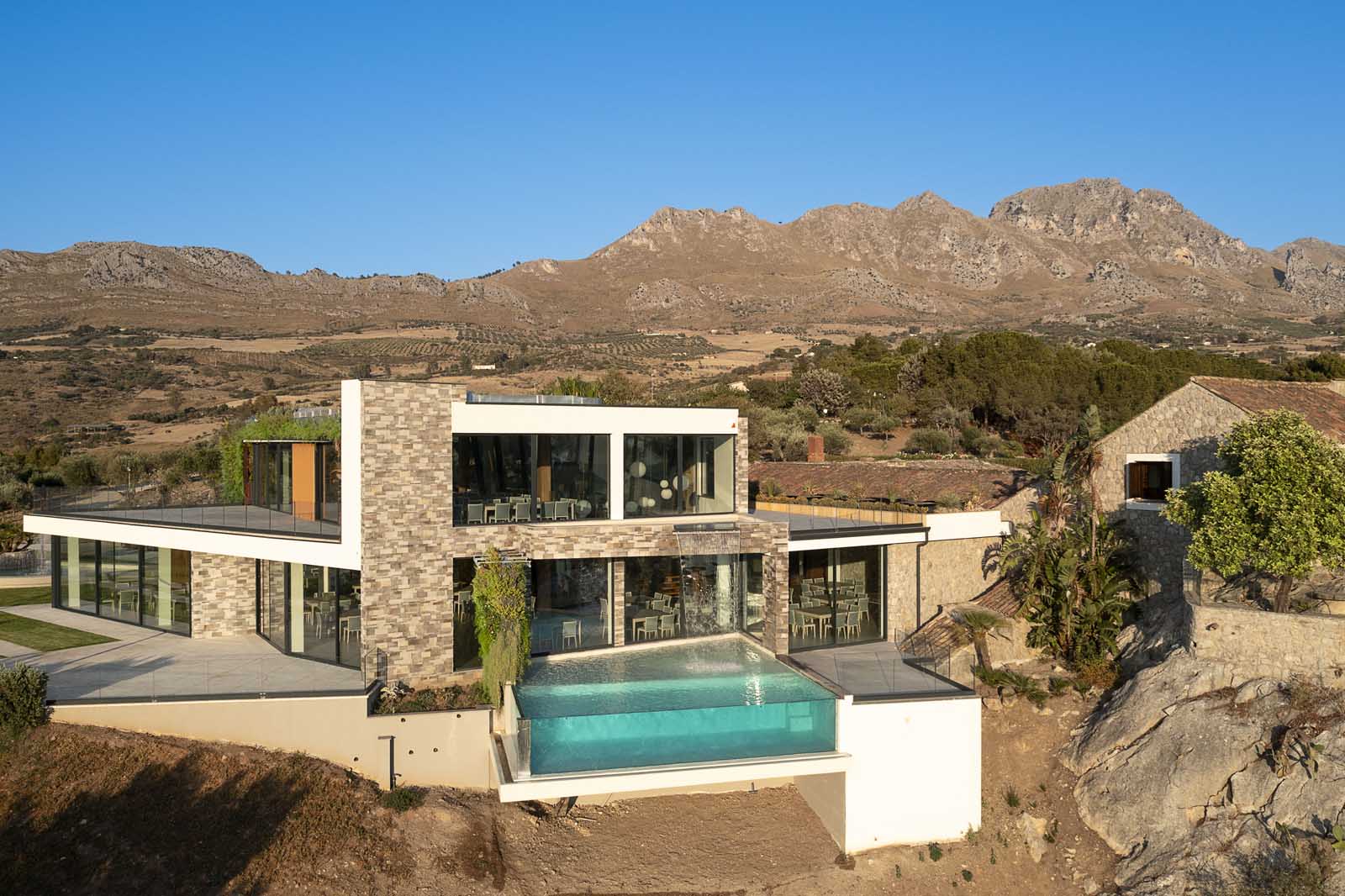 Le complexe se compose de deux bâtiments principaux, l’un destiné à accueillir des événements et l’autre des bureaux. L’agrandissement du complexe comprend un nouveau volume en forme de trapèze, qui abrite la salle principale au rez-de-chaussée, et un trapèze rectangulaire qui relie le nouveau bâtiment à l’existant. Le grand escalier et la piscine à débordement donnant sur la vallée ajoutent une touche scénographique à la structure. Au centre de la salle se dresse une pyramide vitrée, avec un arbre servant d’ancrage visuel et symbolique au projet.