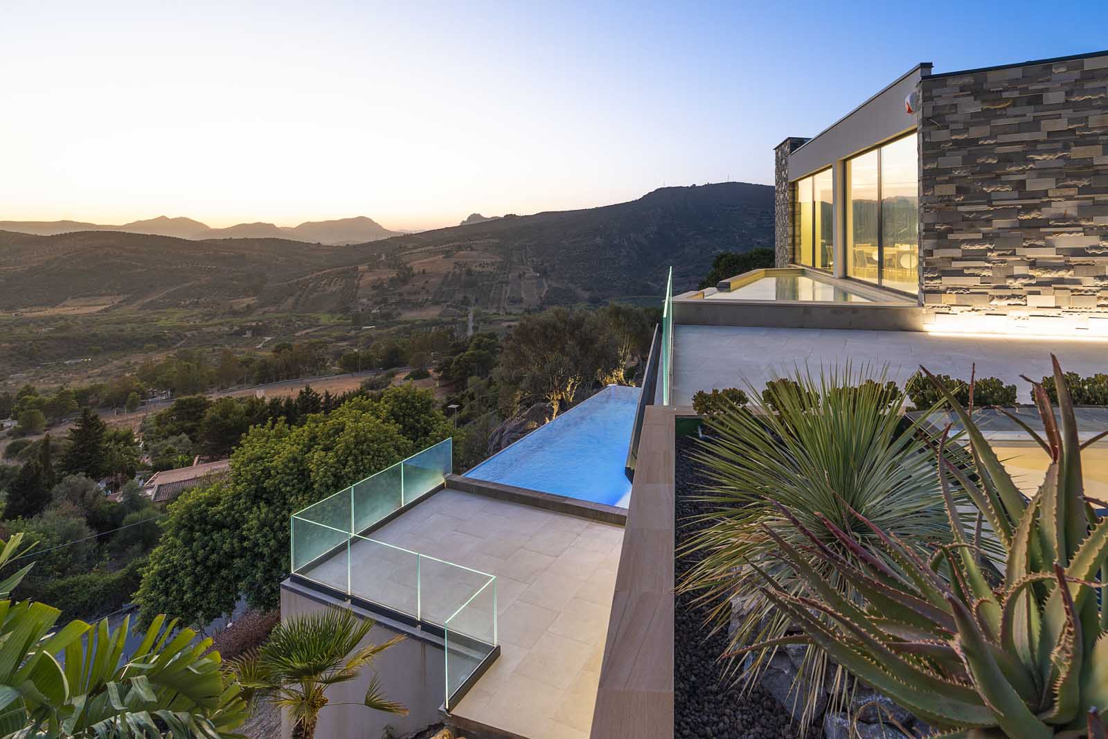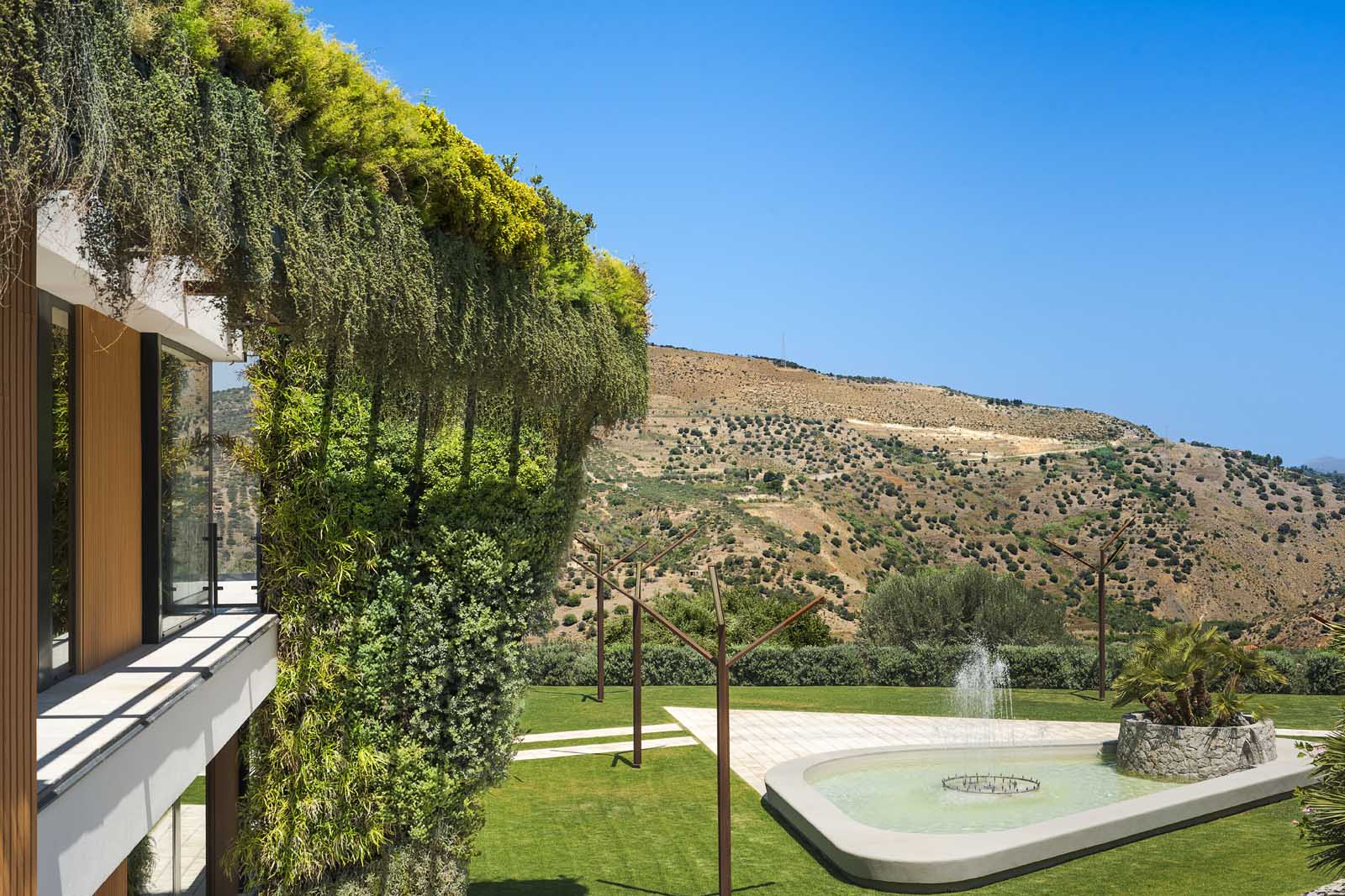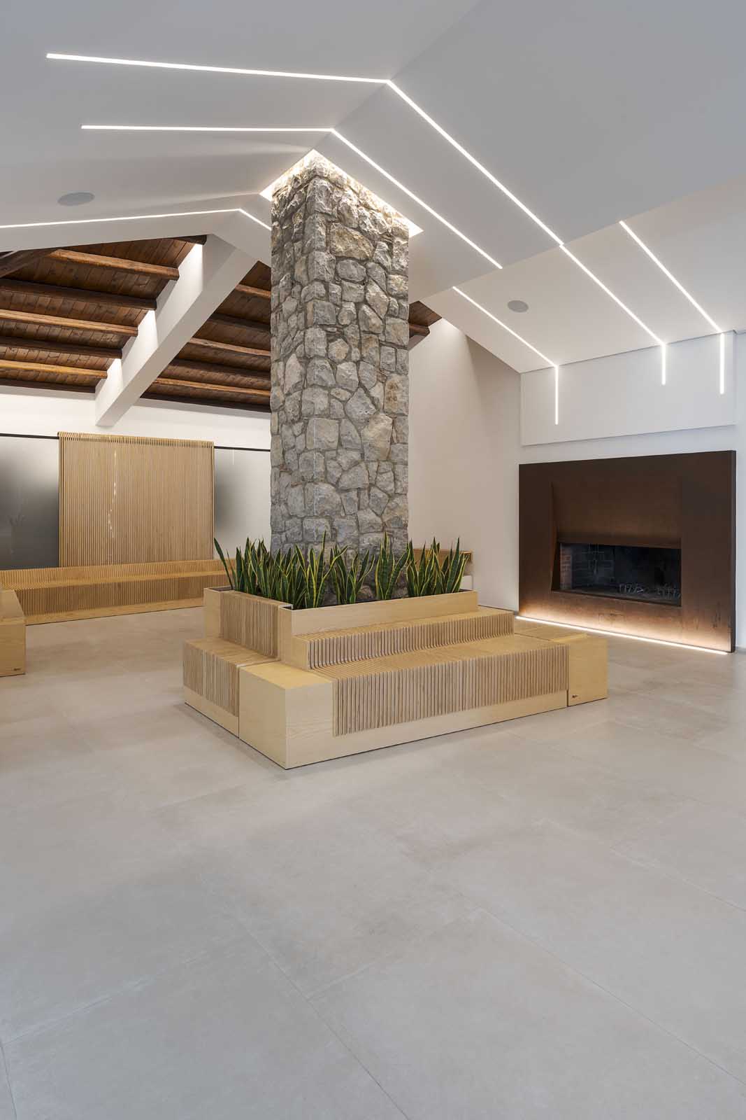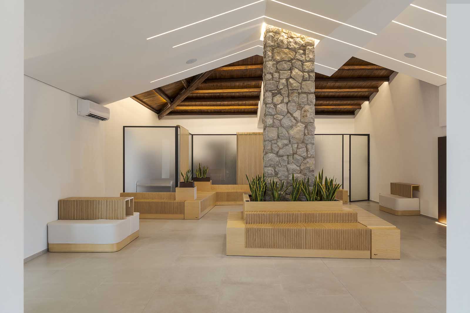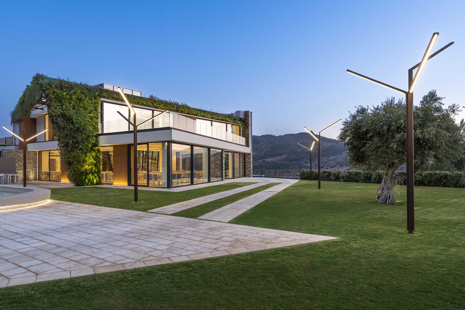 Le complexe se compose de deux bâtiments principaux, l’un destiné à accueillir des événements et l’autre des bureaux. L’agrandissement du complexe comprend un nouveau volume en forme de trapèze, qui abrite la salle principale au rez-de-chaussée, et un trapèze rectangulaire qui relie le nouveau bâtiment à l’existant. Le grand escalier et la piscine à débordement donnant sur la vallée ajoutent une touche scénographique à la structure. Au centre de la salle se dresse une pyramide vitrée, avec un arbre servant d’ancrage visuel et symbolique au projet.