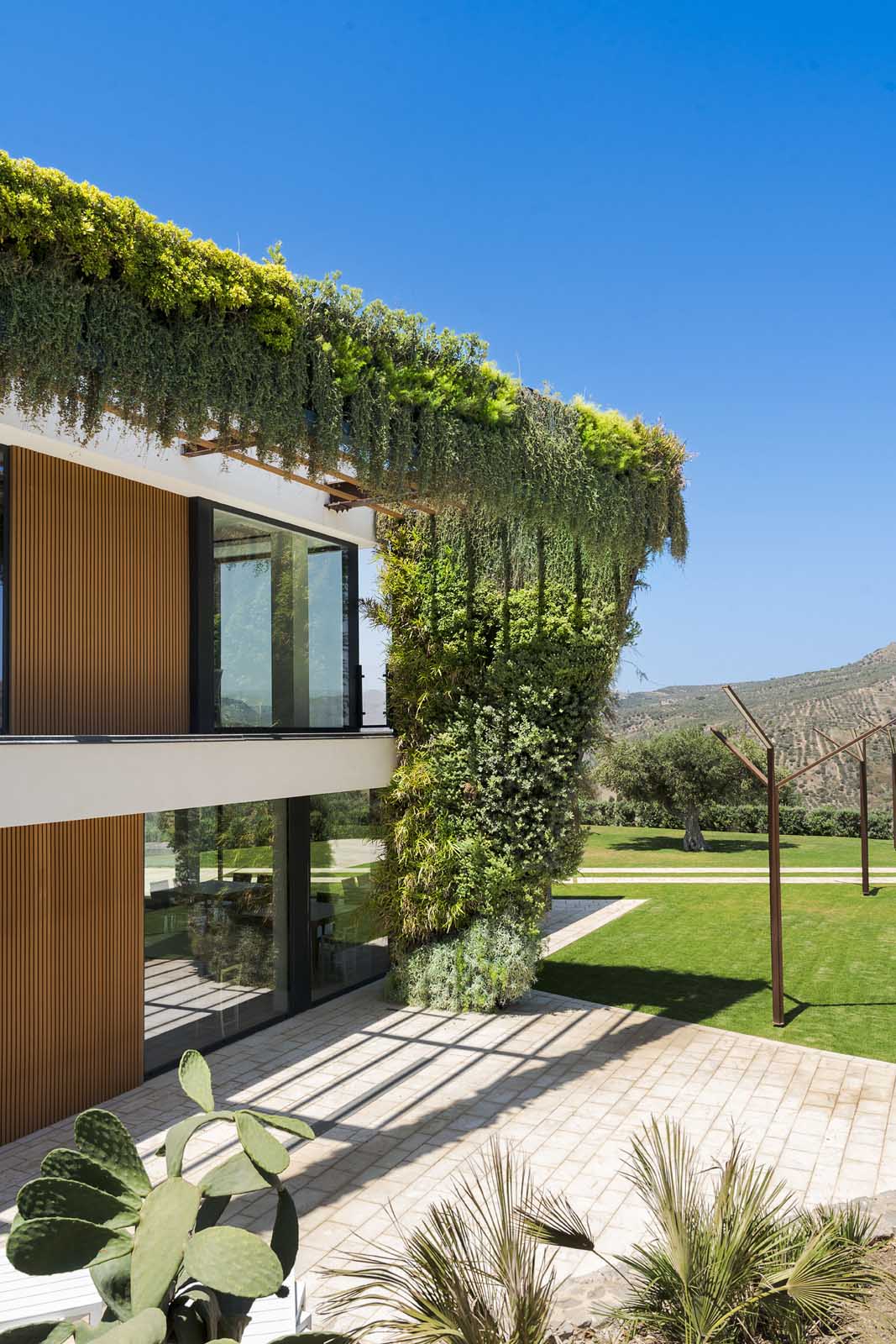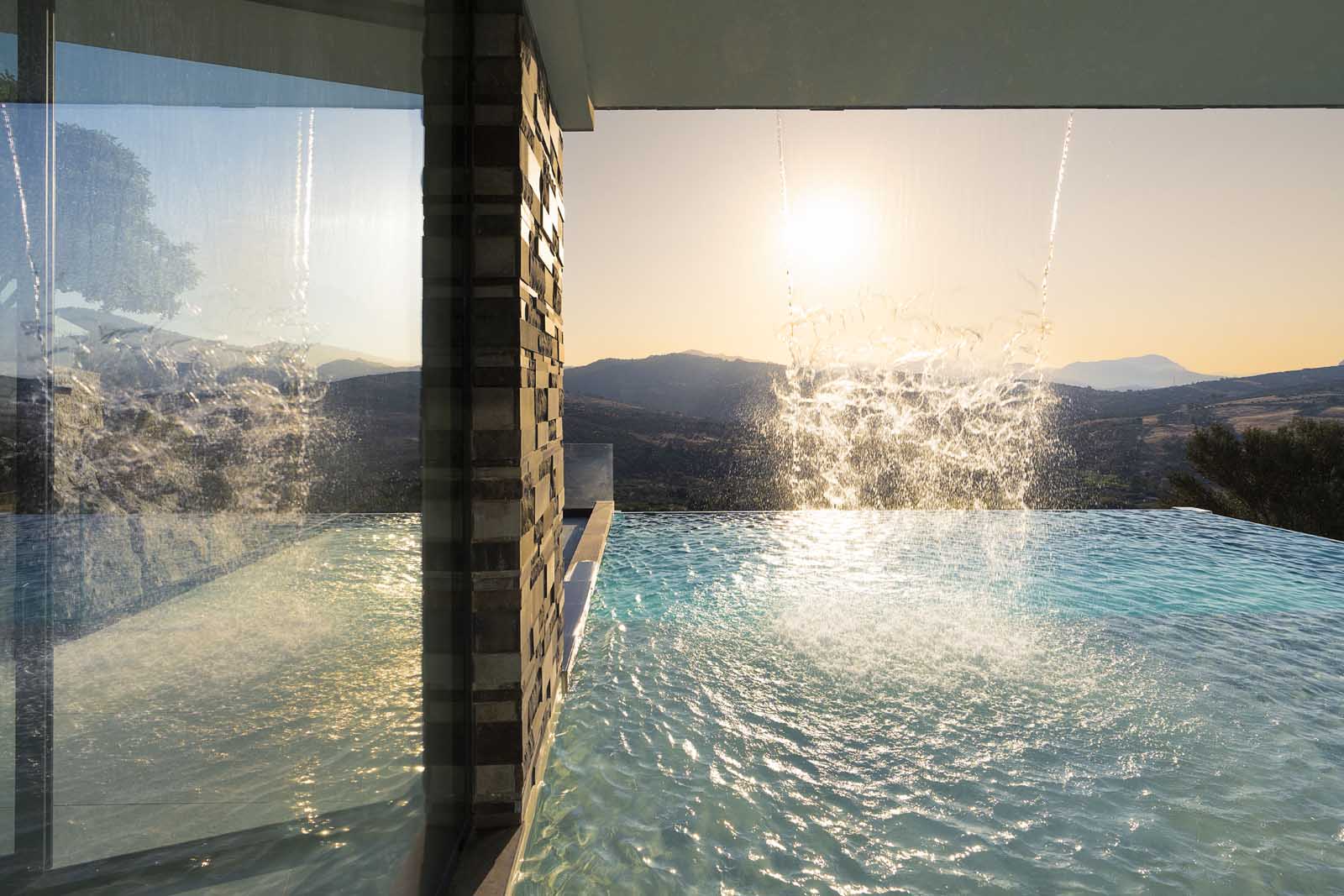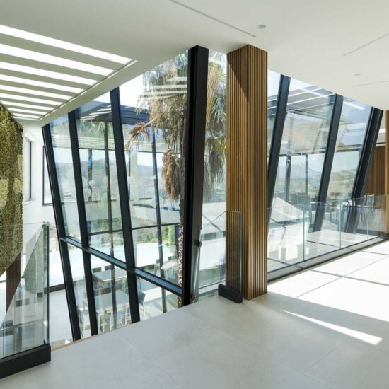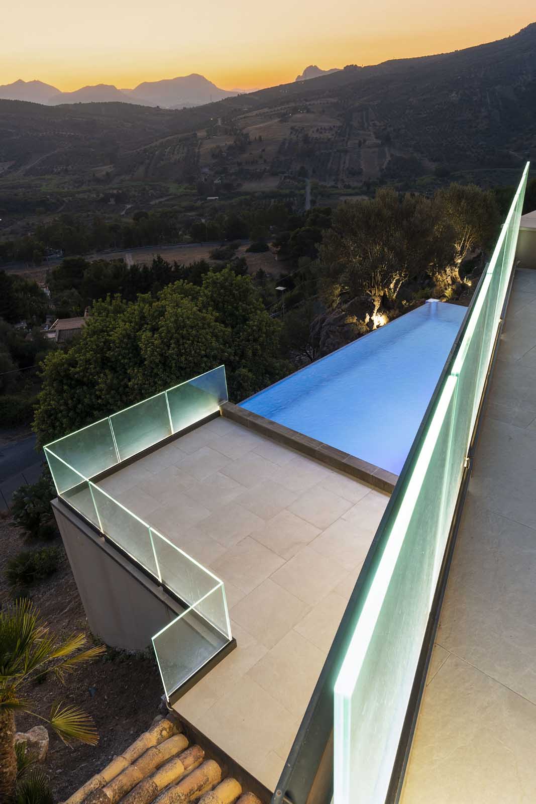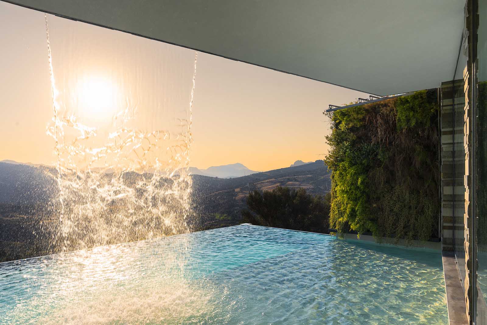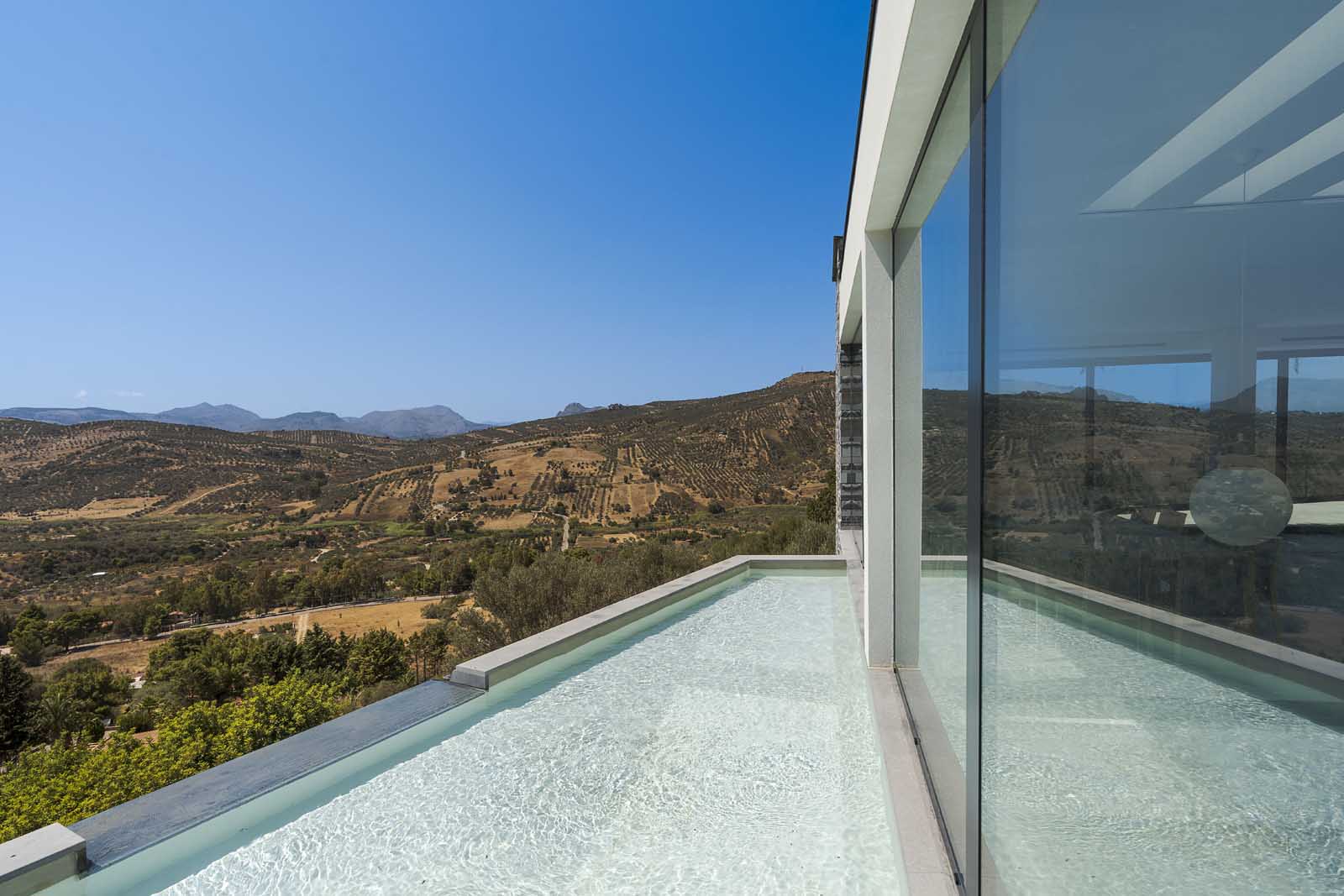 Le complexe se compose de deux bâtiments principaux, l’un destiné à accueillir des événements et l’autre des bureaux. L’agrandissement du complexe comprend un nouveau volume en forme de trapèze, qui abrite la salle principale au rez-de-chaussée, et un trapèze rectangulaire qui relie le nouveau bâtiment à l’existant. Le grand escalier et la piscine à débordement donnant sur la vallée ajoutent une touche scénographique à la structure. Au centre de la salle se dresse une pyramide vitrée, avec un arbre servant d’ancrage visuel et symbolique au projet.