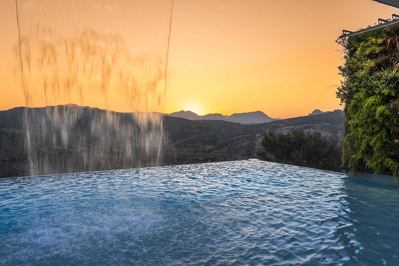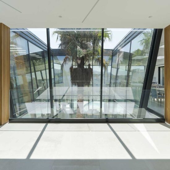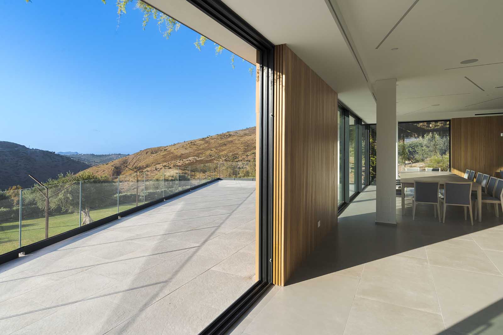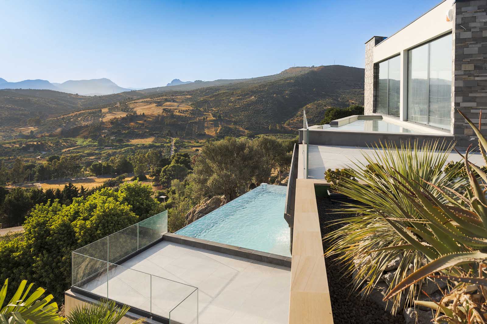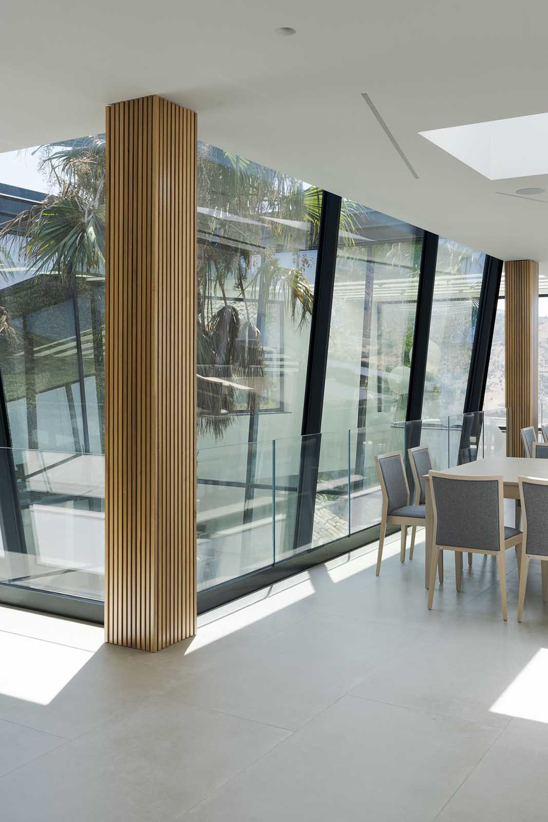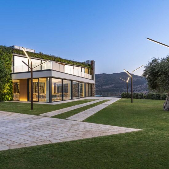 Le complexe se compose de deux bâtiments principaux, l’un destiné à accueillir des événements et l’autre des bureaux. L’agrandissement du complexe comprend un nouveau volume en forme de trapèze, qui abrite la salle principale au rez-de-chaussée, et un trapèze rectangulaire qui relie le nouveau bâtiment à l’existant. Le grand escalier et la piscine à débordement donnant sur la vallée ajoutent une touche scénographique à la structure. Au centre de la salle se dresse une pyramide vitrée, avec un arbre servant d’ancrage visuel et symbolique au projet.