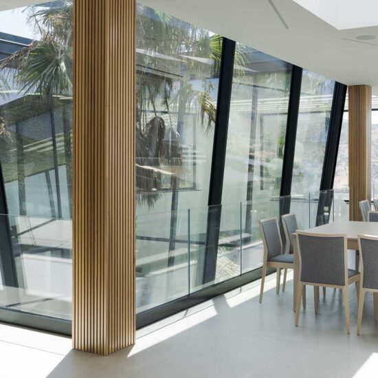 On entre dans le complexe par une cour historique, que marque un portail moderne en acier Corten guidant les visiteurs vers la nouvelle salle. La conception s’inscrit dans une démarche de réduction de l’impact environnemental et d’utilisation de matériaux écologiques. La structure en acier du bâtiment, associée à des fenêtres à faible émissivité et à verre sélectif, assure une très grande efficacité énergétique et un confort ambiant. L’utilisation de vitres à faible émissivité avec un contrôle solaire élevé réduit la dispersion de la chaleur en hiver et empêche la surchauffe en été. L’élimination des ponts thermiques a permis d’optimiser l’isolation thermique, tout en assurant la respirabilité de l’enveloppe du bâtiment.