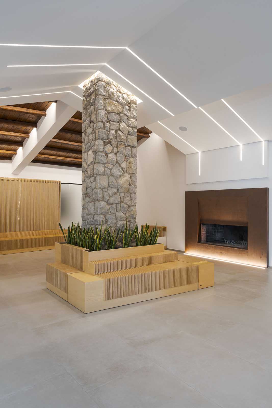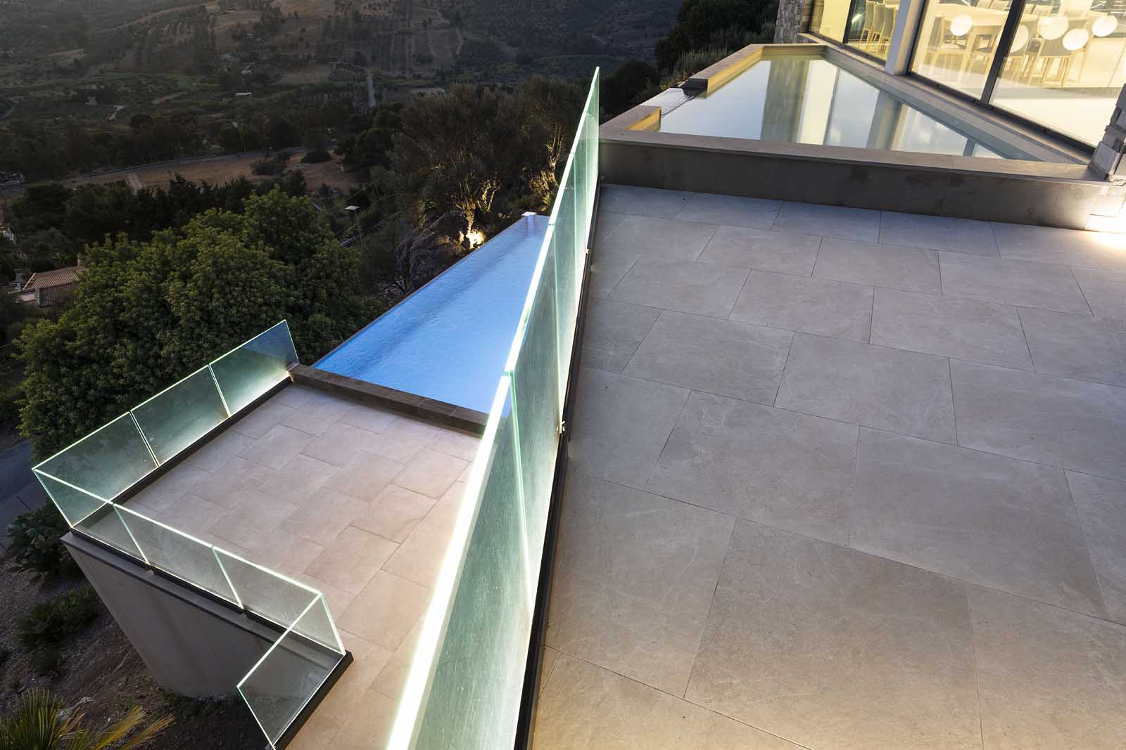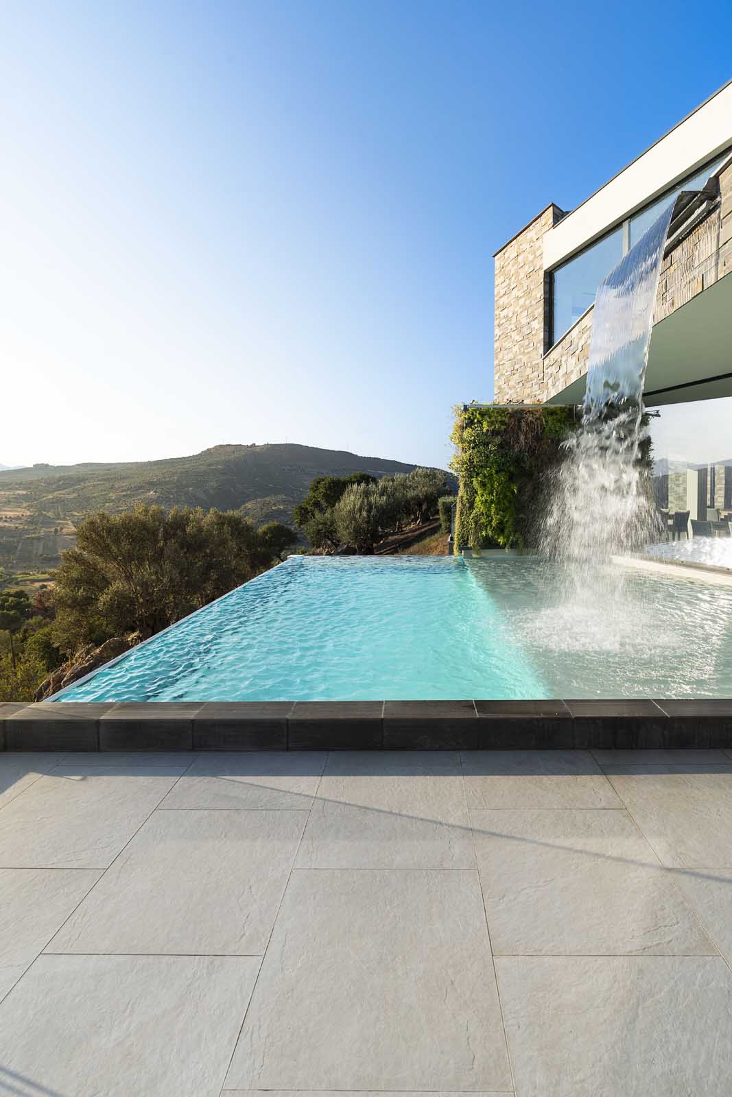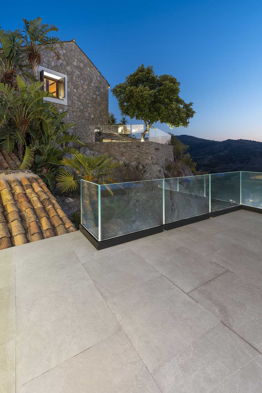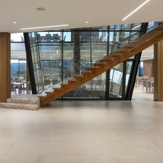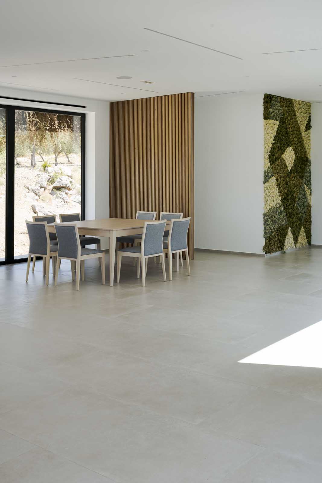 Sur les sols de toutes les zones intérieures, on trouve une collection effet ciré, spécialement conçue pour le projet, qui ajoute une touche distinctive aux espaces. À l’extérieur et sur les cheminements, la collection en grès imitation pierre Realstone_Slate, coloris Ice, réinterprète la force matérielle de l’ardoise, alliant beauté et fonctionnalité.