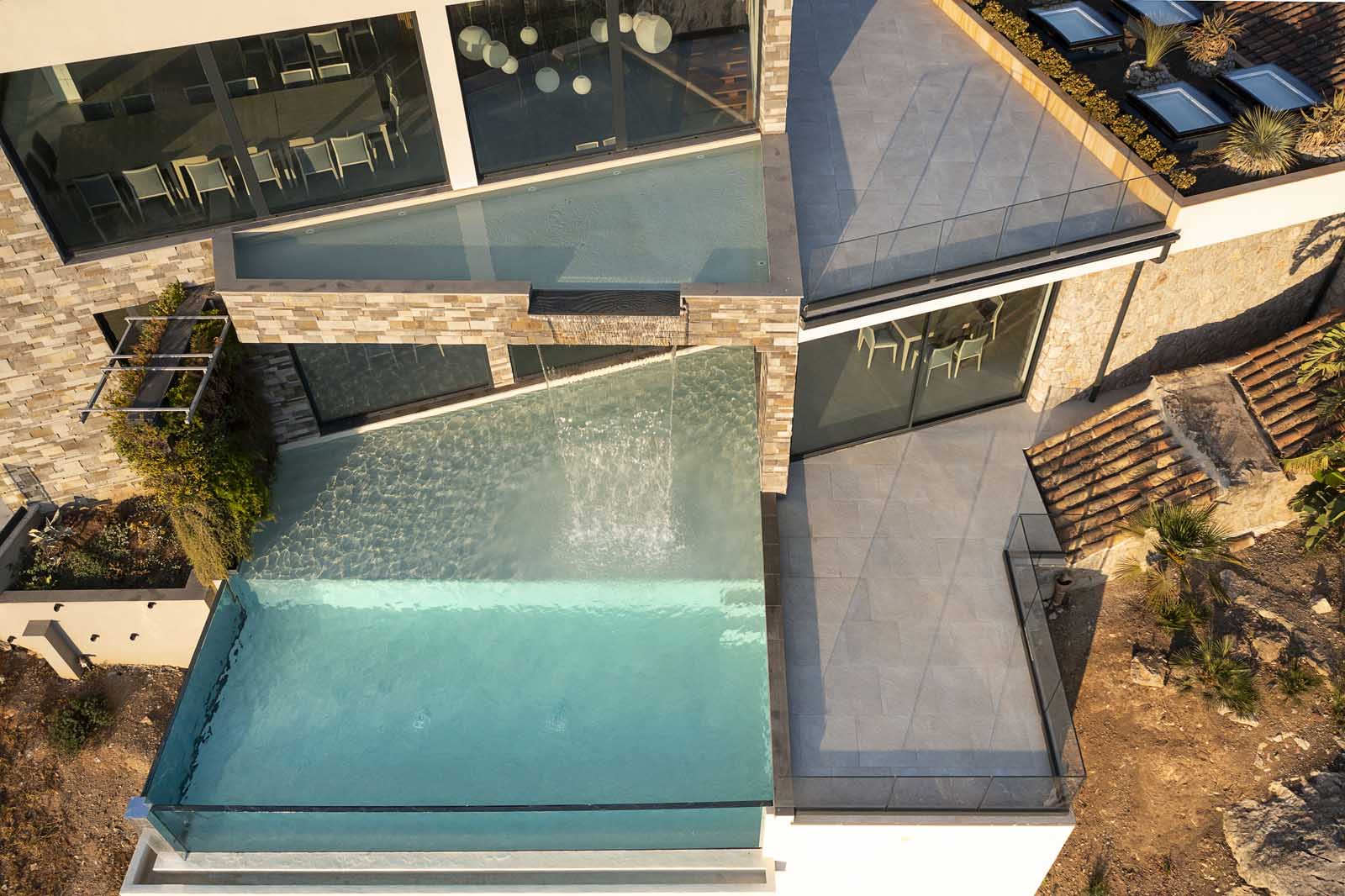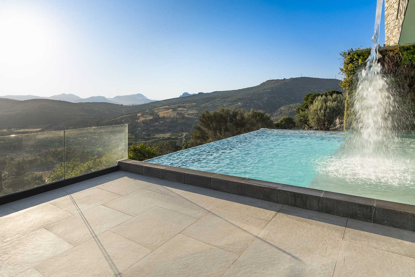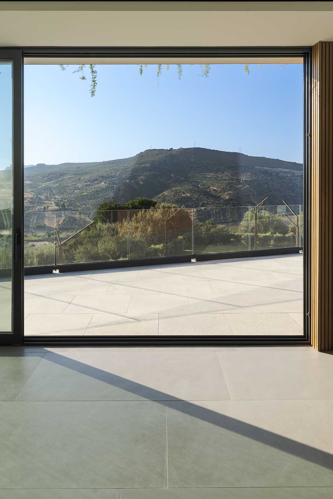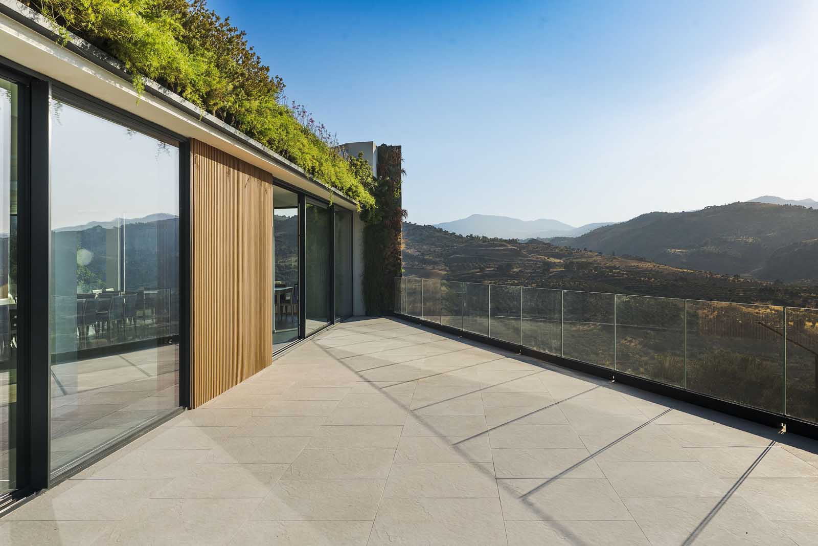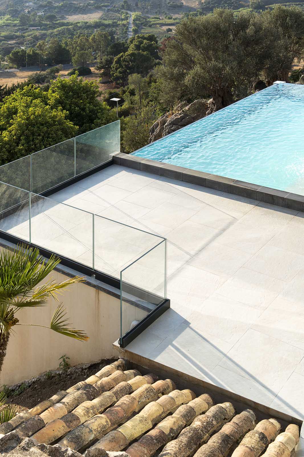 Sur les sols de toutes les zones intérieures, on trouve une collection effet ciré, spécialement conçue pour le projet, qui ajoute une touche distinctive aux espaces. À l’extérieur et sur les cheminements, la collection en grès imitation pierre Realstone_Slate, coloris Ice, réinterprète la force matérielle de l’ardoise, alliant beauté et fonctionnalité.