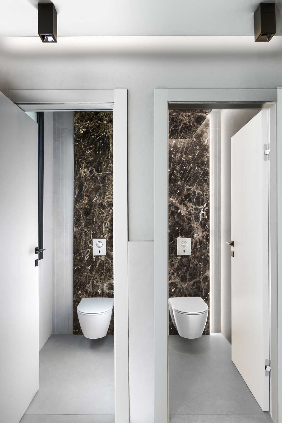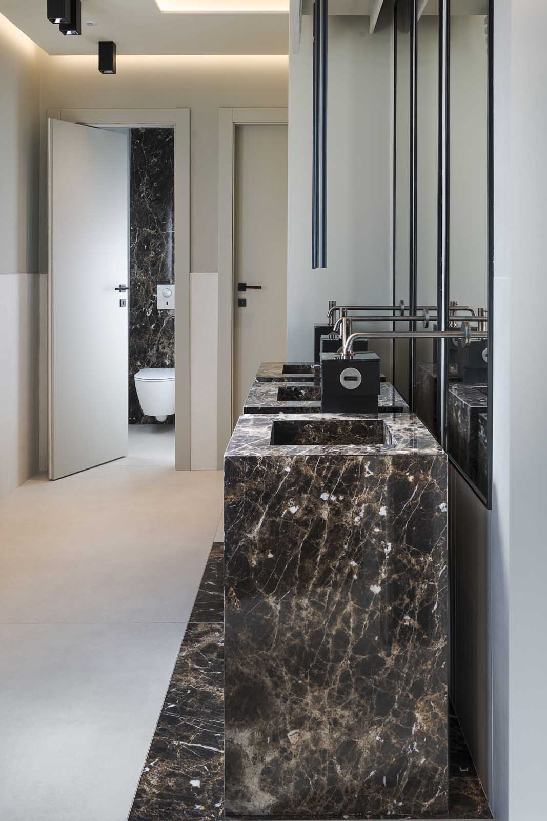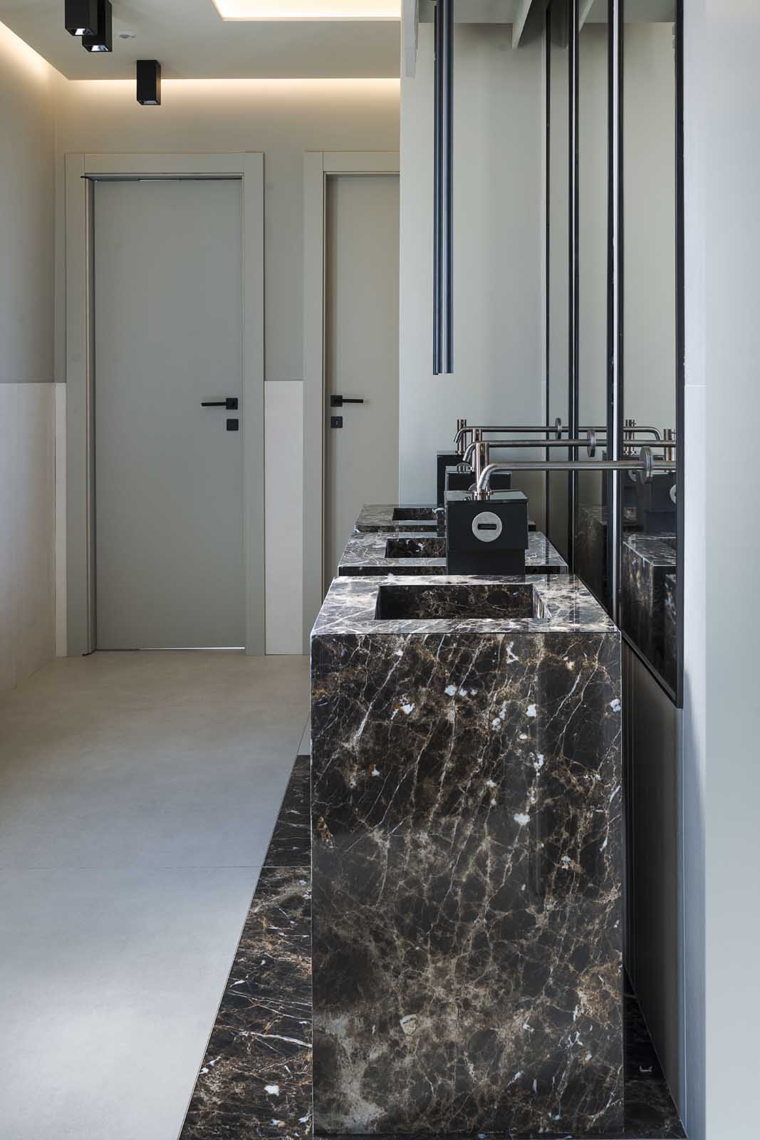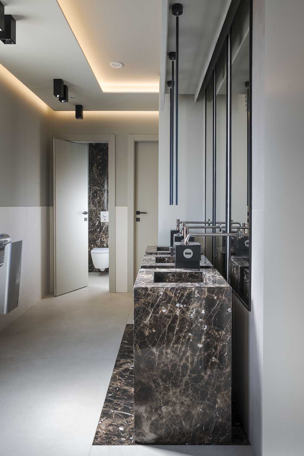 Pour le sol de la cuisine, le choix s’est porté sur la collection imitation pierre Eterna Arena 60×60, qui offre protection antimicrobienne et résistance à la glissance grâce aux technologies CleanOut et StepWise. Par ailleurs, la collection est réalisée avec 40 % de matériaux recyclés, pour un choix réellement écologique. Les lavabos des toilettes ont été revêtus du grès imitation marbre de la collection Incanto Emperador 120×278, ajoutant ainsi une touche d’élégance. D’autres toilettes ont été conçues avec les grandes dalles imitation ciment de la collection Maiora_Concrete Effect Bianco, créant ainsi un espace moderne et sophistiqué.
