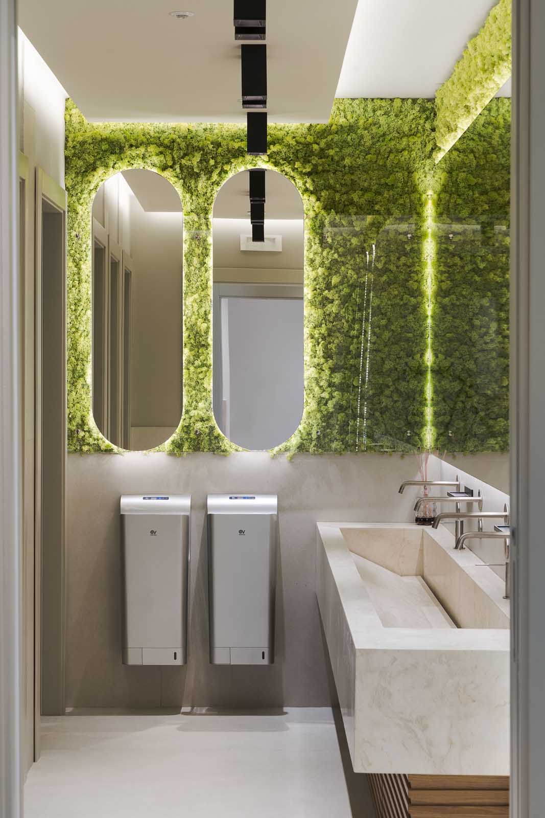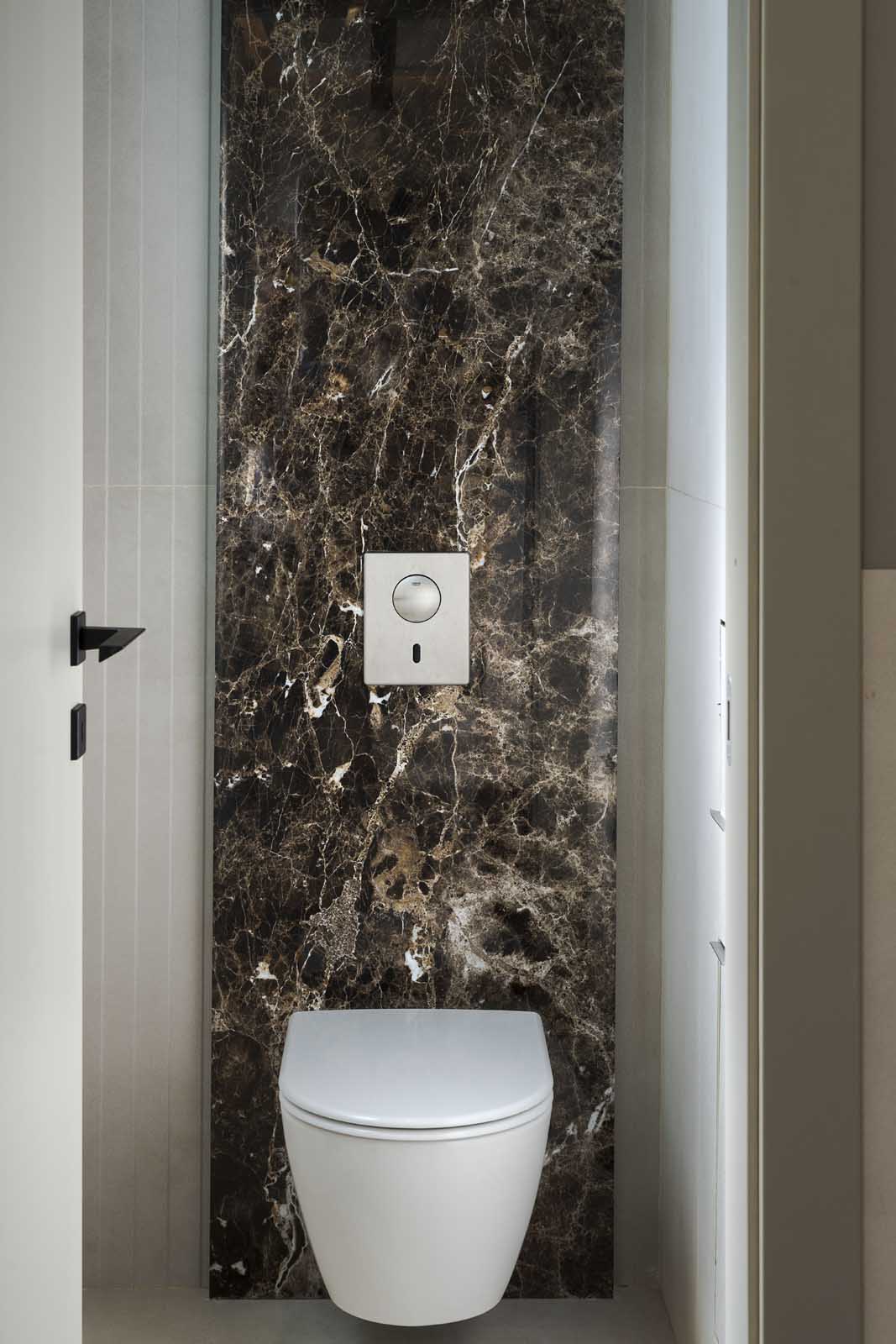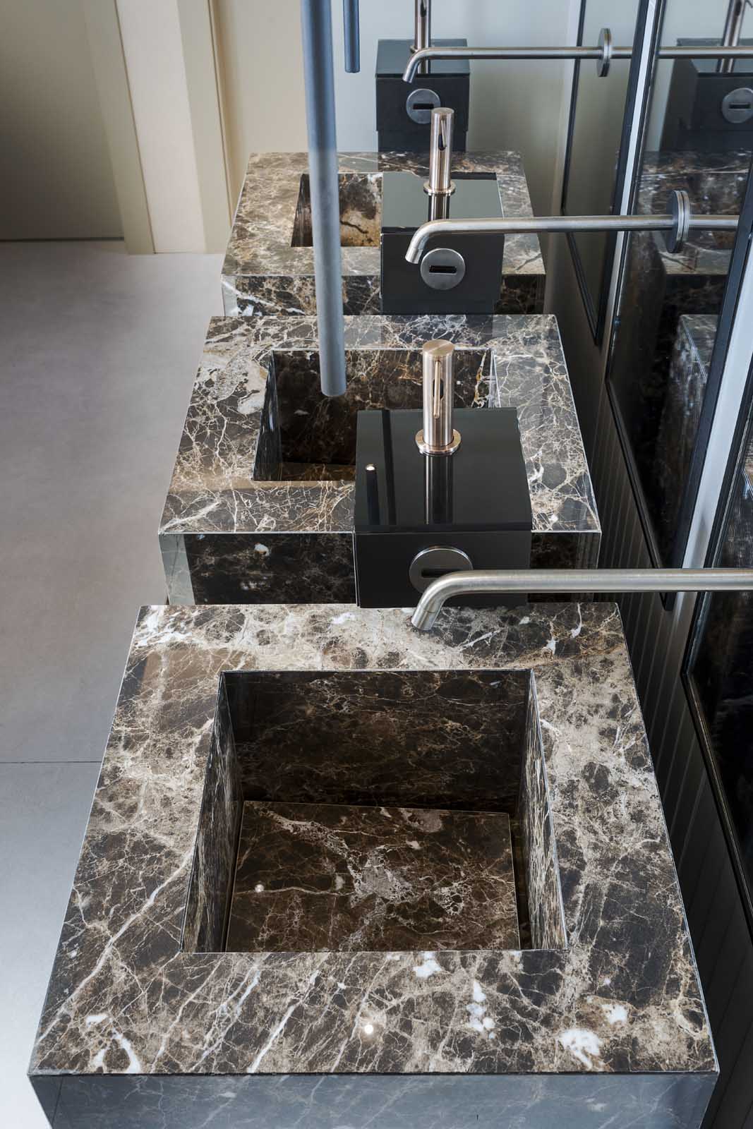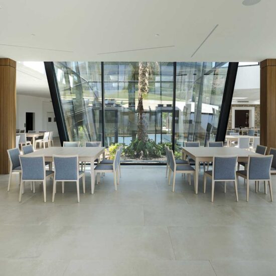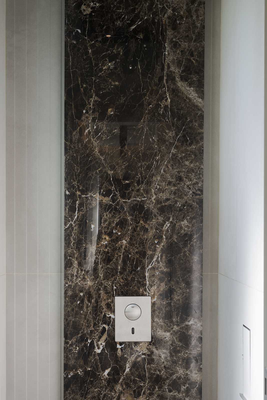 Pour le sol de la cuisine, le choix s’est porté sur la collection imitation pierre Eterna Arena 60×60, qui offre protection antimicrobienne et résistance à la glissance grâce aux technologies CleanOut et StepWise. Par ailleurs, la collection est réalisée avec 40 % de matériaux recyclés, pour un choix réellement écologique. Les lavabos des toilettes ont été revêtus du grès imitation marbre de la collection Incanto Emperador 120×278, ajoutant ainsi une touche d’élégance. D’autres toilettes ont été conçues avec les grandes dalles imitation ciment de la collection Maiora_Concrete Effect Bianco, créant ainsi un espace moderne et sophistiqué.