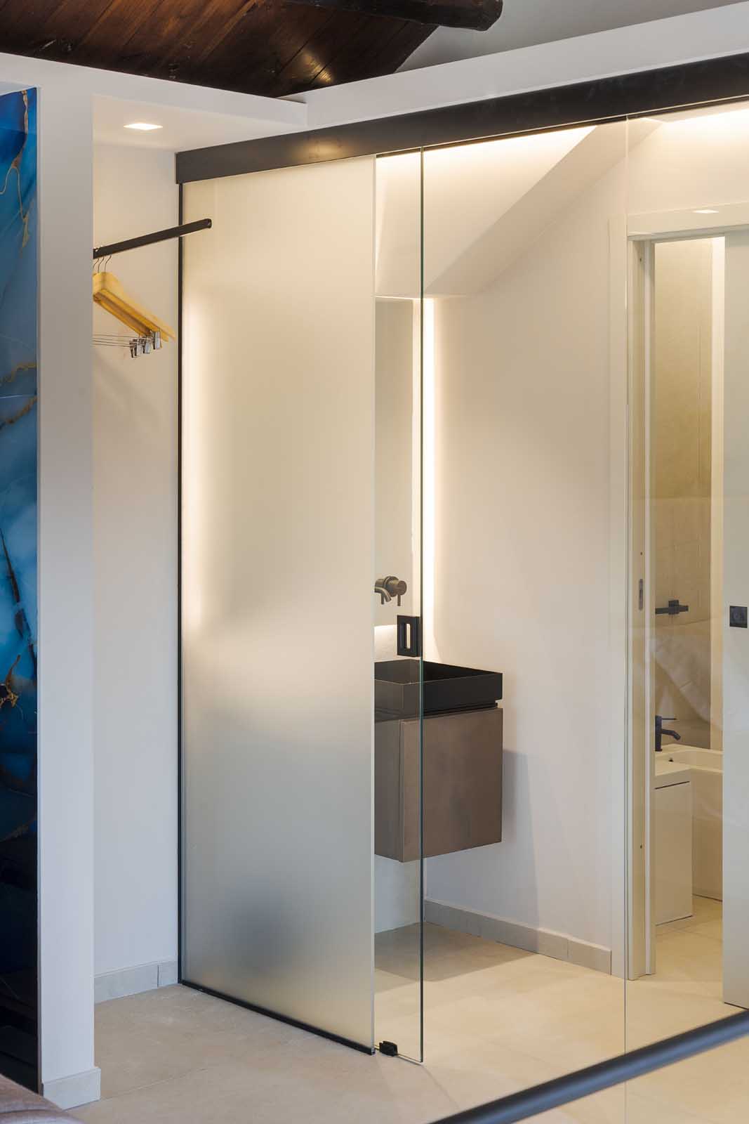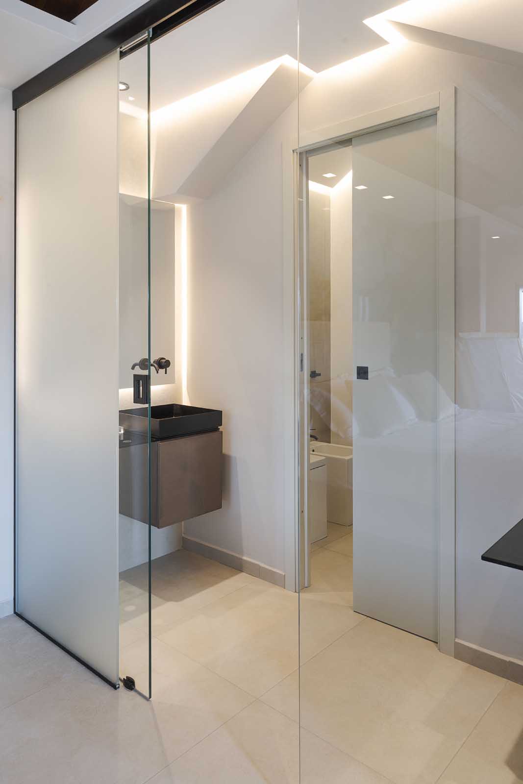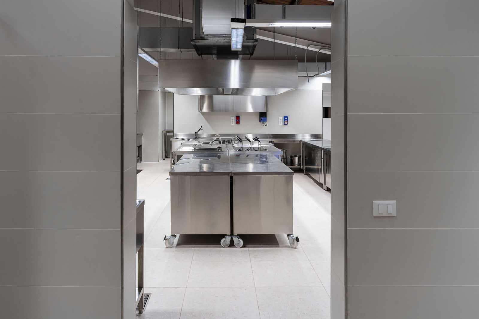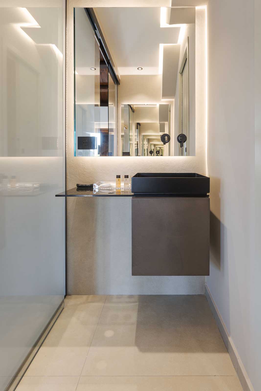 Pour le sol de la cuisine, le choix s’est porté sur la collection imitation pierre Eterna Arena 60×60, qui offre protection antimicrobienne et résistance à la glissance grâce aux technologies CleanOut et StepWise. Par ailleurs, la collection est réalisée avec 40 % de matériaux recyclés, pour un choix réellement écologique. Les lavabos des toilettes ont été revêtus du grès imitation marbre de la collection Incanto Emperador 120×278, ajoutant ainsi une touche d’élégance. D’autres toilettes ont été conçues avec les grandes dalles imitation ciment de la collection Maiora_Concrete Effect Bianco, créant ainsi un espace moderne et sophistiqué.