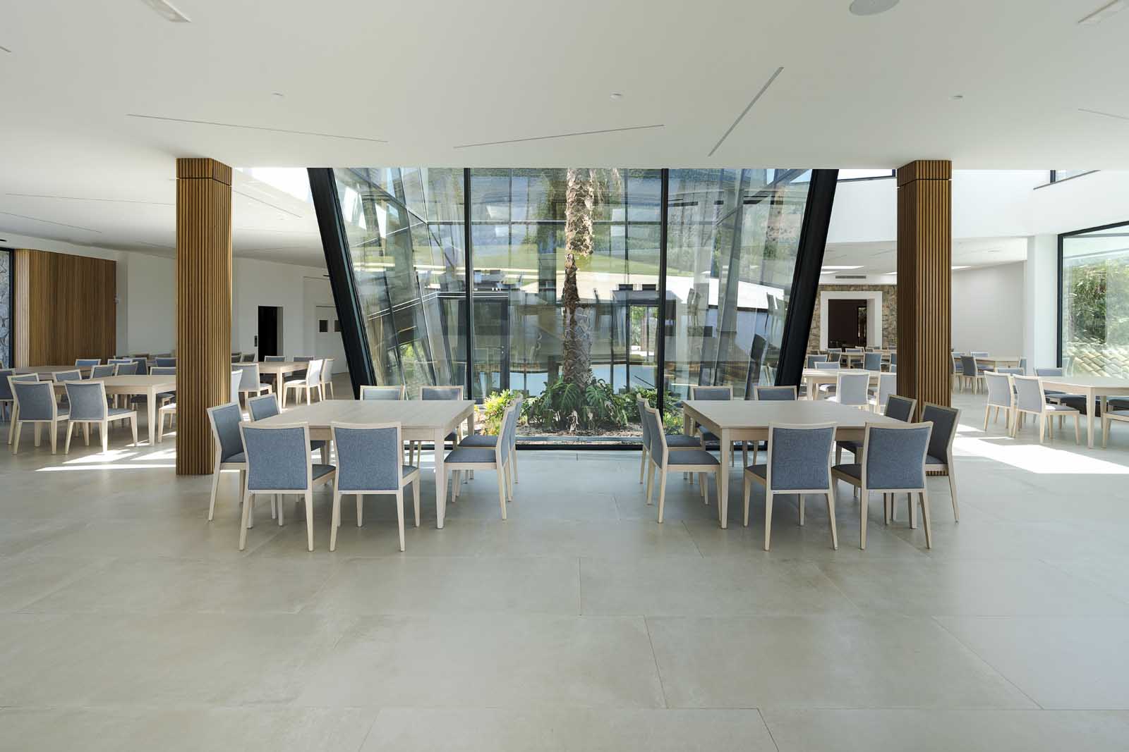 Le complexe existant a été rénové et agrandi, en conservant le système de distribution autour de la cour et le développement en « L » du bâtiment principal. L’analyse du site, des conditions climatiques, du rayonnement solaire et des vents a permis l’adoption des principes de conception bioclimatique : optimisation du confort et la salubrité des espaces et réduction au minimum de l’utilisation d’énergie pour la climatisation.