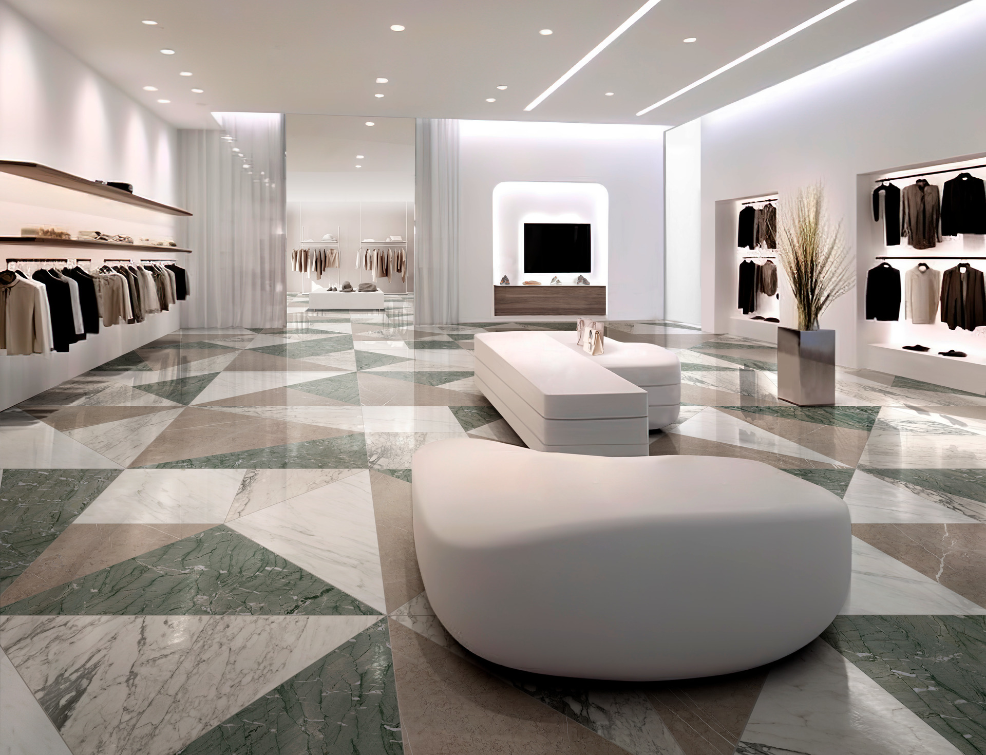 Parmi nos combinaisons Incanto favorites, citons Calacatta Essenza avec Breccia Pernice ou avec Verde Antigua, Calacatta Green avec Velvet Taupe, ou un mix de colorations – Calacatta Essenza, Velvet Taupe, Verde Antigua, Paonazzetto – pour dessiner d’amples revêtements de sol en marqueterie dans les espaces commerciaux.