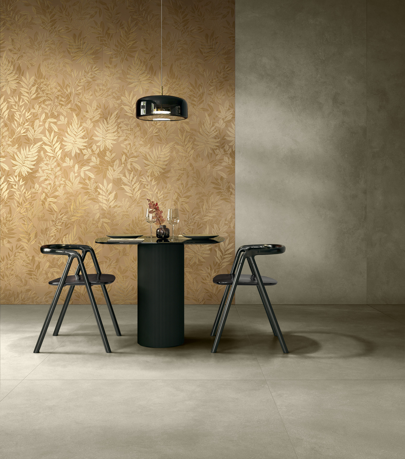Enfin, parmi les nouveautés de cette collection imitation marbre, le nouveau décor Golden Leaf, présenté sous forme de dalle rectifiée 120×278 cm avec finition naturelle ornée d’inclusions dorées à la fantaisie feuillage, s’unit au décor Tropical Glossy sur le thème jungle en blanc sur fond Cremo Delicato, et au décor Flow Glossy composé d’un mélange de très fines bandes découpées dans les différentes couleurs Incanto.