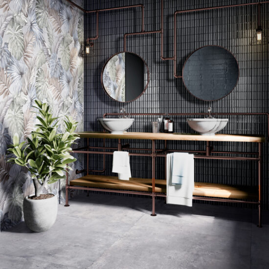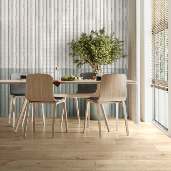 Enfin, la collection Glacé confère un accent précieux en association à d'autres collections imitation bois Ragno – Inedito –, pierre – Richmond – et ciment – Clayton – pour créer des compositions à l'esprit sophistiqué et contemporain, tant dans des espaces résidentiels que commerciaux, notamment en association à des motifs floraux, jungle ou géométriques résolument actuels.