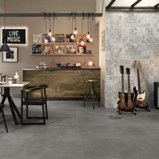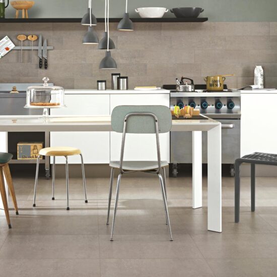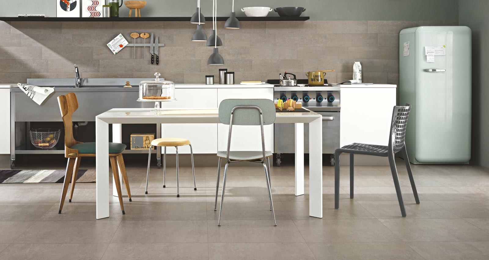 Vous pouvez choisir le carrelage de votre cuisine moderne au cachet industriel en vous inspirant des surfaces brutes du béton et de sa simplicité sans fioritures. Les collections Boom et Concept Ragno de carrelage en grès cérame imitation ciment offrent tant des teintes unies que des mosaïques et des carreaux décorés coordonnés.