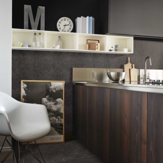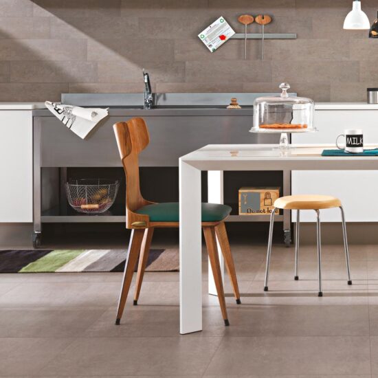 Ces tonalités intenses et la texture imitation pierre de Realstone Slate, qui a l’apparence de l’ardoise traditionnelle, mettent pleinement en valeur une cuisine minimaliste claire. Les couleurs plus délicates de la collection, glace (Ice) et coquille (Shell), seront quant à elles réservées au sol.