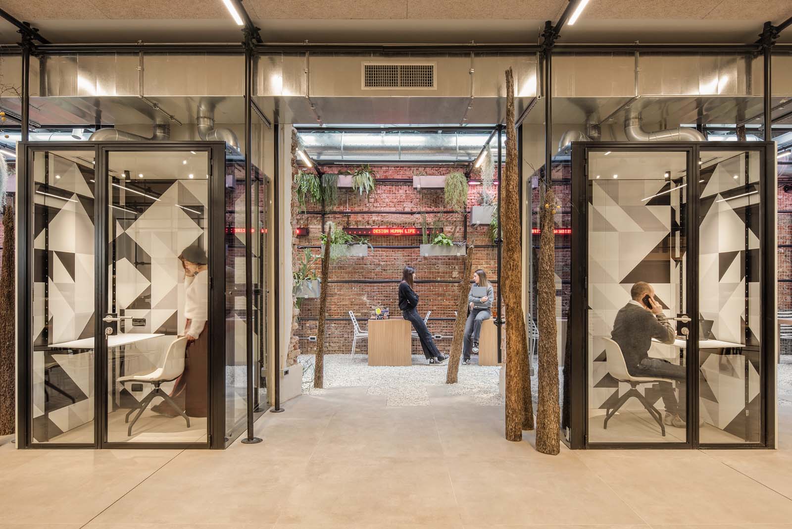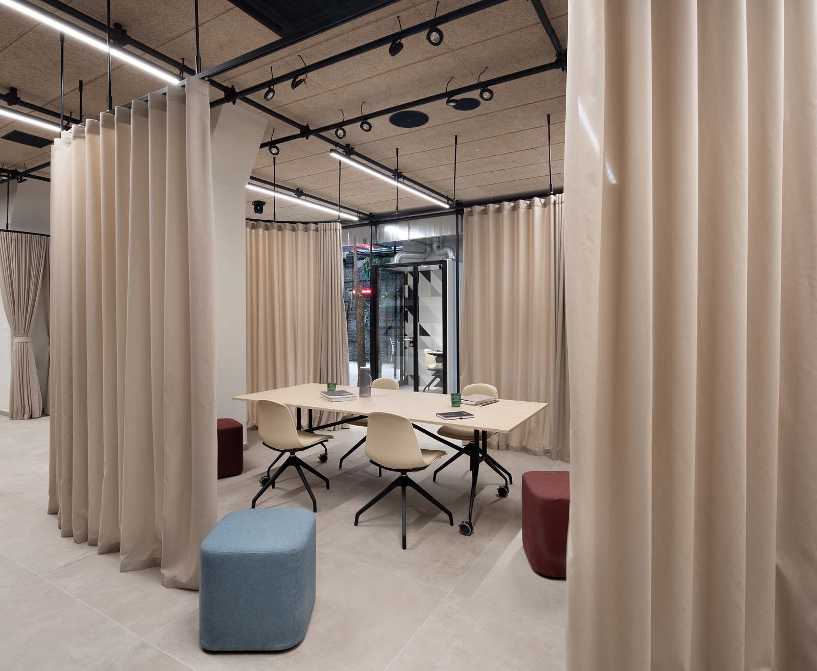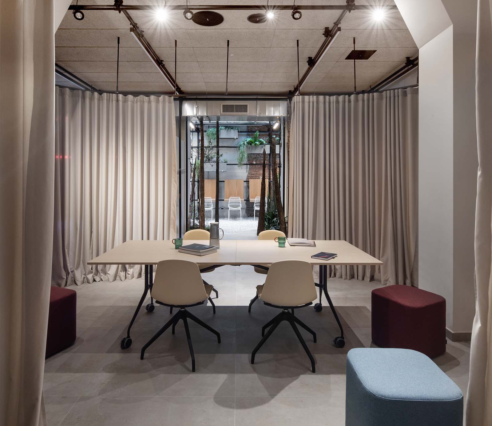 La zone Live en est le véritable cœur : un espace multifonctionnel, entièrement flexible, conçu pour accueillir différents types d’événements, des ateliers aux séances de brainstorming, en passant par des réunions plénières et des démonstrations culinaires. Ancré dans une esthétique industrielle, l’espace fait la part belle aux tubes Innocenti, qui s’intègrent au mobilier mobile et sur mesure : tables pliantes, poufs, escabeaux et divers types d’assises offrent des configurations infinies pour répondre aux besoins du moment.