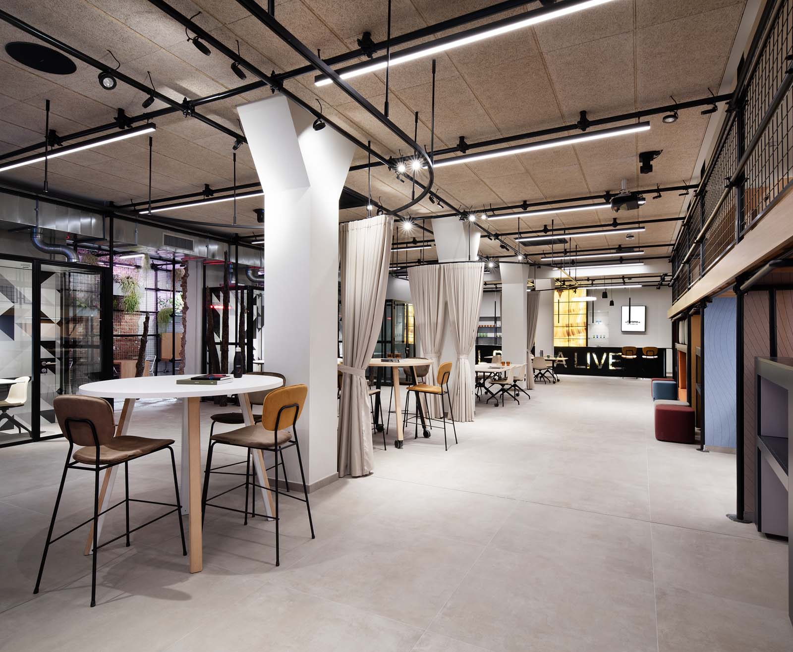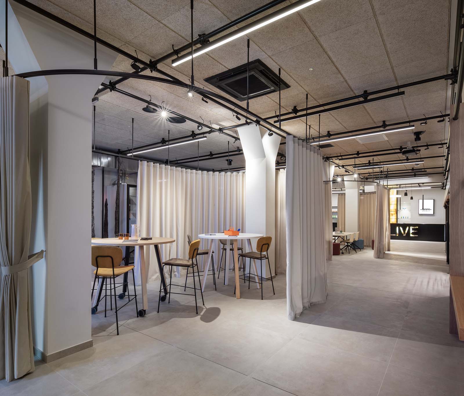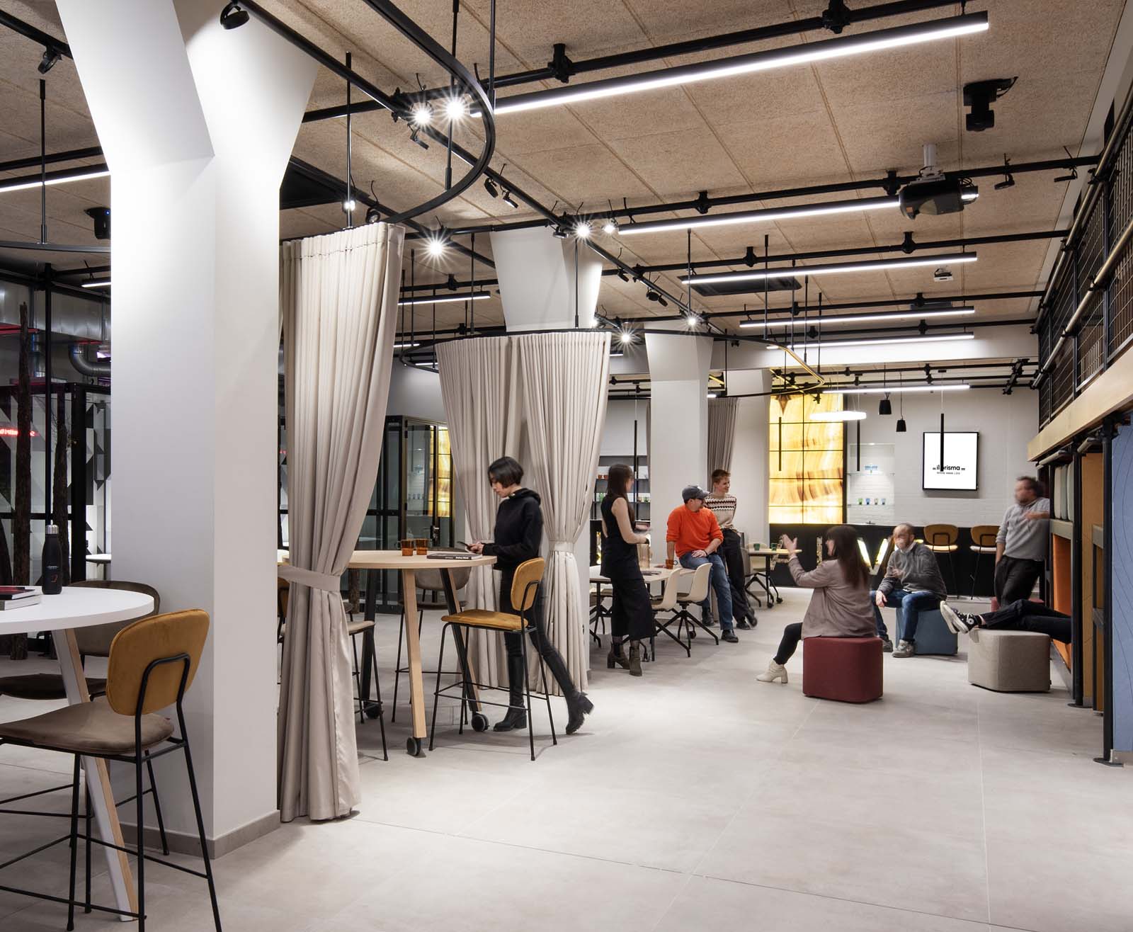Outre la salle principale, la zone Live comprend des espaces annexes et dynamiques. Cinq marches mobiles dissimulent des niches pour les sessions de brainstorming, équipées de murs inscriptibles et d’écrans. De là, on peut accéder au jardin botanique Serendipity Garden, lieu de rencontre de la nature et du bien-être, conçu pour offrir des moments de travail et de socialisation dans un cadre reposant et informel. Dominé par un comptoir de bar emblématique, l’espace restauration offre un cadre informel idéal pour les réunions, les séances de brainstorming, voire des événements.