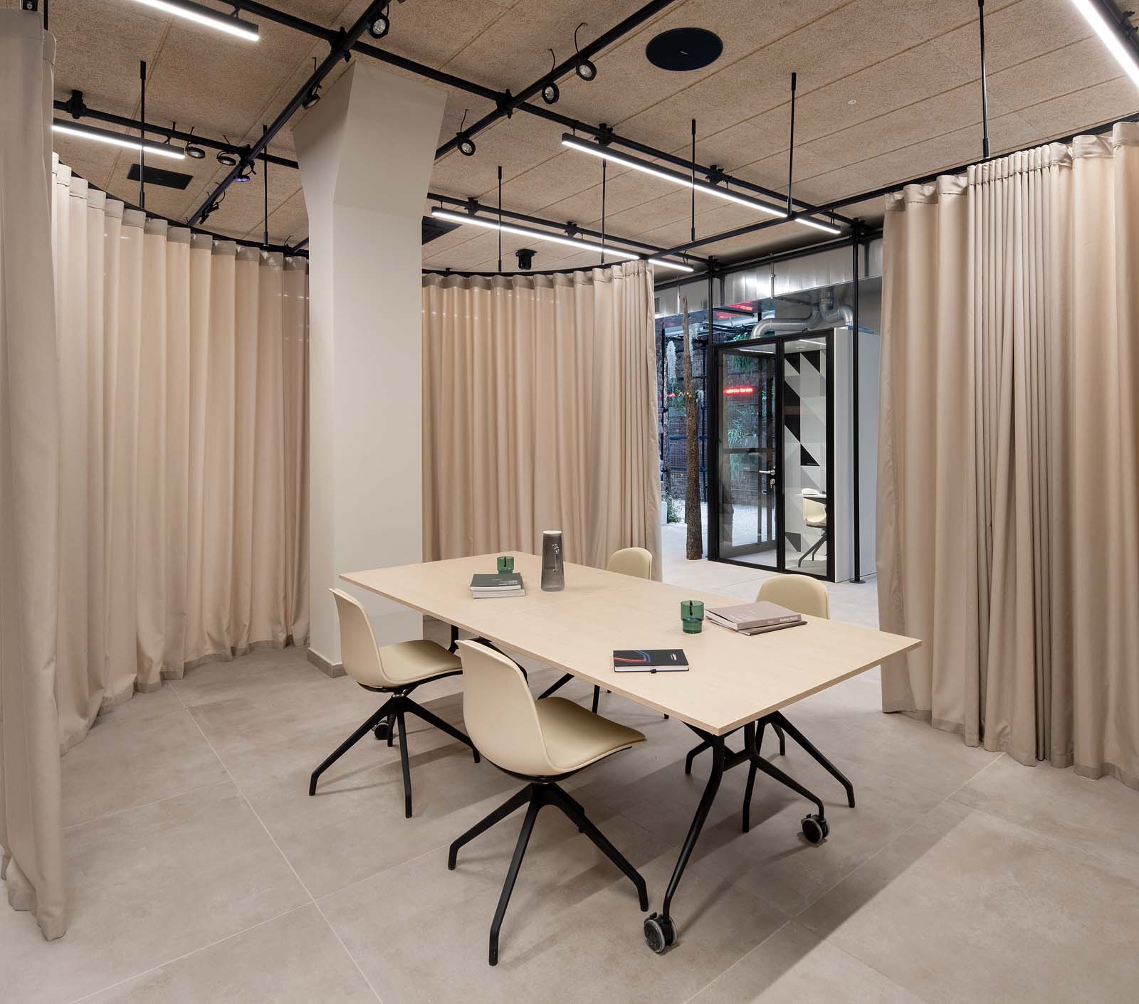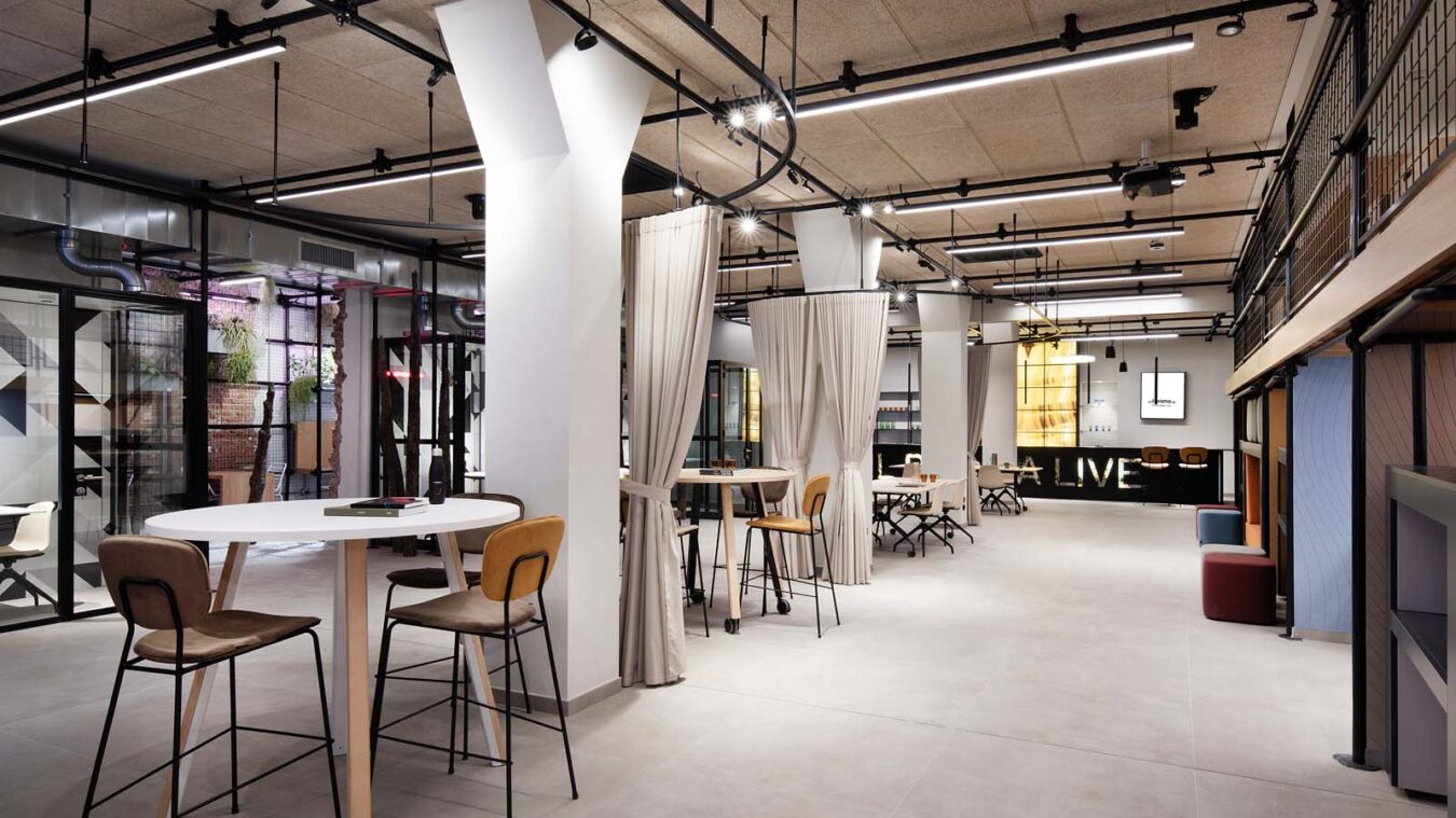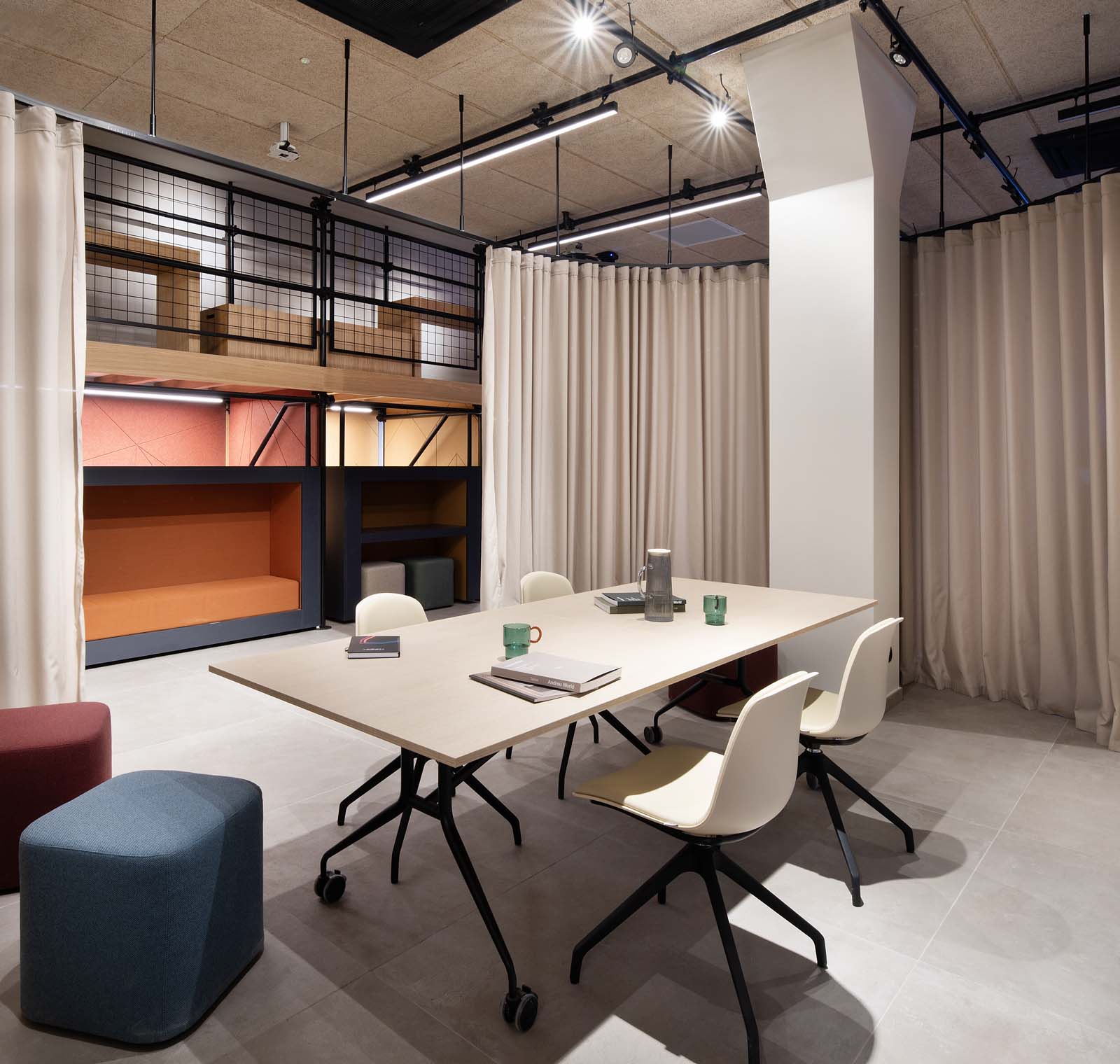 Outre la salle principale, la zone Live comprend des espaces annexes et dynamiques. Cinq marches mobiles dissimulent des niches pour les sessions de brainstorming, équipées de murs inscriptibles et d’écrans. De là, on peut accéder au jardin botanique Serendipity Garden, lieu de rencontre de la nature et du bien-être, conçu pour offrir des moments de travail et de socialisation dans un cadre reposant et informel. Dominé par un comptoir de bar emblématique, l’espace restauration offre un cadre informel idéal pour les réunions, les séances de brainstorming, voire des événements.