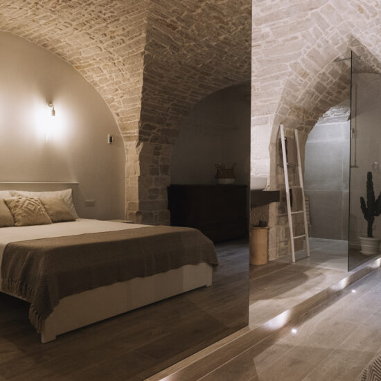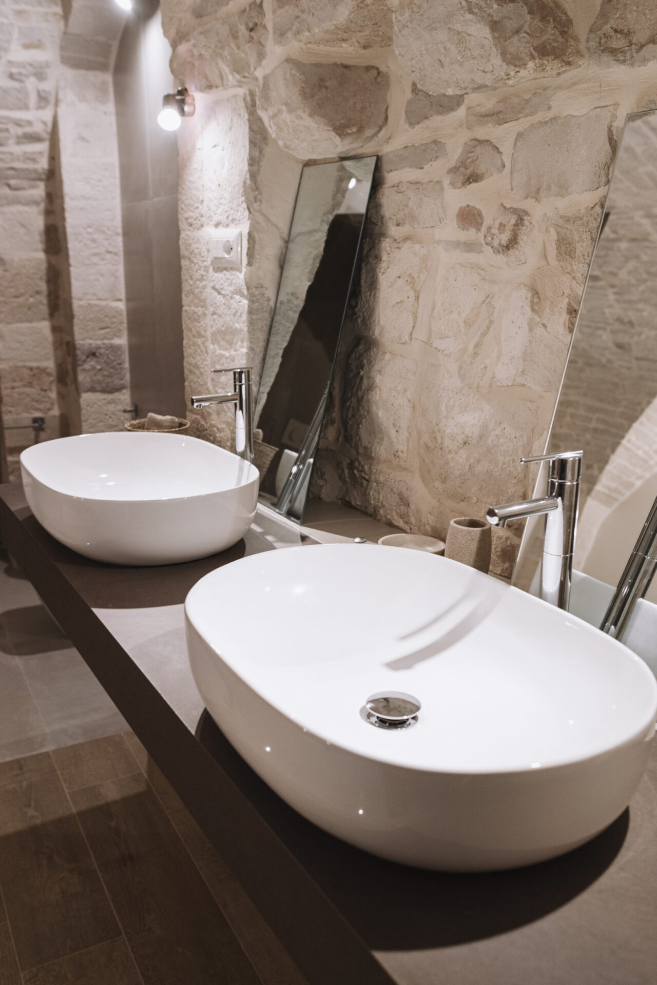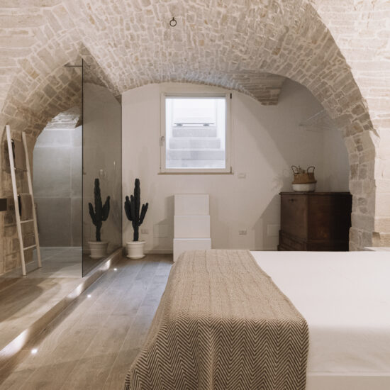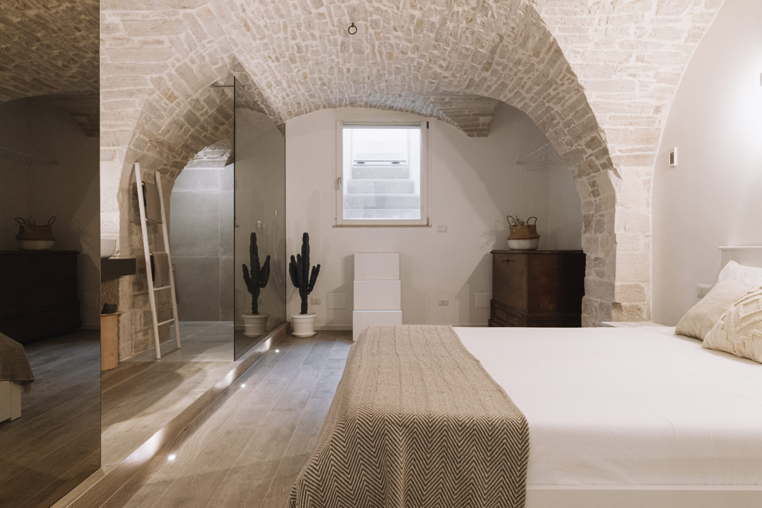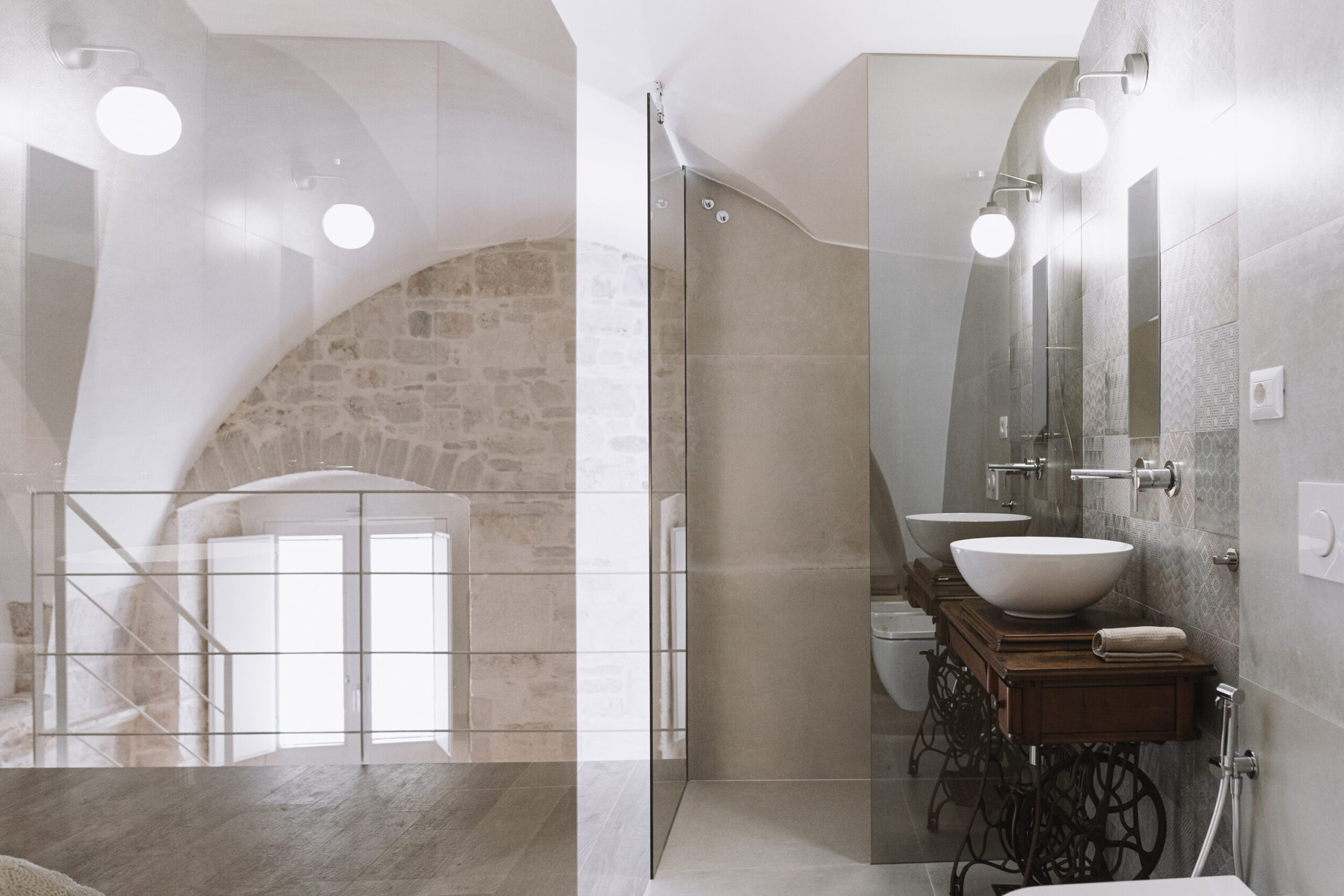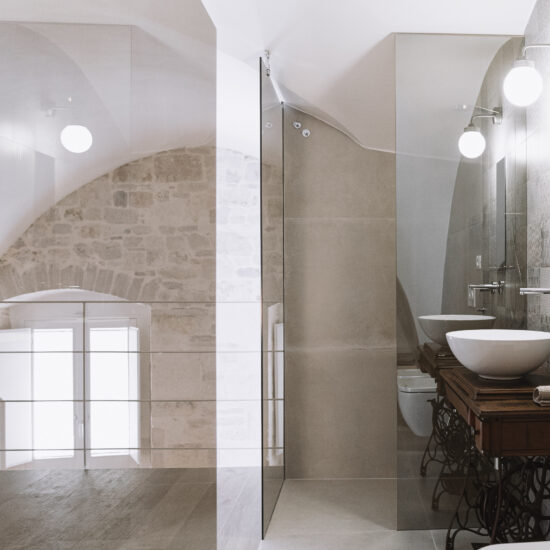 À la base, la pierre locale représente une sorte de cocon protecteur issu du passé, solide. À l'intérieur, l'atmosphère est étonnamment chaleureuse et caressante. La nouvelle géométrie des espaces, multipliés par le reflet du verre et des glaces, dessine des pièces modernes et lumineuses dans lesquelles passer des jours entiers, faisant l'éloge du repos et de la lenteur.