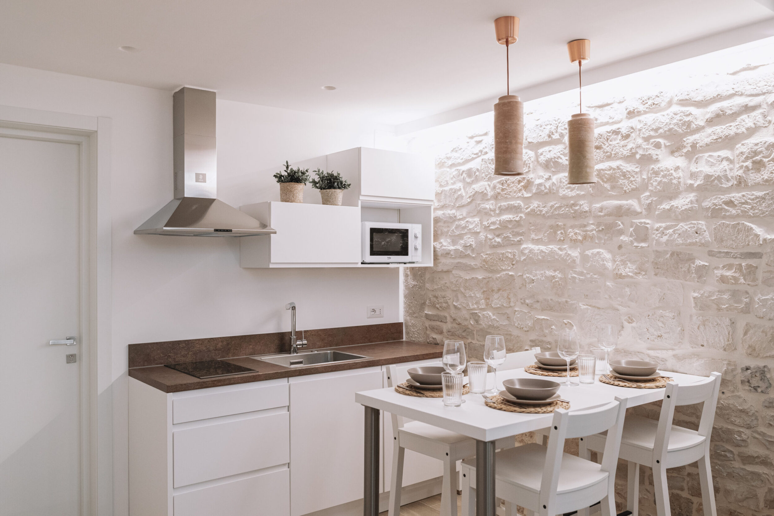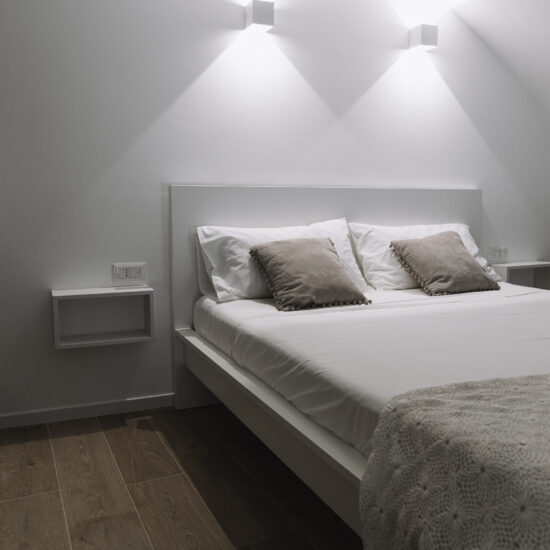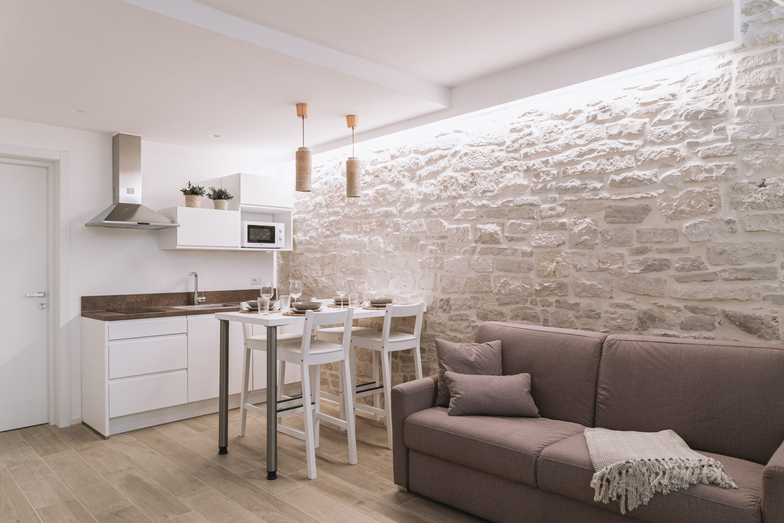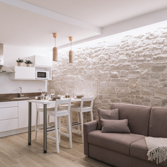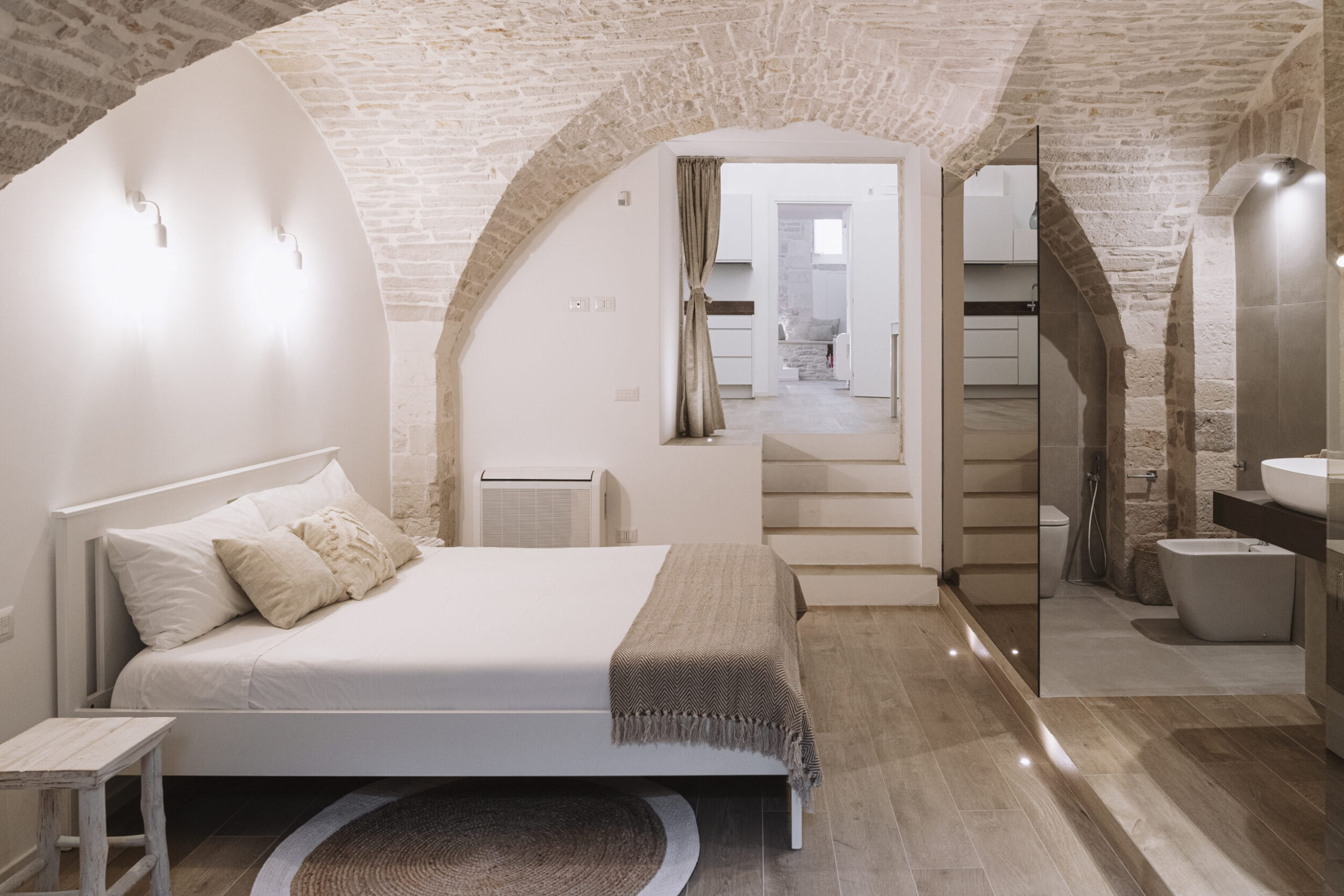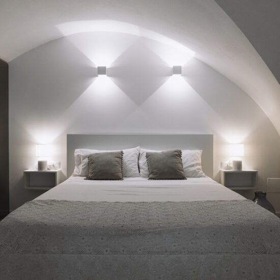 À la base, la pierre locale représente une sorte de cocon protecteur issu du passé, solide. À l'intérieur, l'atmosphère est étonnamment chaleureuse et caressante. La nouvelle géométrie des espaces, multipliés par le reflet du verre et des glaces, dessine des pièces modernes et lumineuses dans lesquelles passer des jours entiers, faisant l'éloge du repos et de la lenteur.