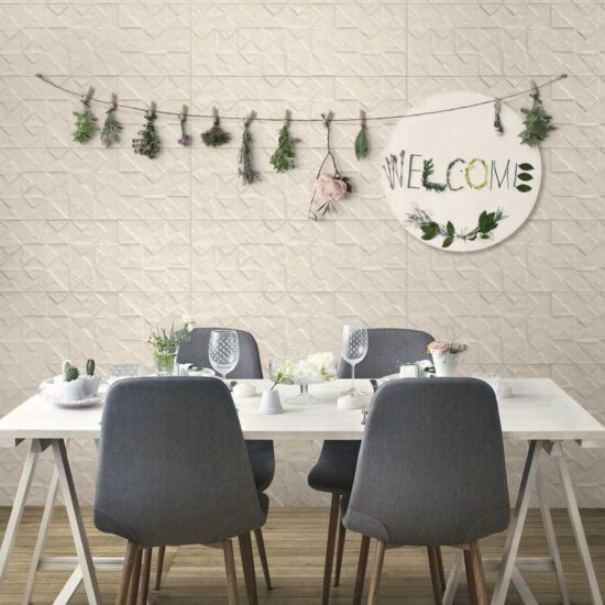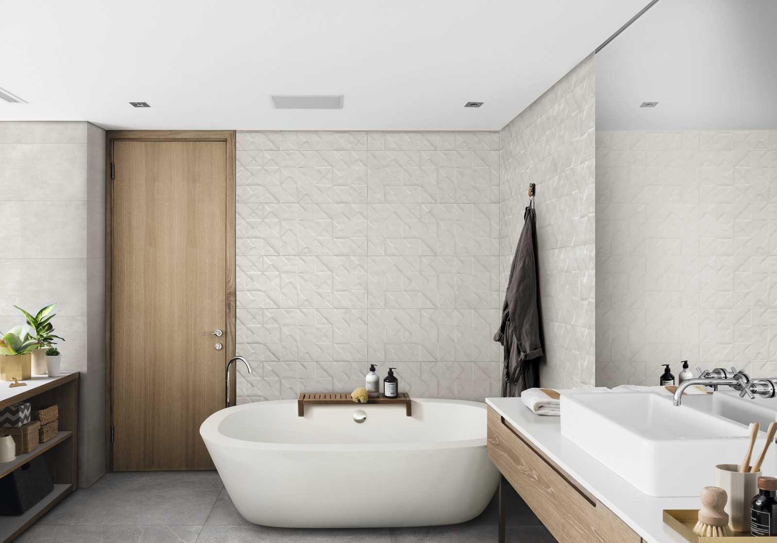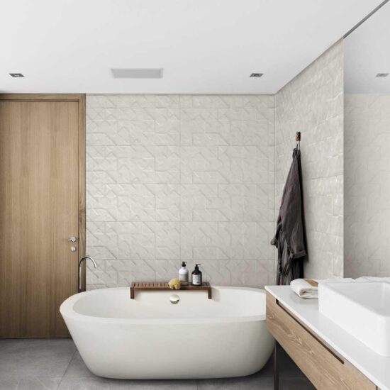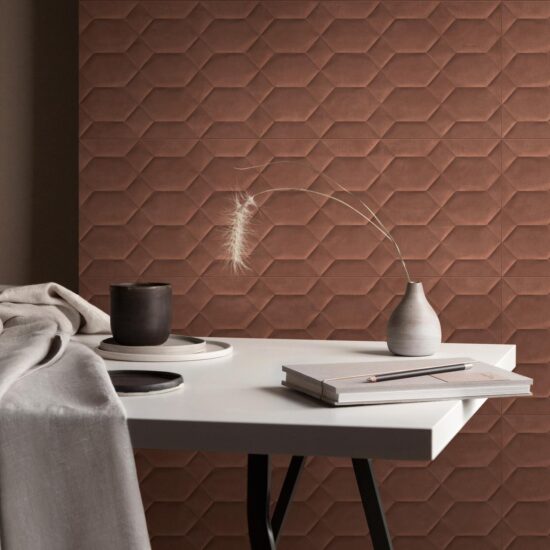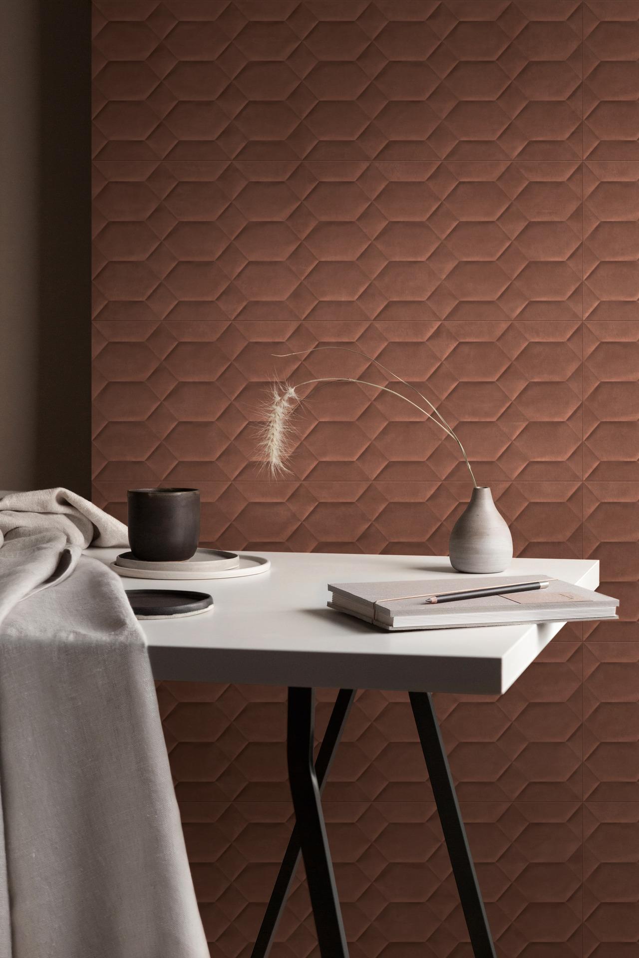 Et si vous avez envie d'une application plus spécifique comme une tête de lit ou une boiserie à l'entrée dans des colorations inattendues et dans une texture dégageant un grand effet de matière, nous vous conseillons de choisir le revêtement en céramique TexCem, avec structure tridimensionnelle Tria, composée de silhouettes triangulaires et carrées qui émergent de la matière et en exaltent la forme pour créer des clairs-obscurs d'un grand impact visuel. La structure Tria, disponible en 5 tonalités, peut être utilisée pour différents types de compositions, sur l'intégralité du mur ou en frise.