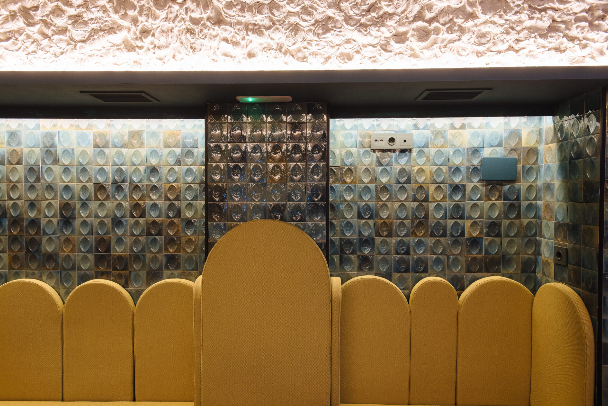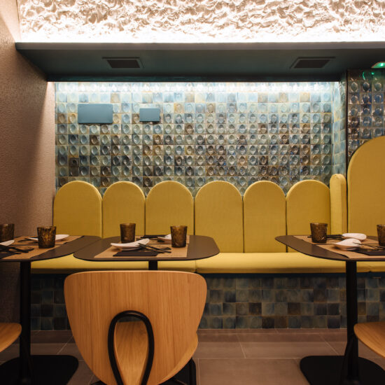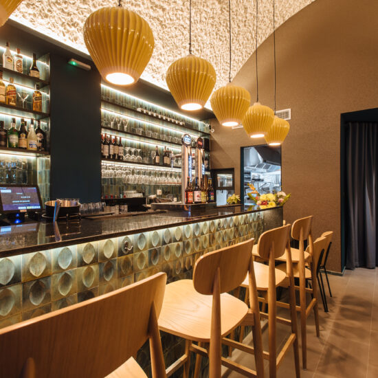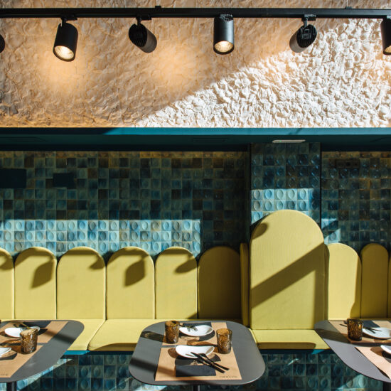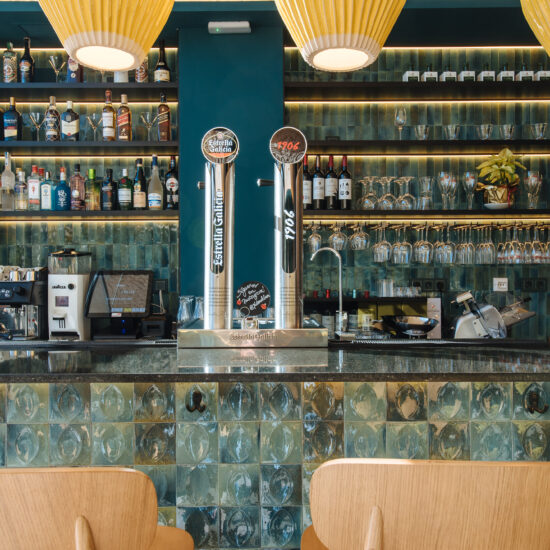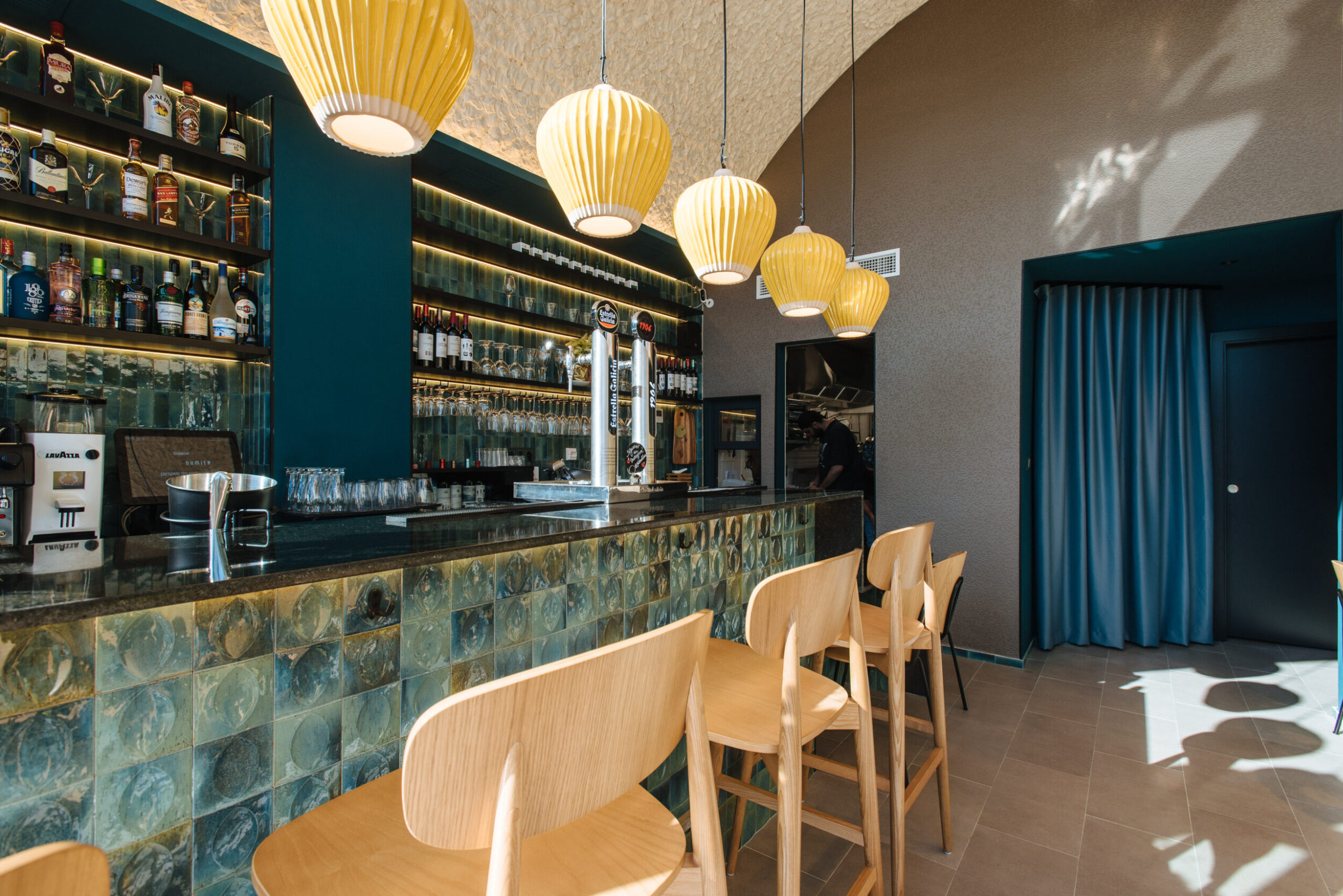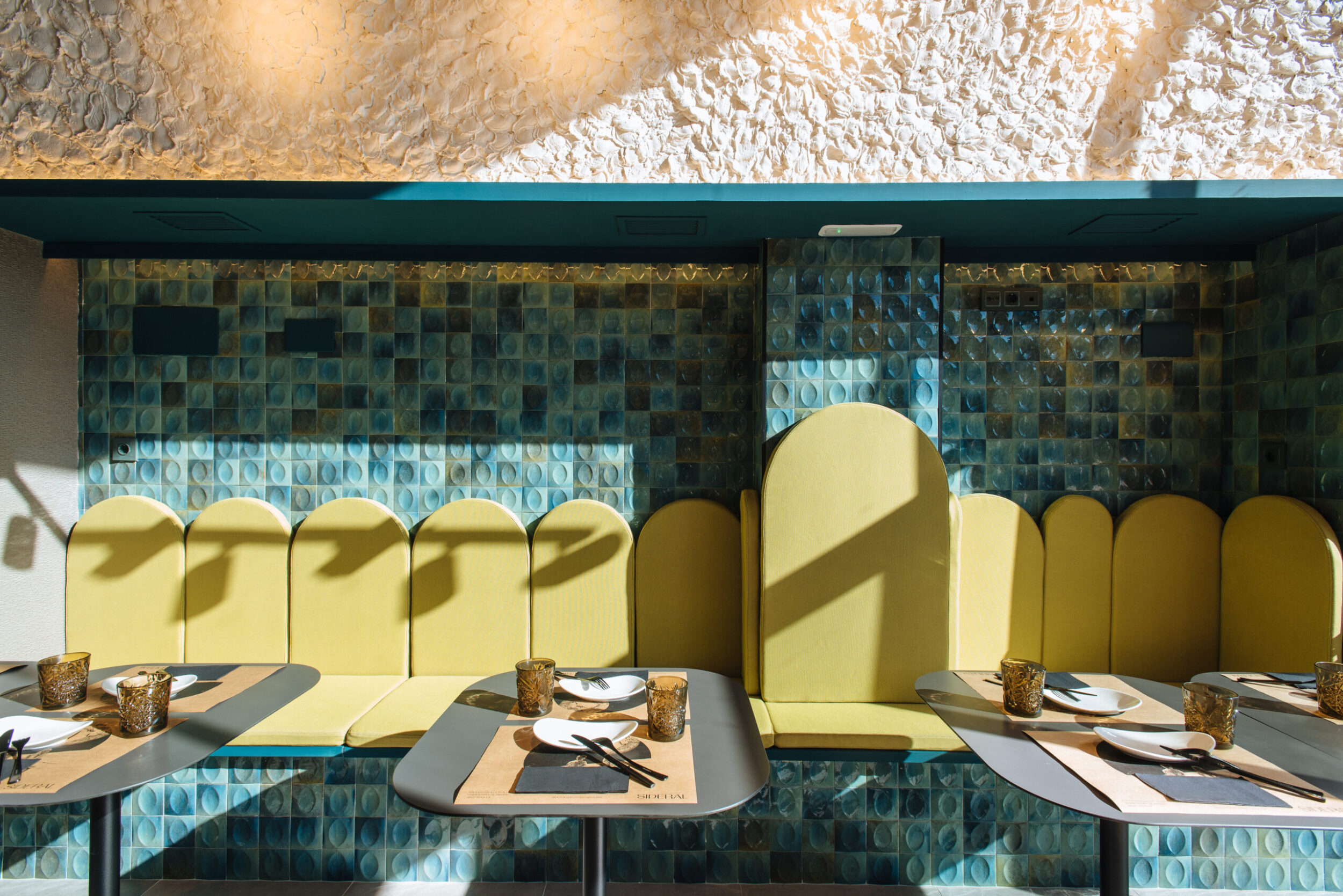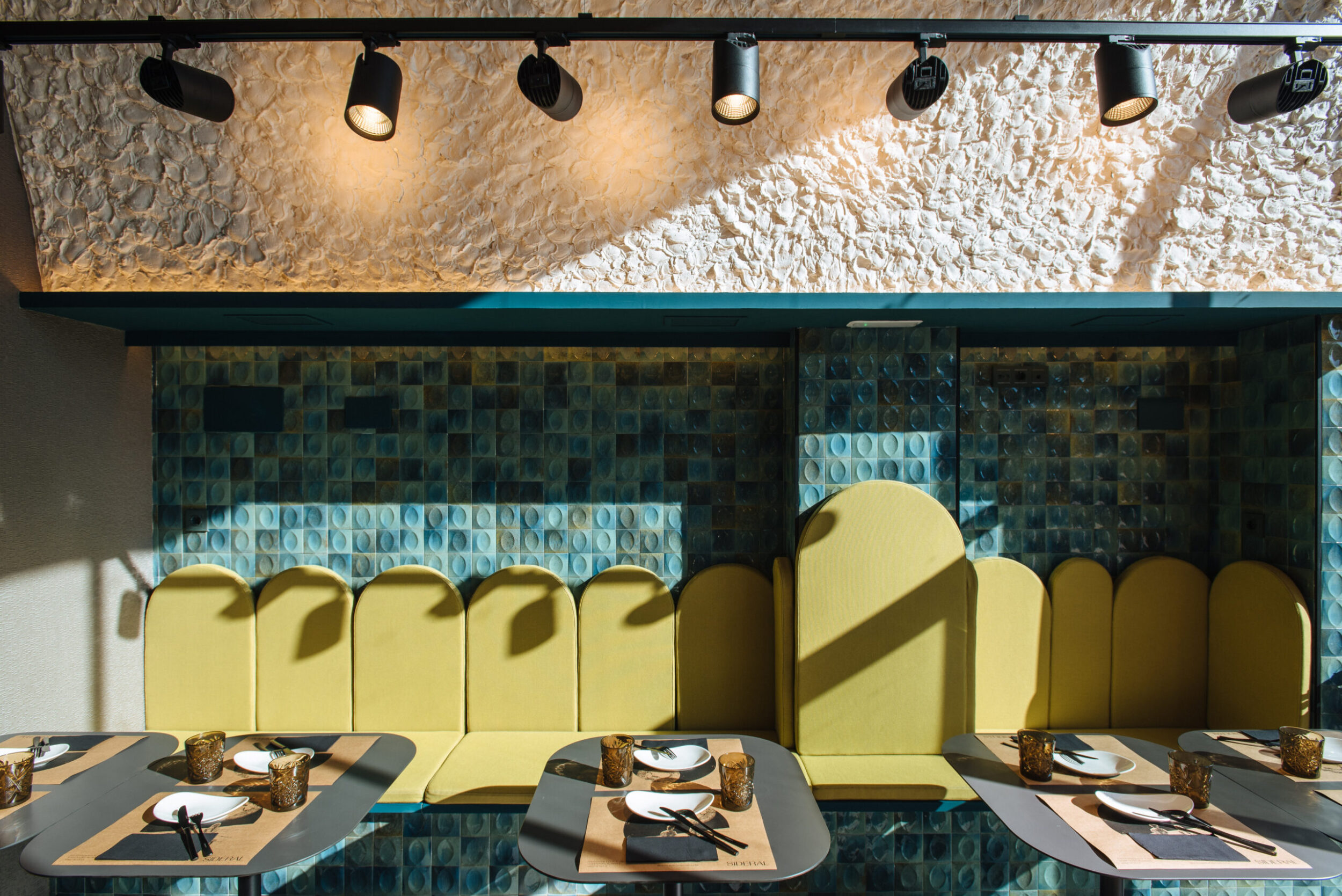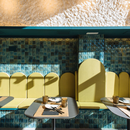 Les concepteurs ont choisi Gleeze Turchese finition brillante dans la version 7×20 cm pour les niches du bar et Gleeze structure Egg, également Turchese, format 10×10 cm pour sublimer la surface du comptoir principal et du mur de la zone restauration. Les reflets produits sur les carreaux concaves et convexes Egg effet brillant du comptoir du bar multiplient les jeux de lumière et exaltent la texture des surfaces verticales.