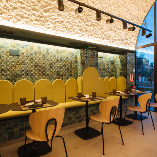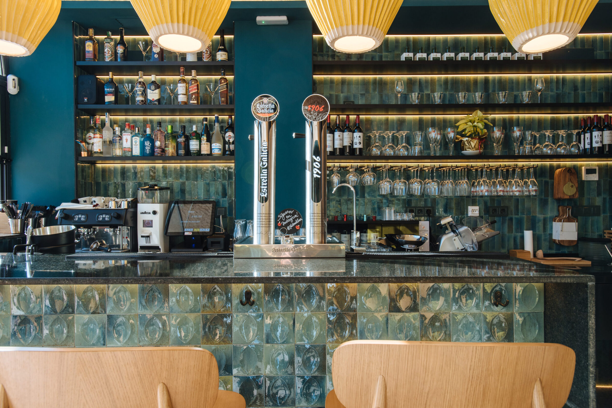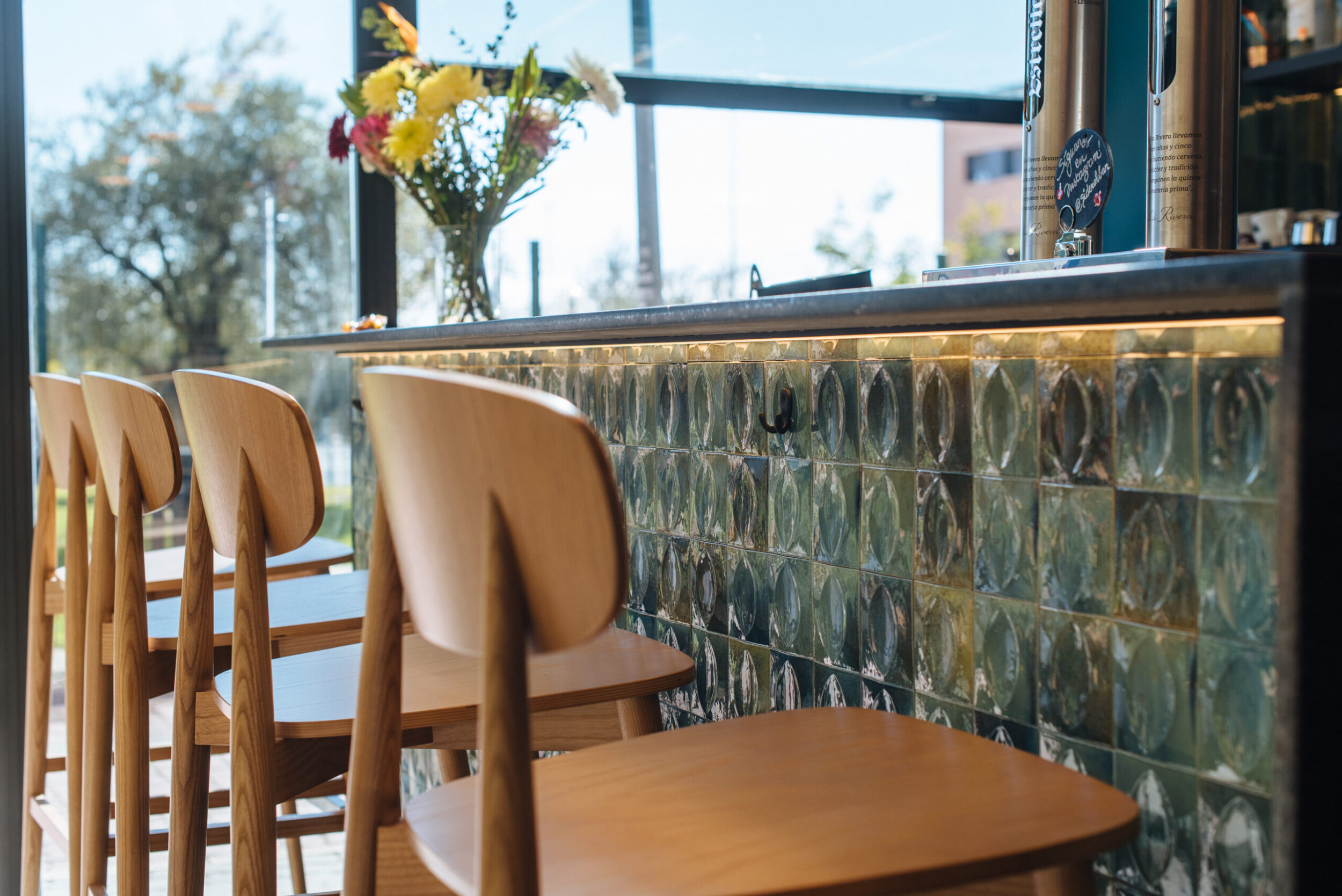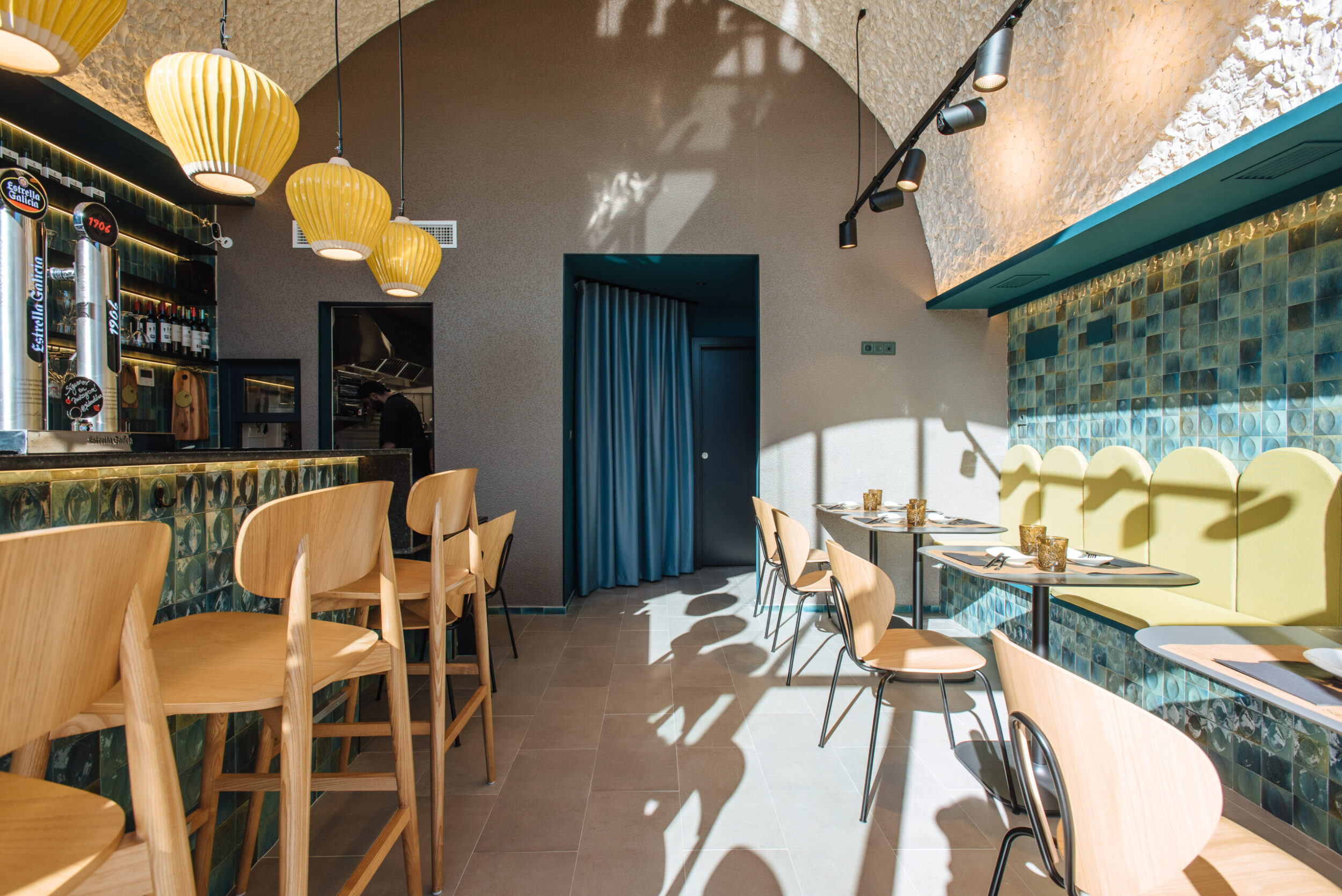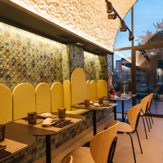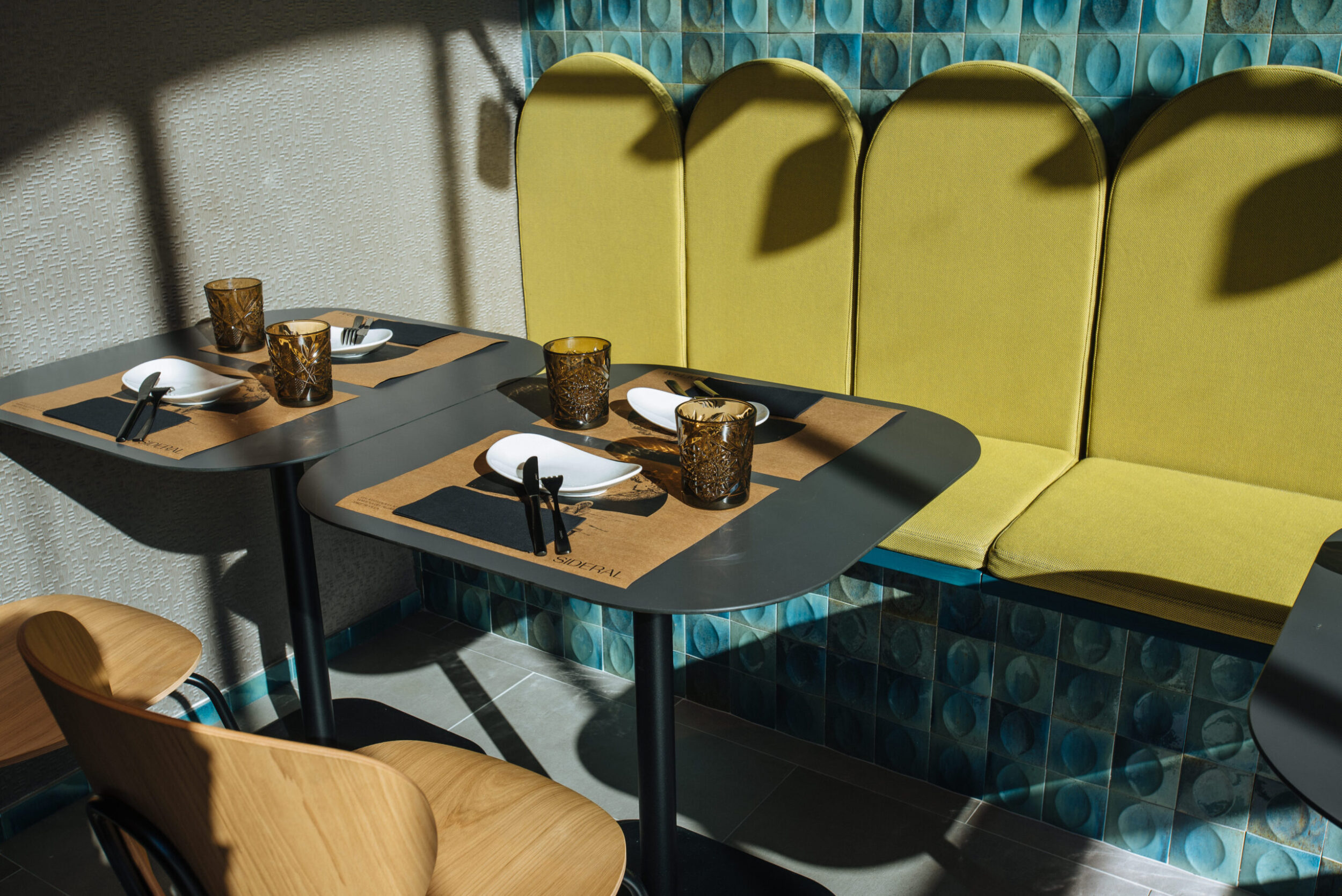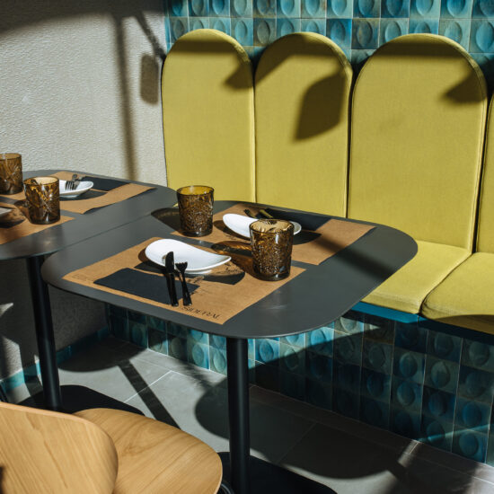 Les concepteurs ont choisi Gleeze Turchese finition brillante dans la version 7×20 cm pour les niches du bar et Gleeze structure Egg, également Turchese, format 10×10 cm pour sublimer la surface du comptoir principal et du mur de la zone restauration. Les reflets produits sur les carreaux concaves et convexes Egg effet brillant du comptoir du bar multiplient les jeux de lumière et exaltent la texture des surfaces verticales.