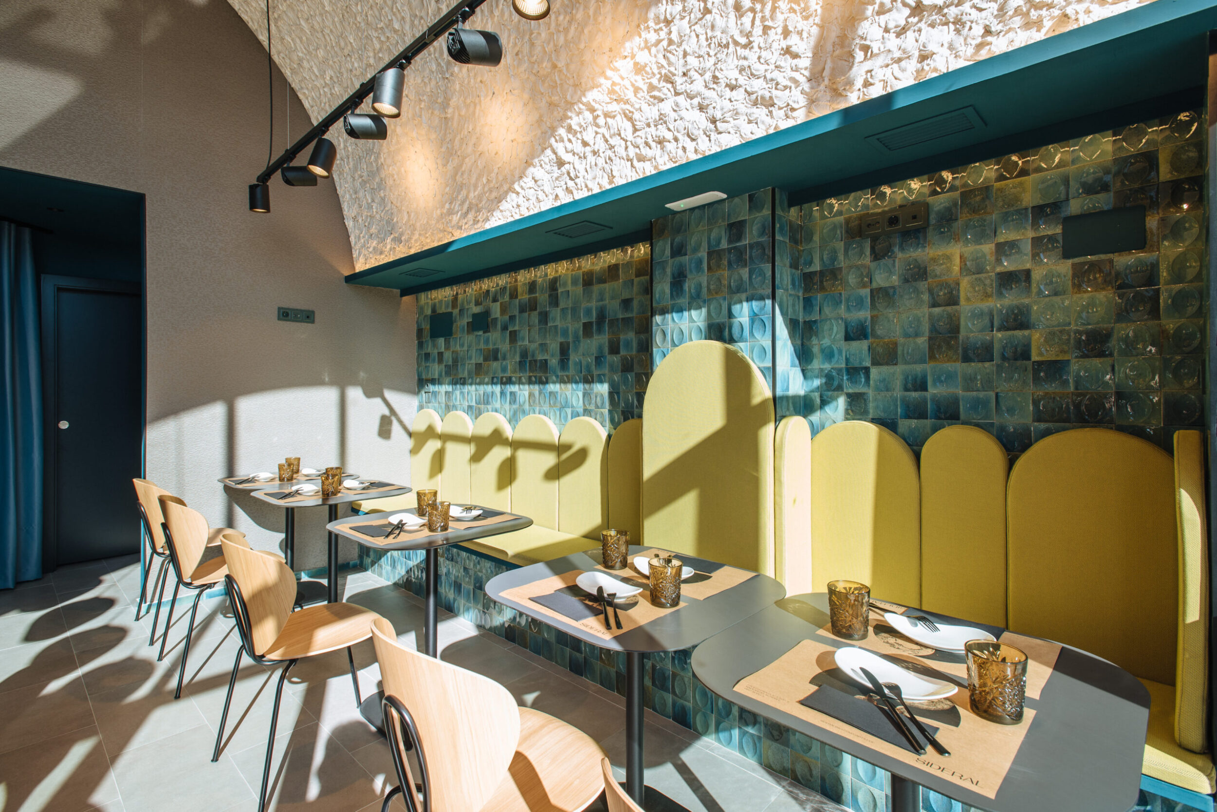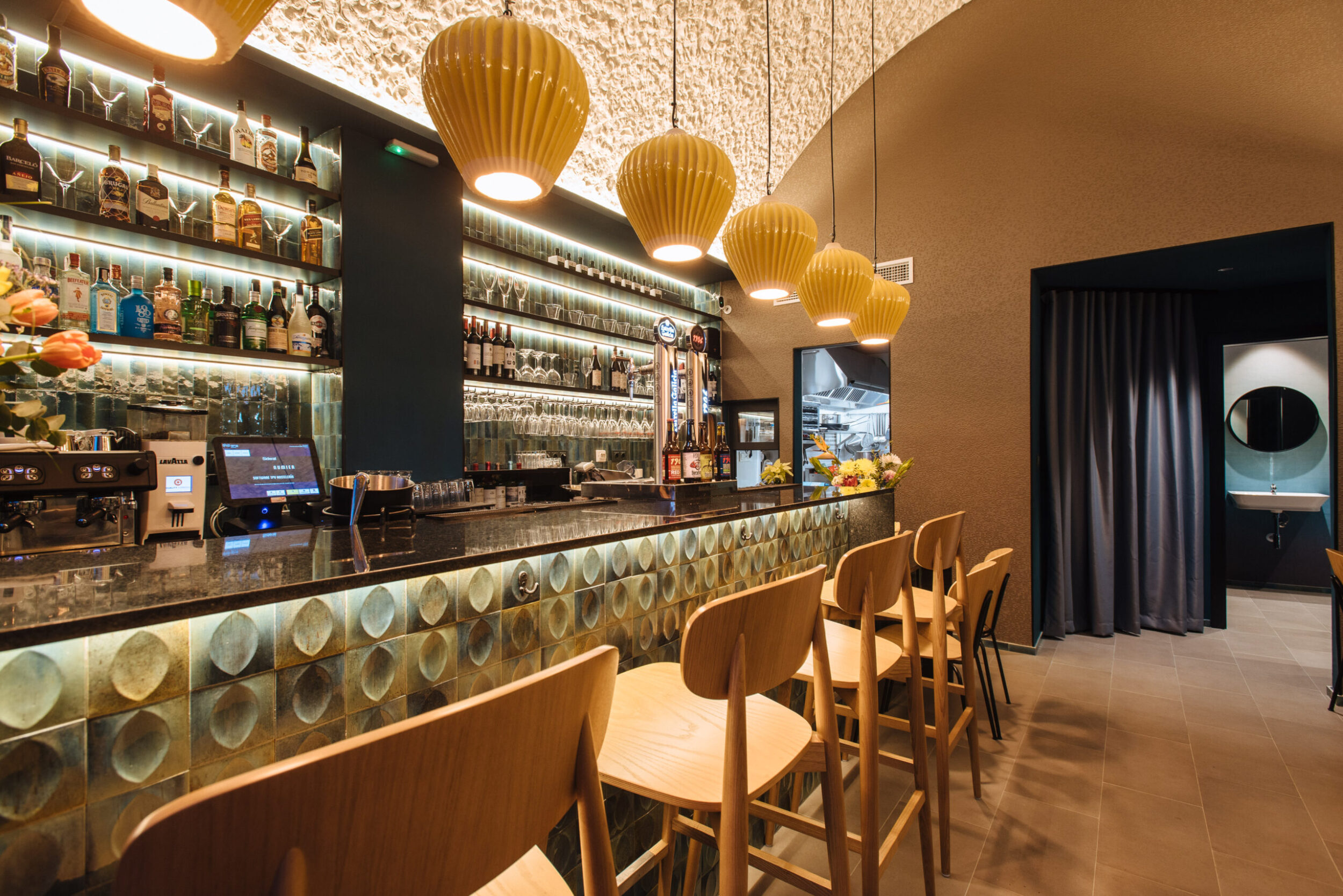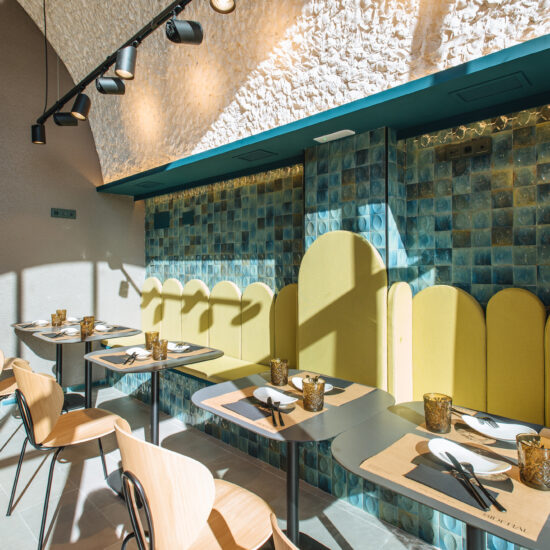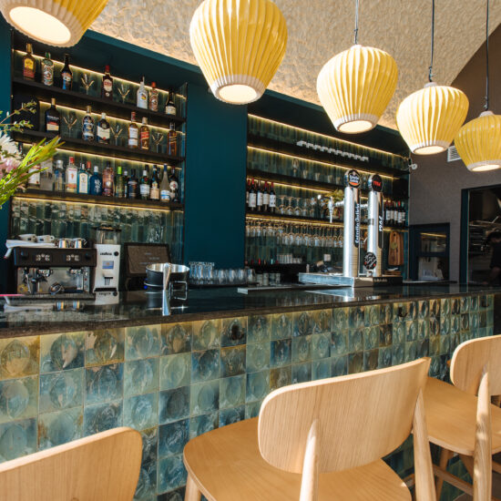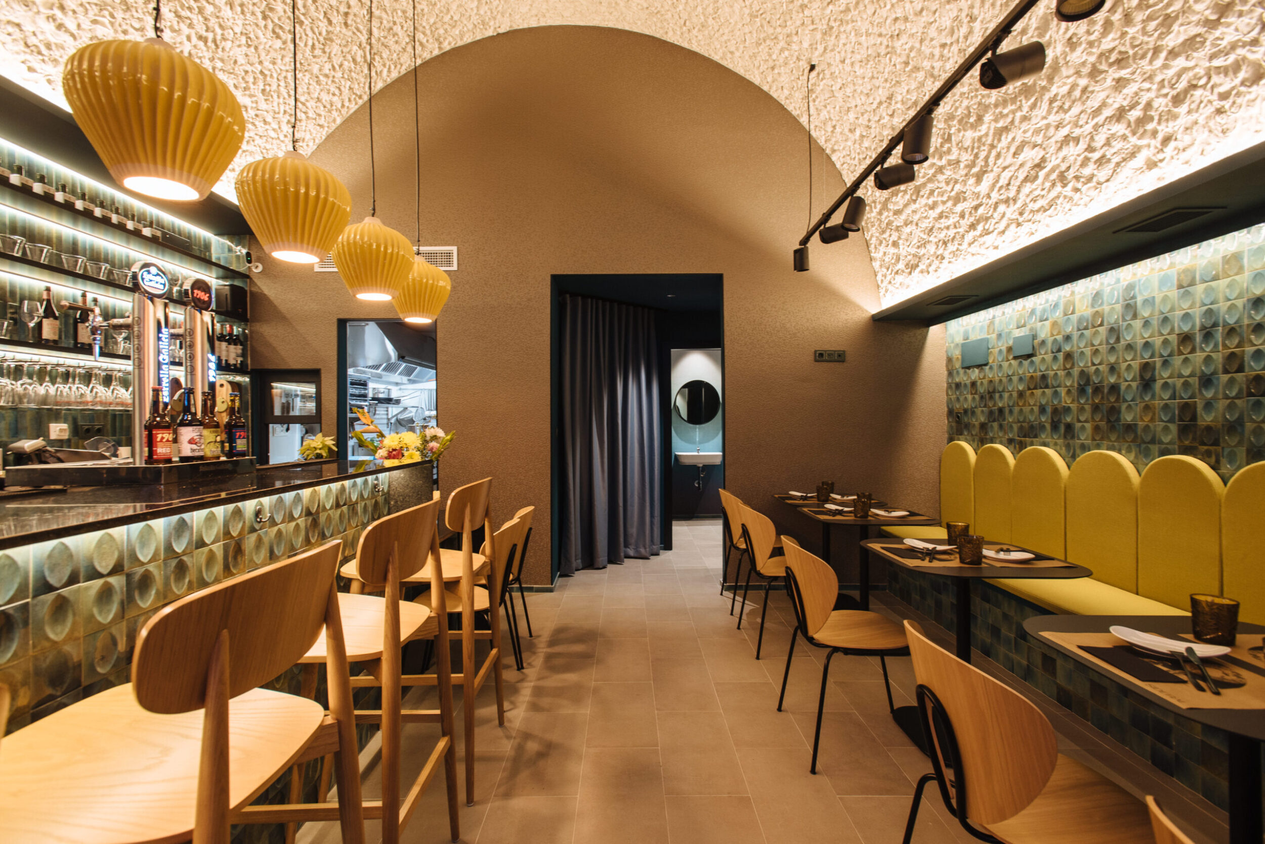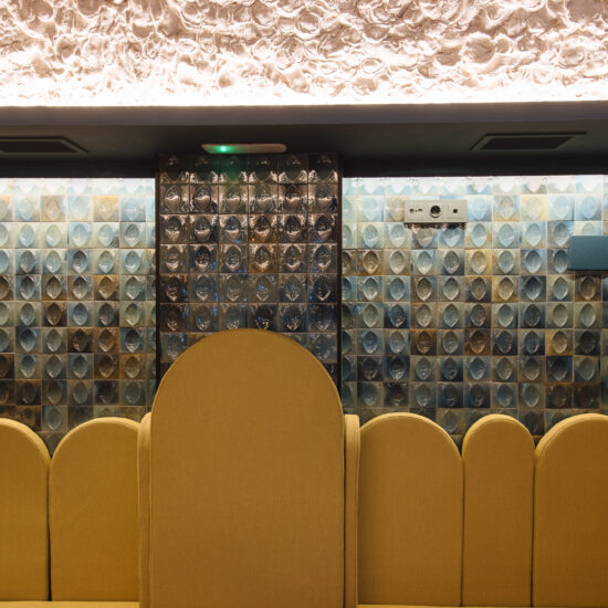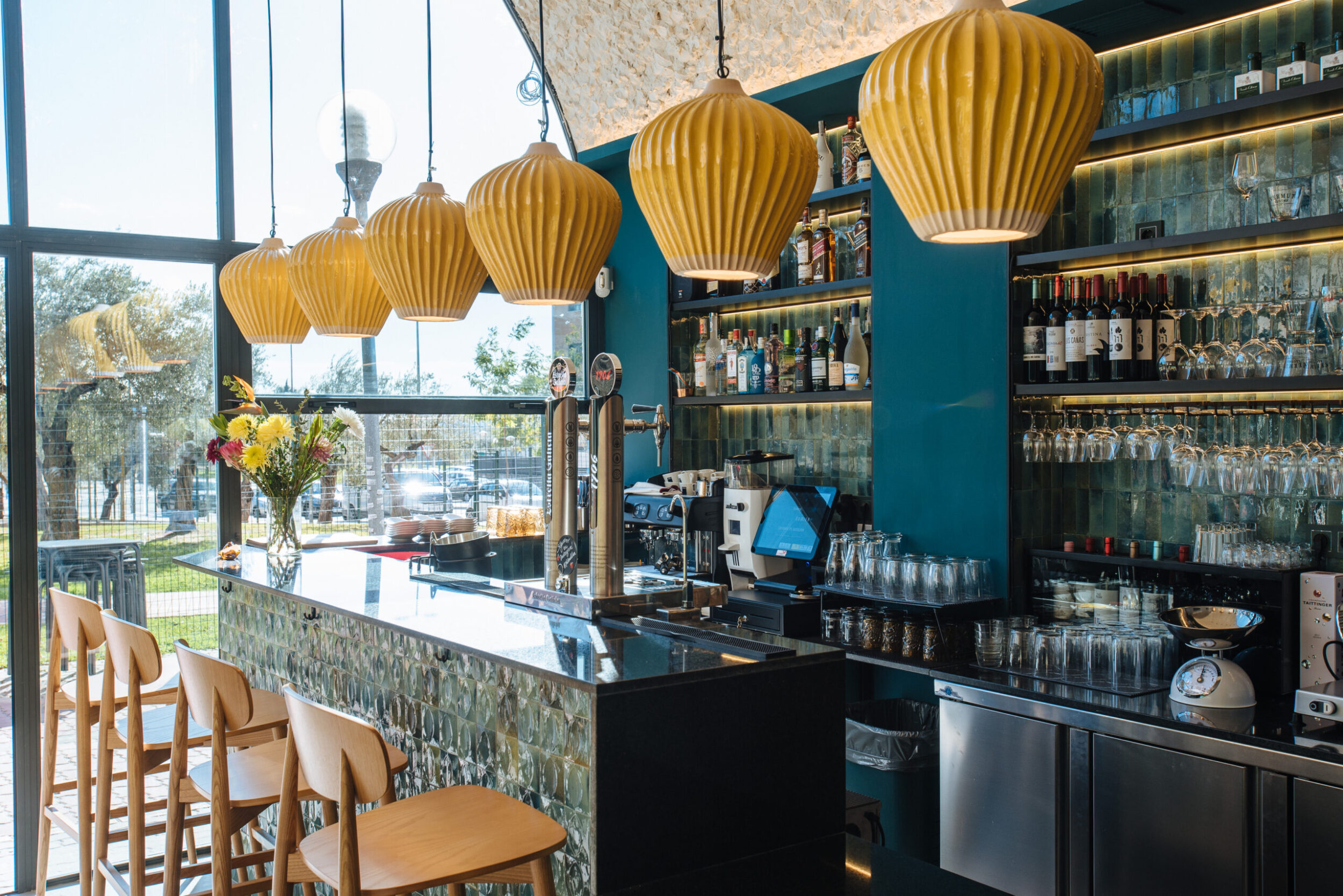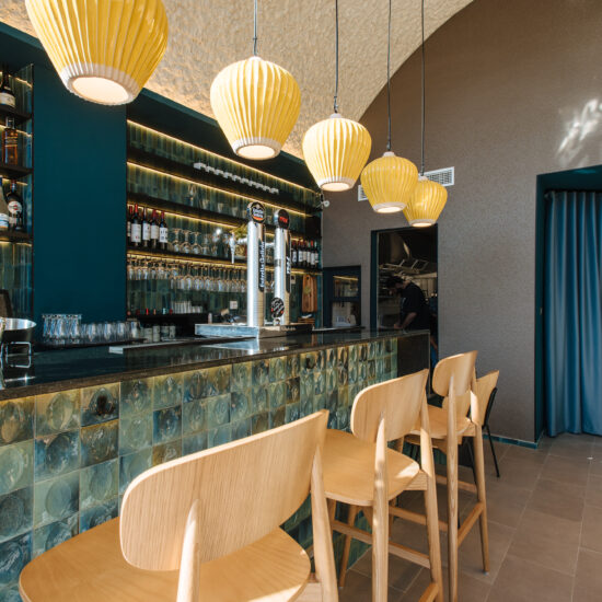Les concepteurs ont choisi Gleeze Turchese finition brillante dans la version 7×20 cm pour les niches du bar et Gleeze structure Egg, également Turchese, format 10×10 cm pour sublimer la surface du comptoir principal et du mur de la zone restauration. Les reflets produits sur les carreaux concaves et convexes Egg effet brillant du comptoir du bar multiplient les jeux de lumière et exaltent la texture des surfaces verticales.