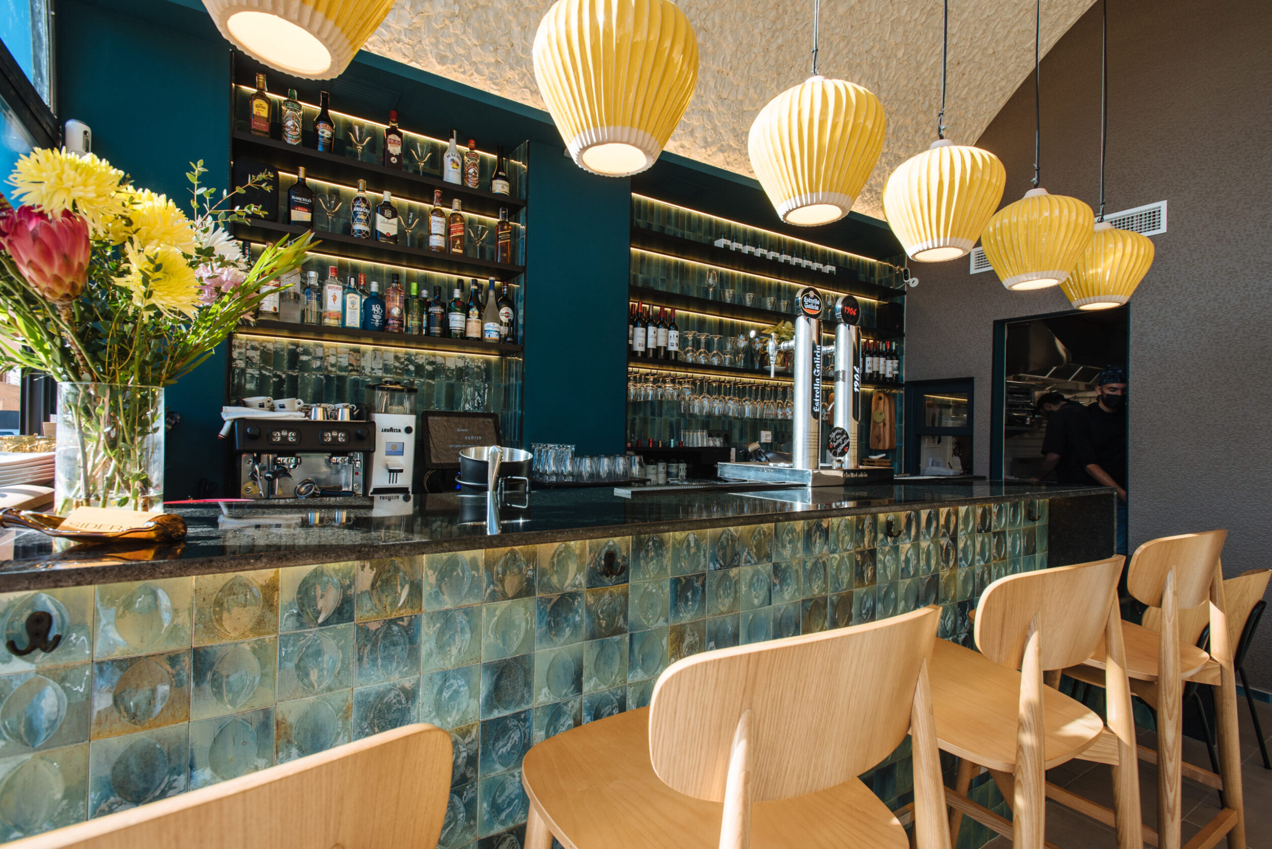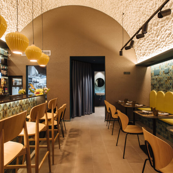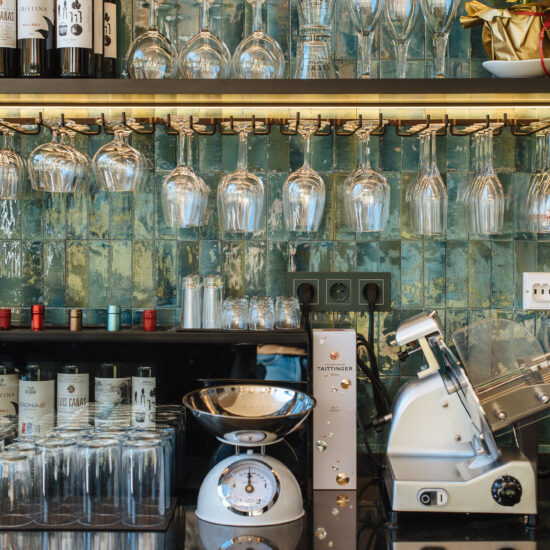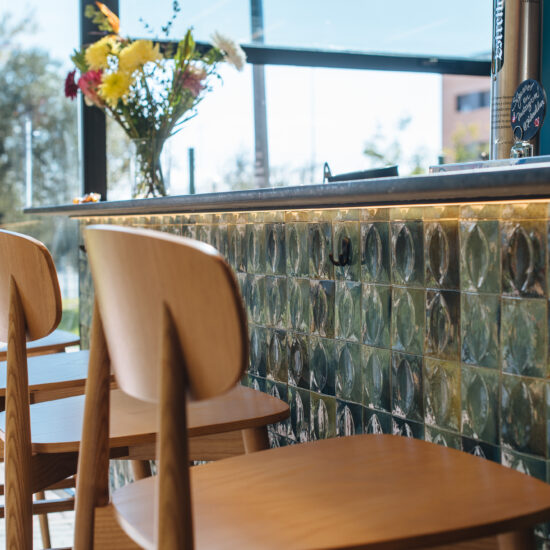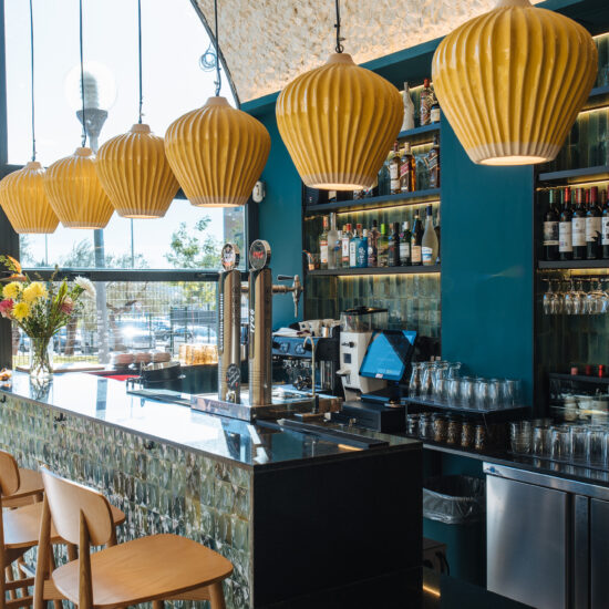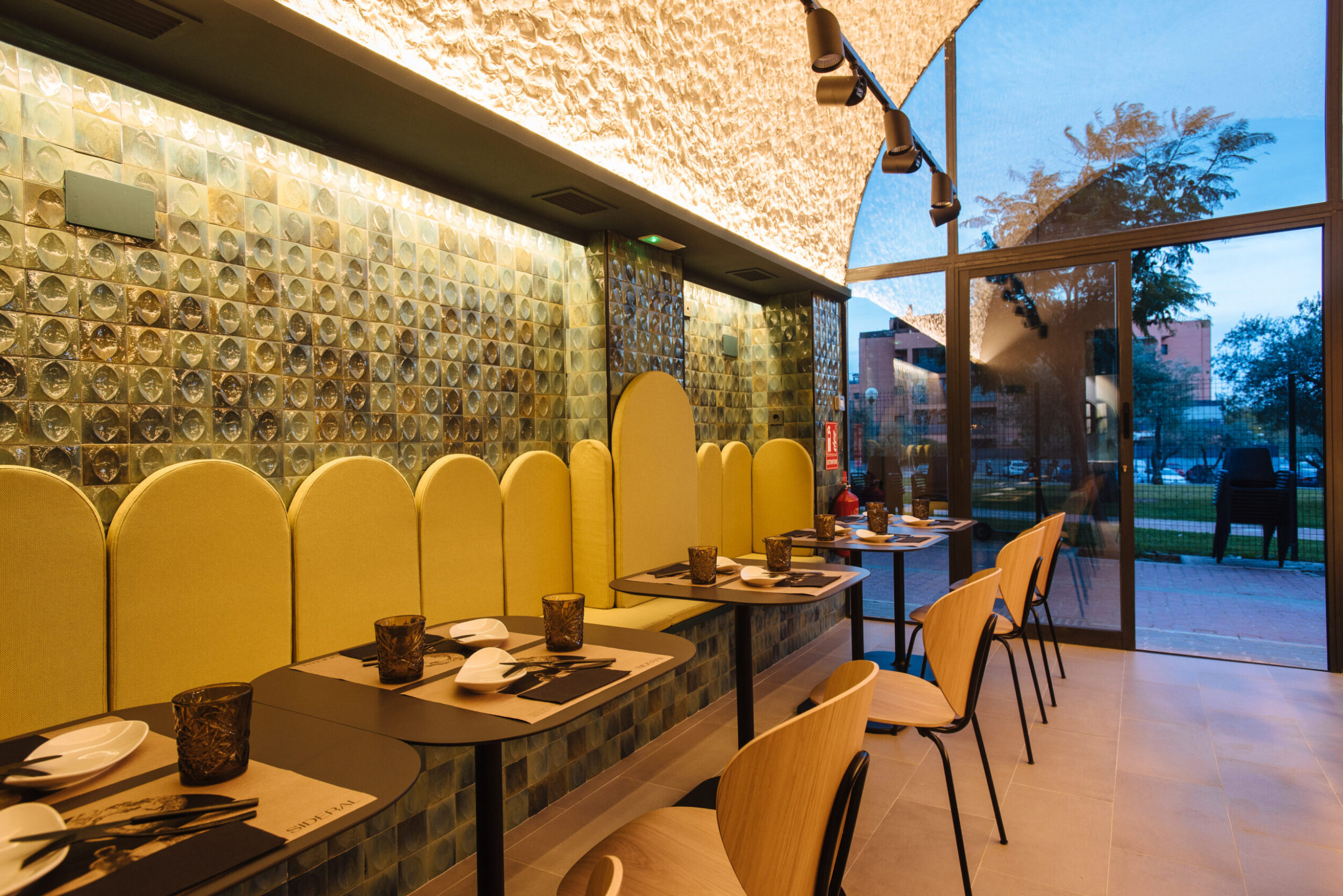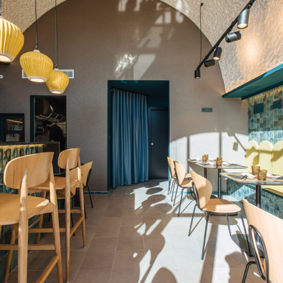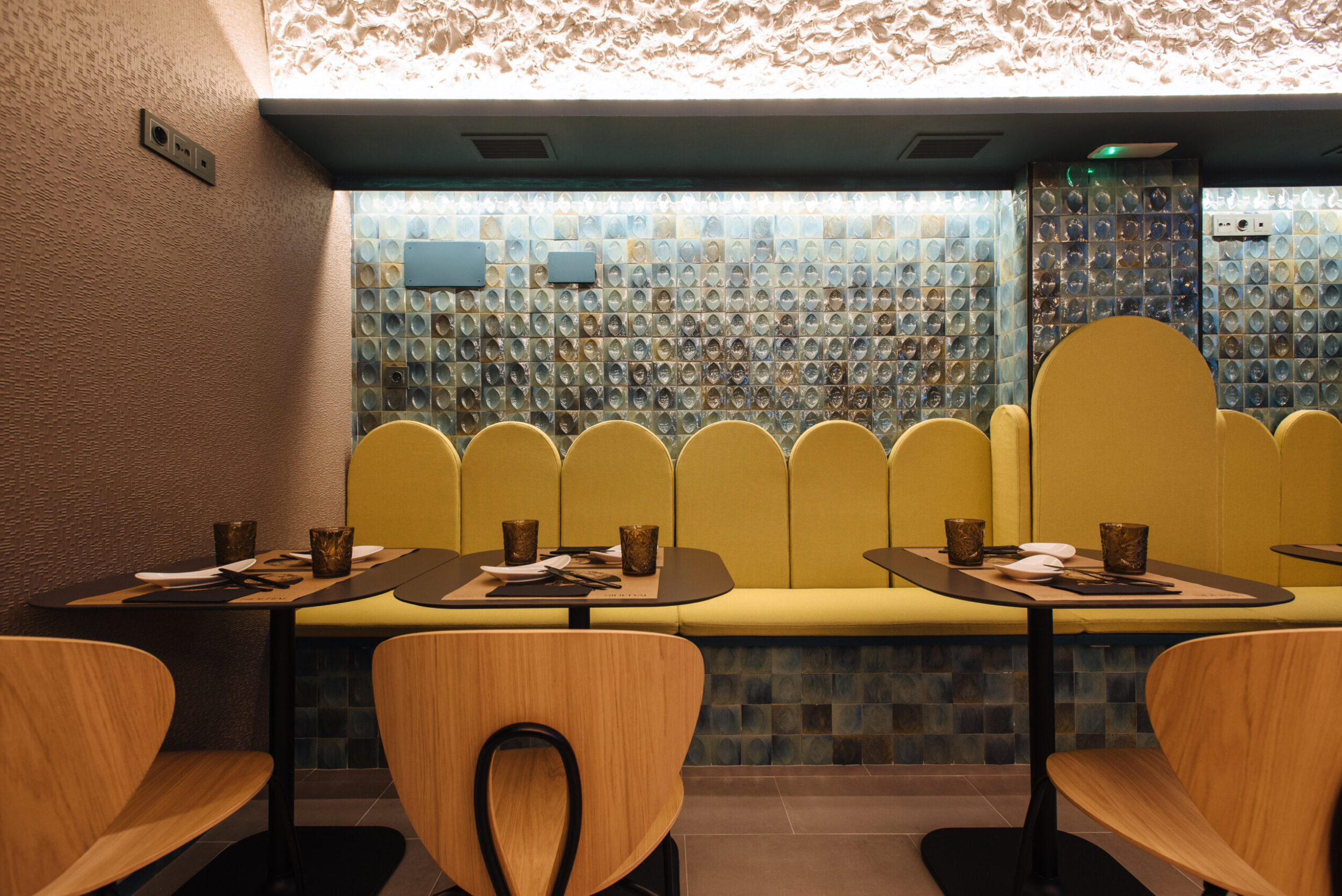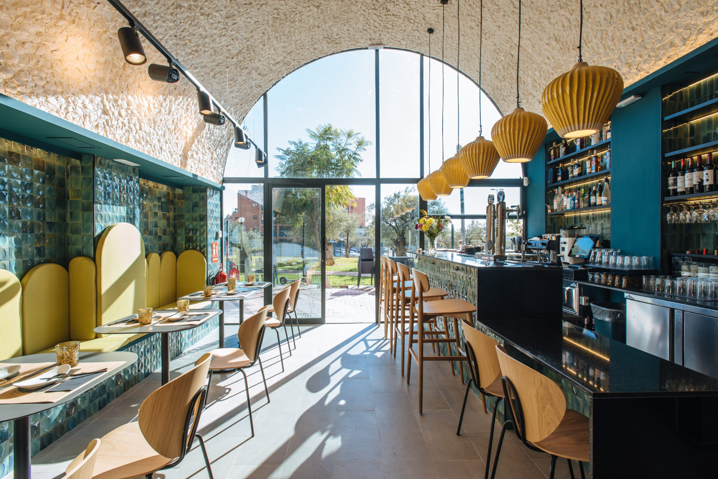 Les concepteurs ont choisi Gleeze Turchese finition brillante dans la version 7×20 cm pour les niches du bar et Gleeze structure Egg, également Turchese, format 10×10 cm pour sublimer la surface du comptoir principal et du mur de la zone restauration. Les reflets produits sur les carreaux concaves et convexes Egg effet brillant du comptoir du bar multiplient les jeux de lumière et exaltent la texture des surfaces verticales.