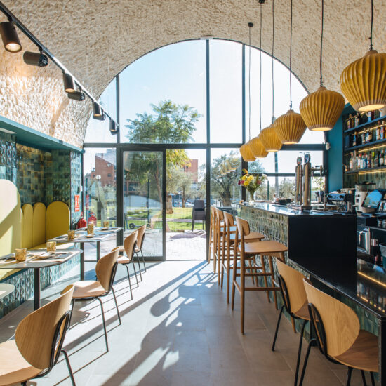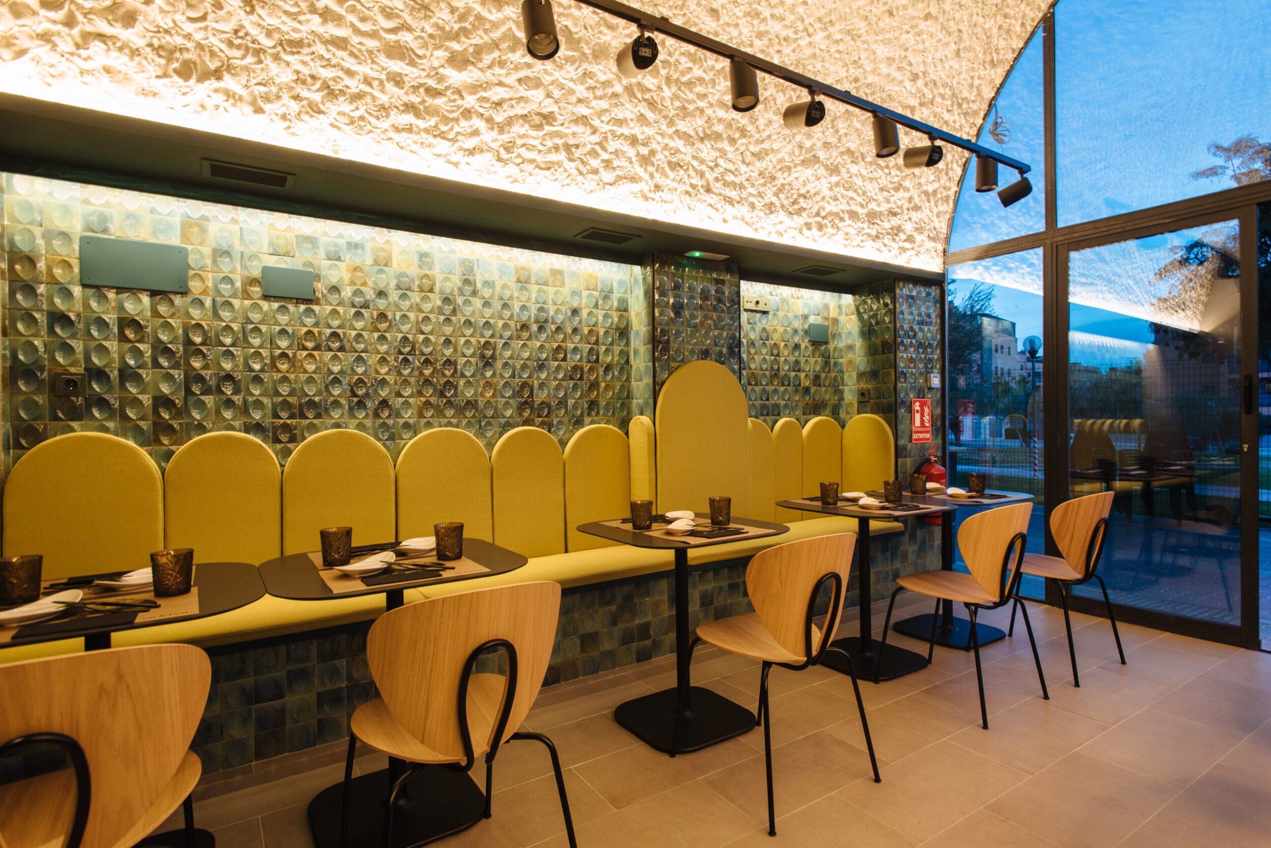 L'espace du restaurant s'articule, d'un côté, autour d'un coin bar et comptoir lounge, et, de l'autre, de petites tables avec banc continu et mobilier de style rétro.