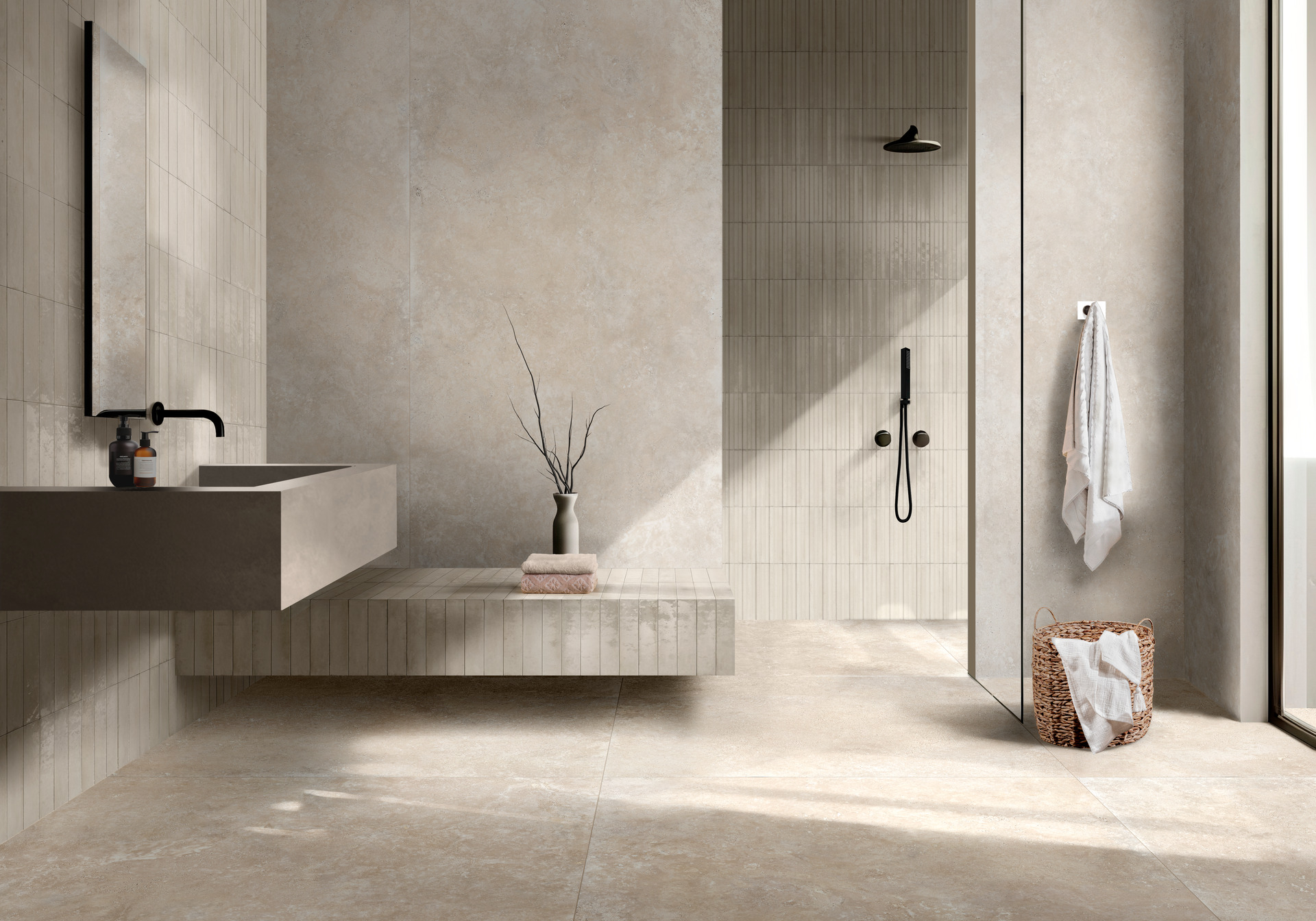 Les petits formats jouent de plus en plus avec des poses transversales à effets de matière. La collection Look s’illustre tout particulièrement lorsqu’elle est assortie à de nombreuses collections Ragno, comme les imitations pierre de Stoneplay, Realstone_Ceppo et Travertino Wall combinés à Realstone_Travertino, ou encore à l’imitation ciment plus neutre de Stratford, à l’imitation bois rustique d’Inedito, ou à l’élégant imitation marbre d’Incanto.