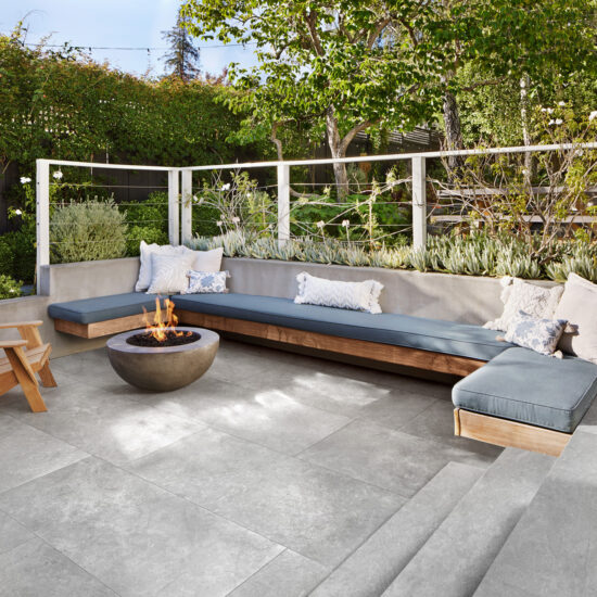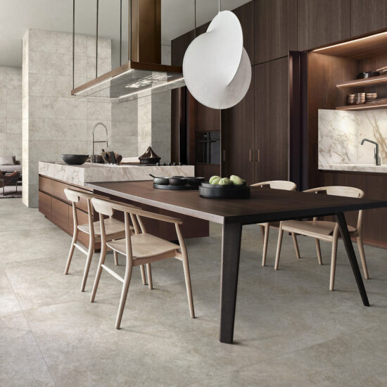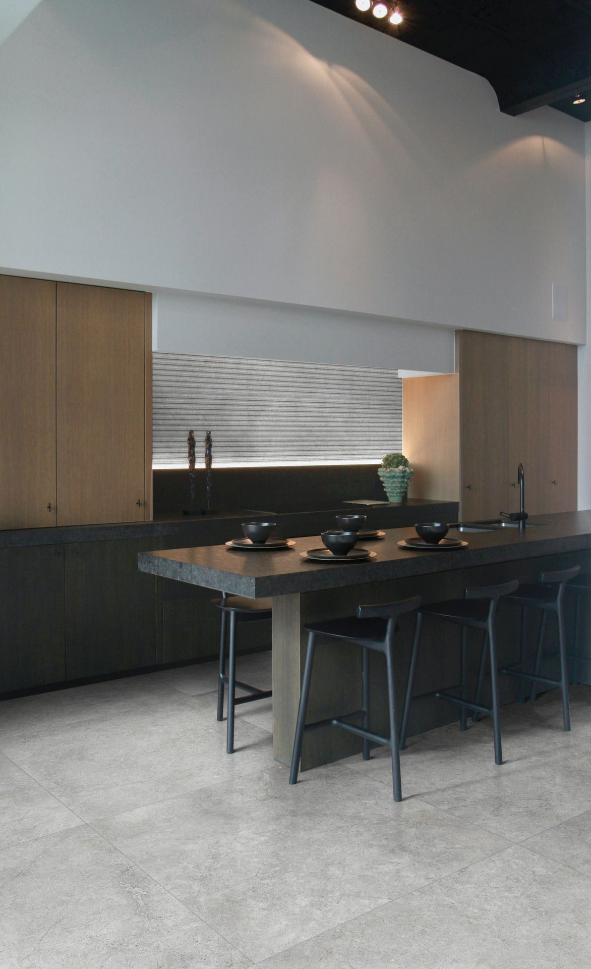 Richmond est une collection inspirée de l'esthétique de la pierre calcaire, composée de revêtements de sols et murs coordonnés les uns avec les autres permettant de créer une continuité visuelle entre espaces intérieur et extérieur.