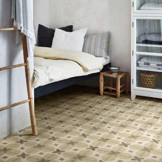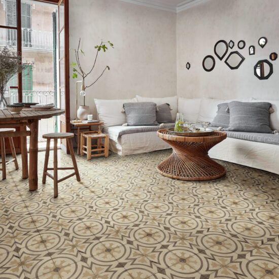 Chaque pièce, ramenée à la réalité du carreau 20×20 cm, révèle de près des détails précieux : bords volontairement imparfaits, couleurs intenses légèrement nuageux, surface mate naturelle agréable à l'œil et au toucher. L'expérience de la surface céramique se fait enveloppante et intense, aussi unique que la maison qui l'accueille.