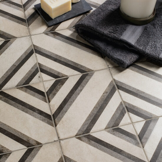 Plus loin, un peu à l'abri du soleil, un motif fait de géométrie et de matière révèle ses couleurs : Cobalto, Ocra, Cadmio, Pomice, denses et évocatrices dès la lecture de leur nom. Avec Ambra, Basalto, Terra et Talco, il construit, carreau après carreau, l'abaque évocateur et profondément fécond de la collection Ottocento, qui fait partie du recueil Storie, auquel il apporte une interprétation moderne de la tradition.