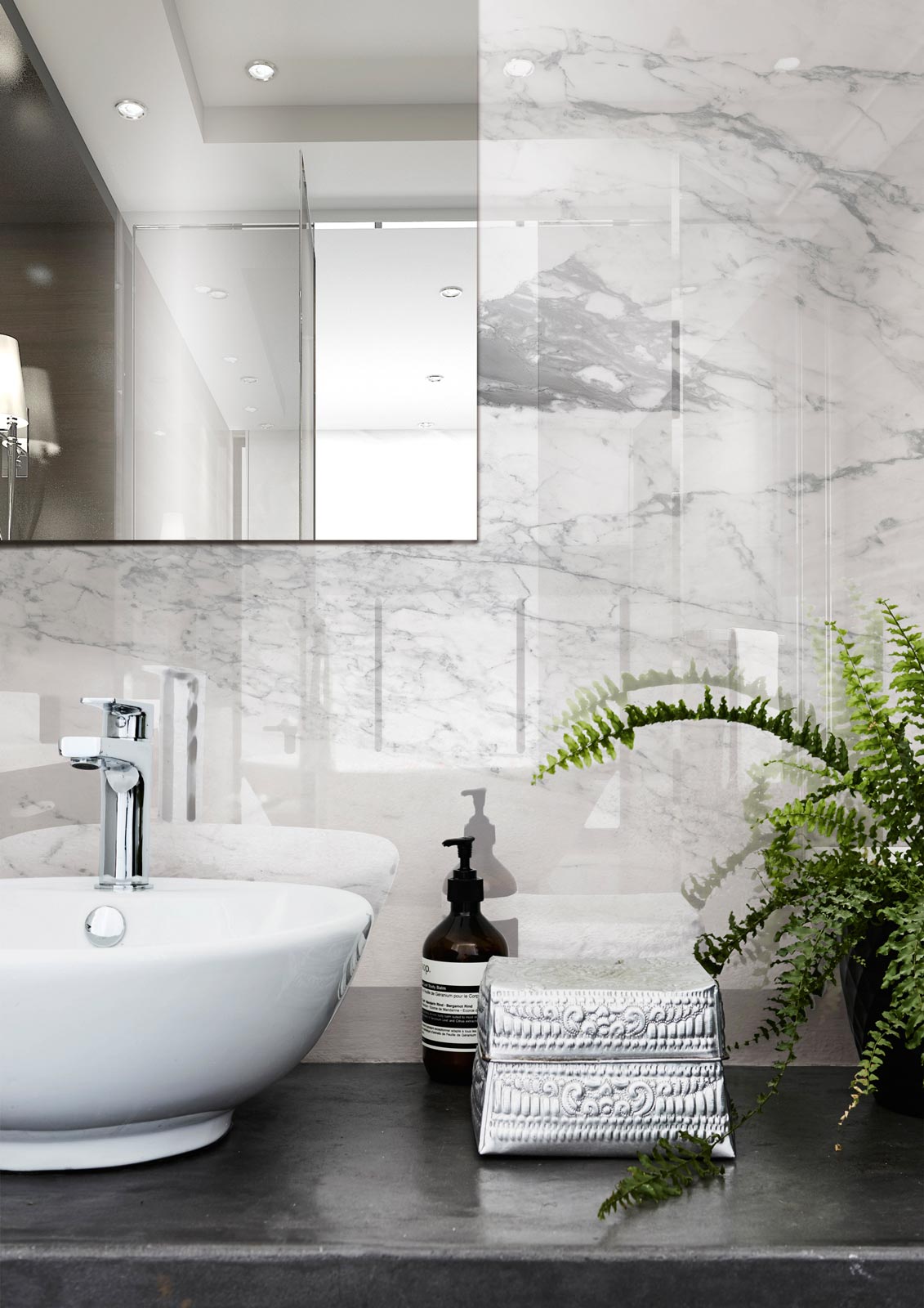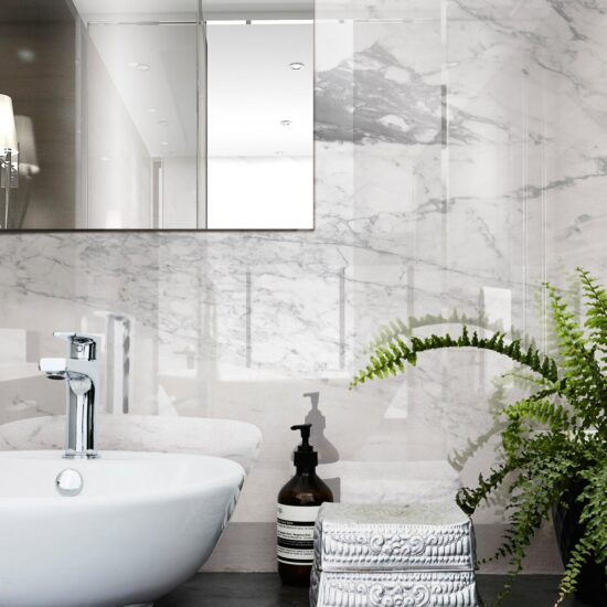 Par ailleurs, la possibilité de travailler facilement les dalles, d'effectuer des coupes et des façonnages sur mesure et de percer des trous permet de revêtir la surface des meubles fixes et mobiles de l'effet marbre : la résistance et les performances technologiques du matériau ne s'en trouvent nullement compromises, sa valeur et sa facilité d'utilisation étant au contraire sublimées.