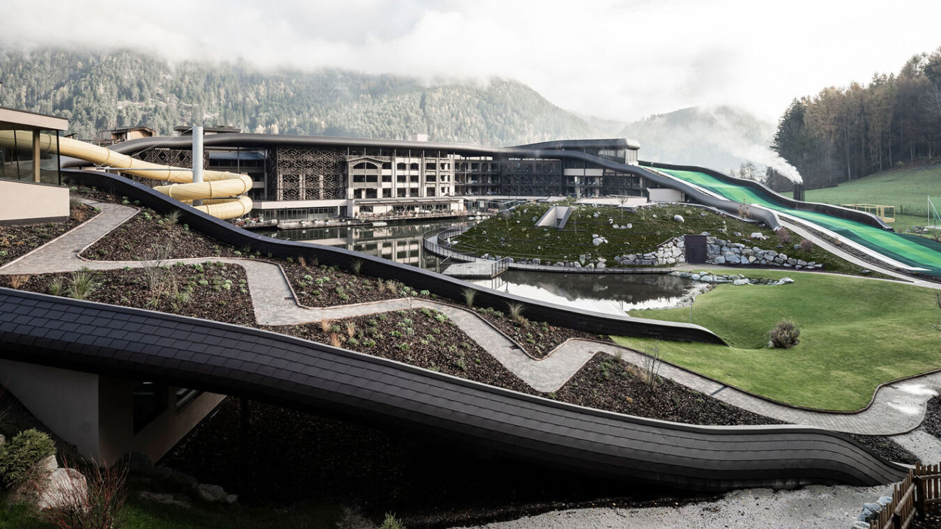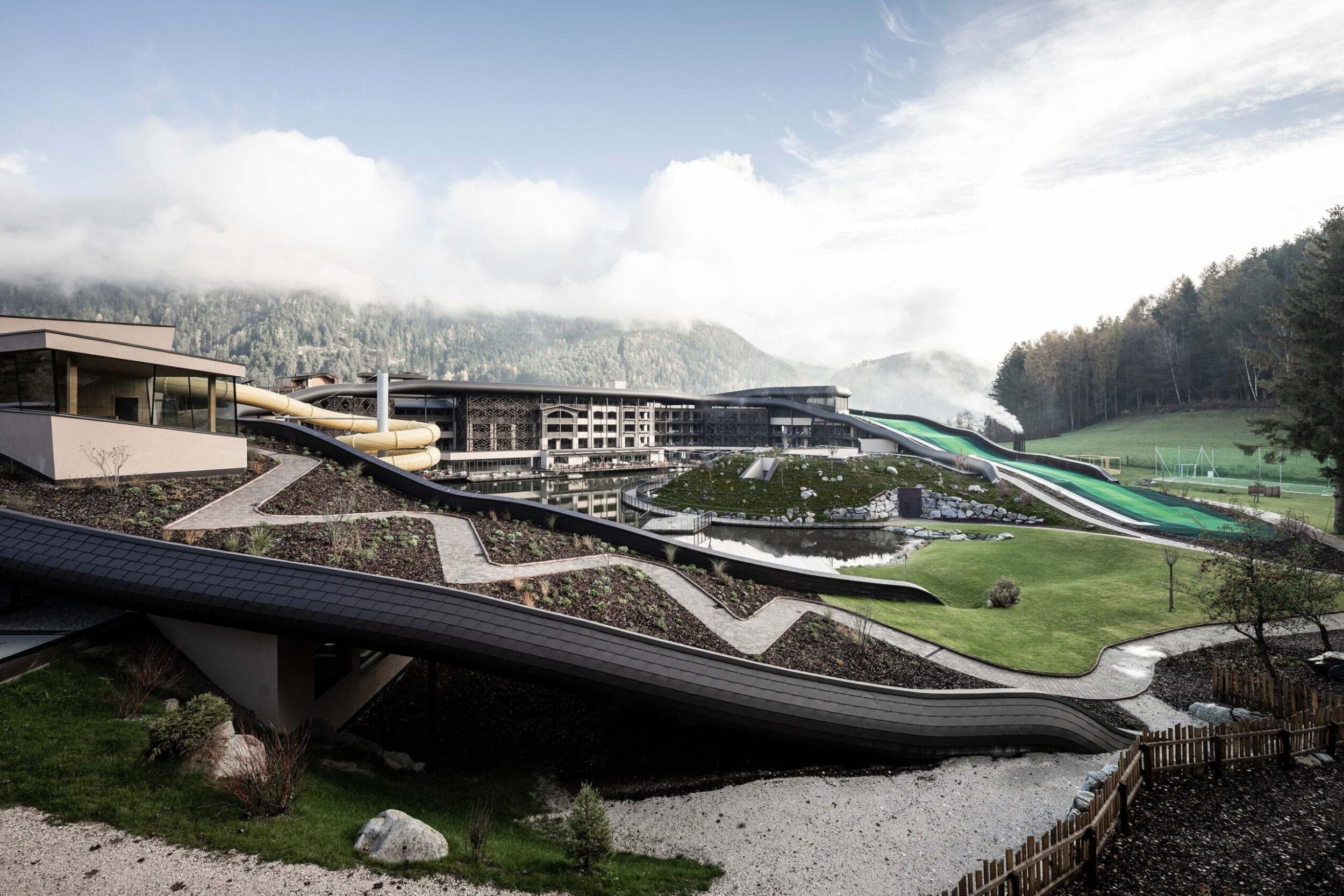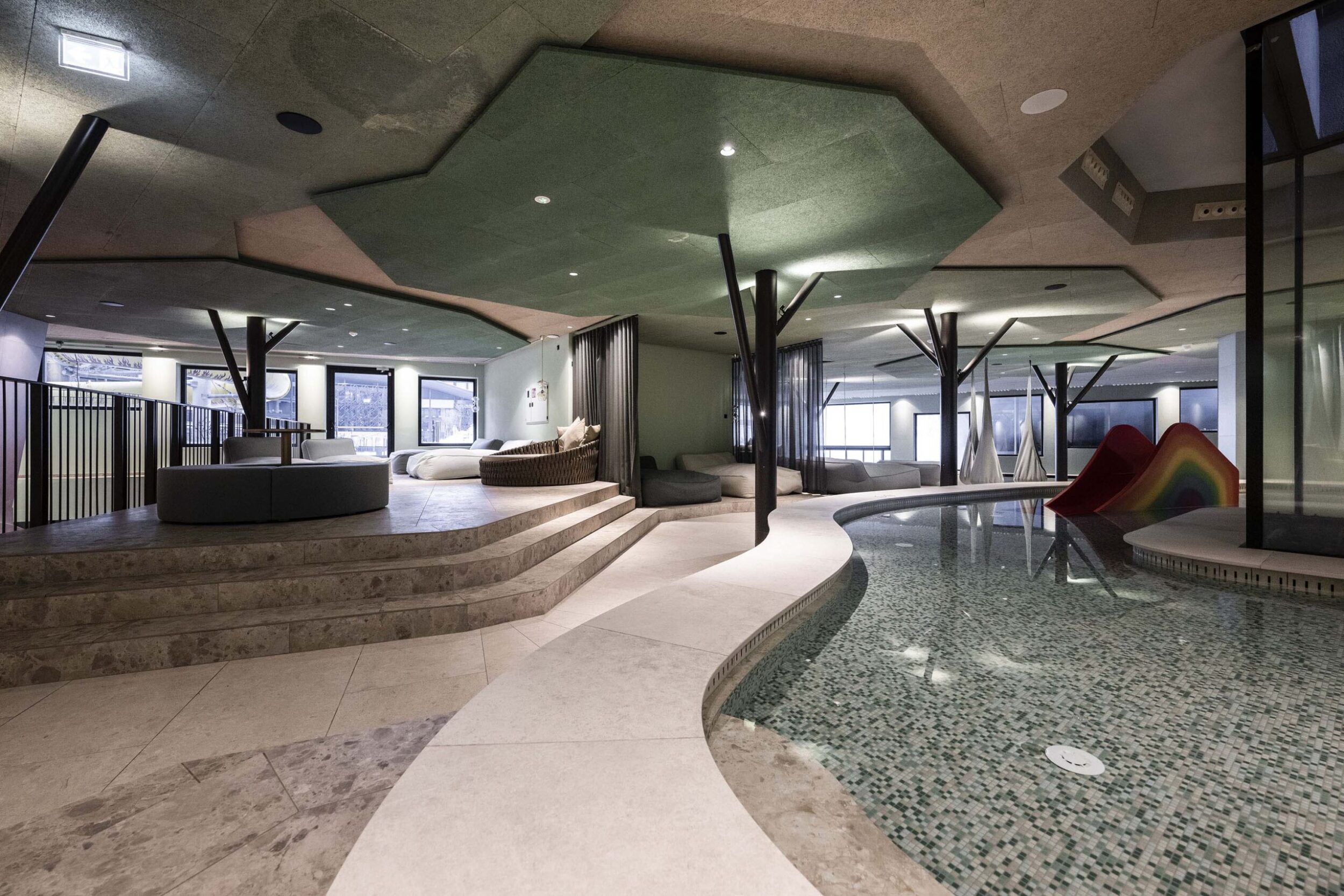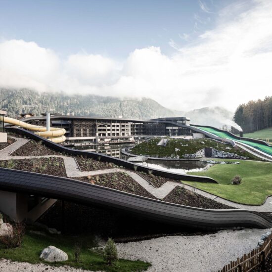 Nous comptons sur les doigts d'une seule main les bureaux qui, comme Noa – l'un des plus connus pour l'architecture montagnarde – savent interpréter une pluralité d'âmes et envies. Une fois de plus, ses architectes font preuve d'un grand naturel – et dans ce cas, même en s'amusant plutôt bien – pour requalifier l'illustre Falkensteiner Family Resort Lido à Casteldarne, en Val Pusteria, spécialisé dans les séjours de familles avec enfants, dont les propriétaires – qui gèrent 30 structures hôtelières dans six pays limitrophes – avaient demandé l'agrandissement et l'ajout de fonctions, mais toujours sous le signe de leur vocation pour l'accueil.